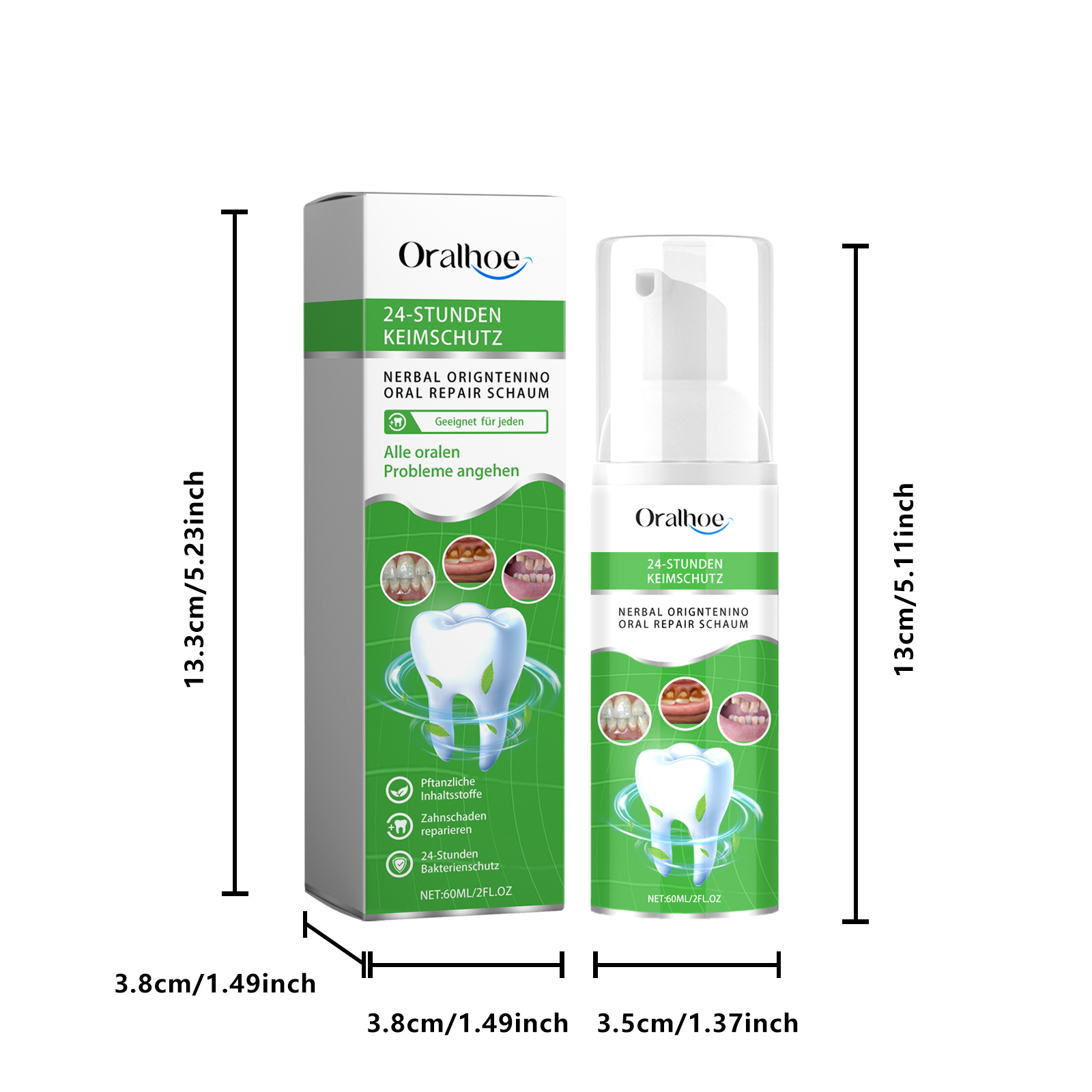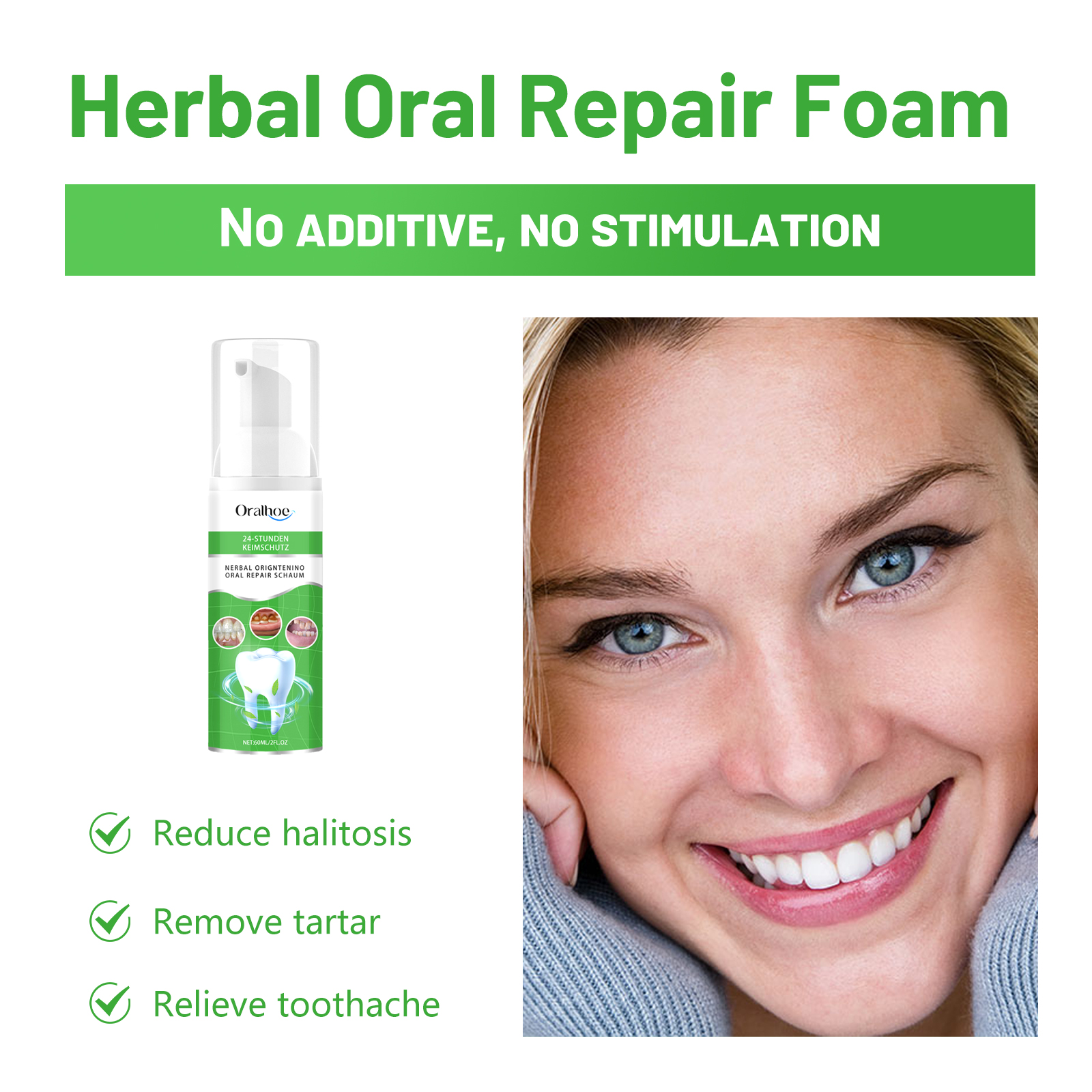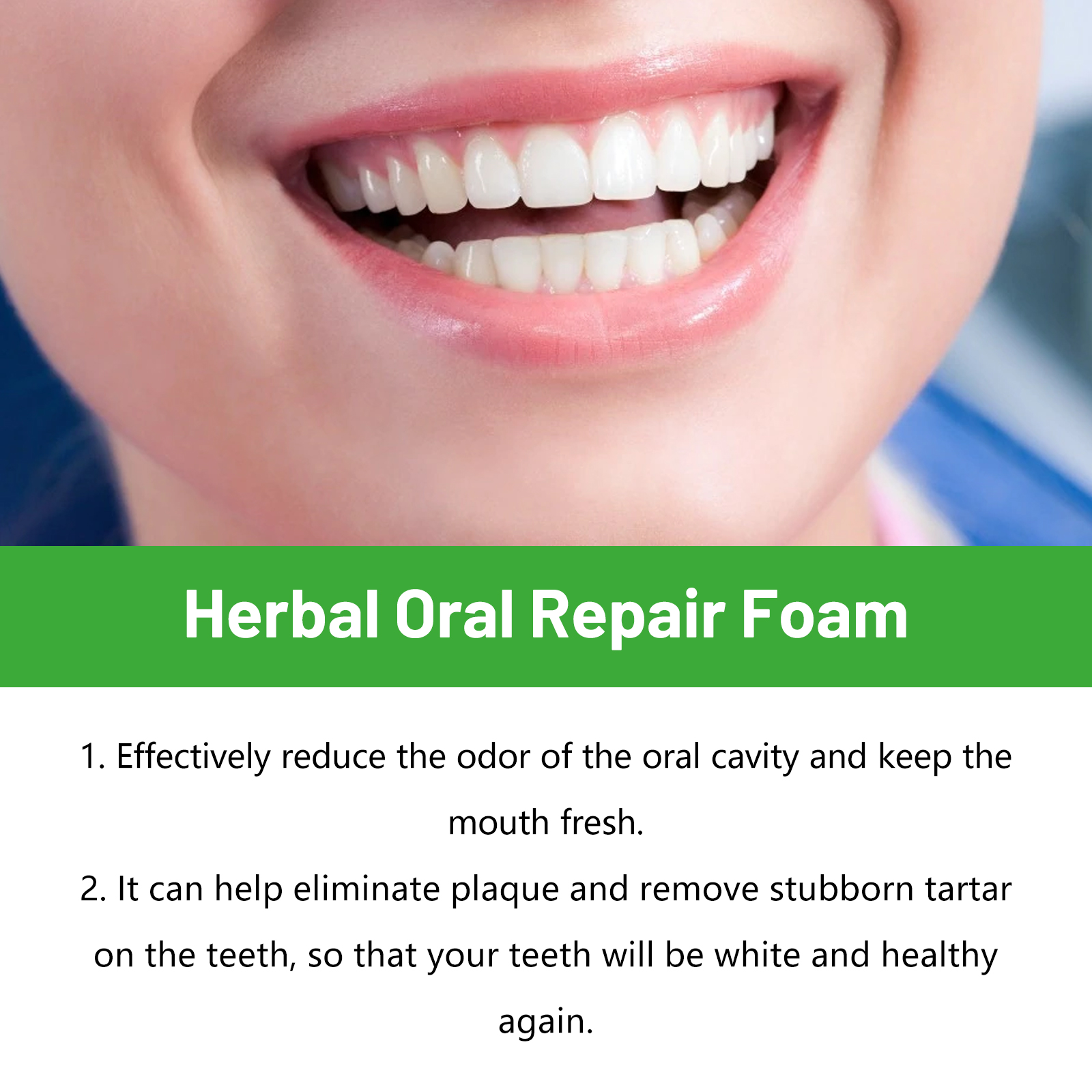 Our Herbal Oral Repair Foam contains garlic extract, propolis extract, peppermint extract. It can effectively reduce bad breath, keep your mouth fresh, help eliminate plaque, remove stubborn tartar from your teeth, and keep your teeth white and healthy. Its use is very simple: shake the bottle before use to get the best results, press the nozzle 1-2 times, spray directly into the mouth, rinse with foam, and spit it out after 30-60 seconds. It freshens breath and removes stubborn tartar and yellow stains.