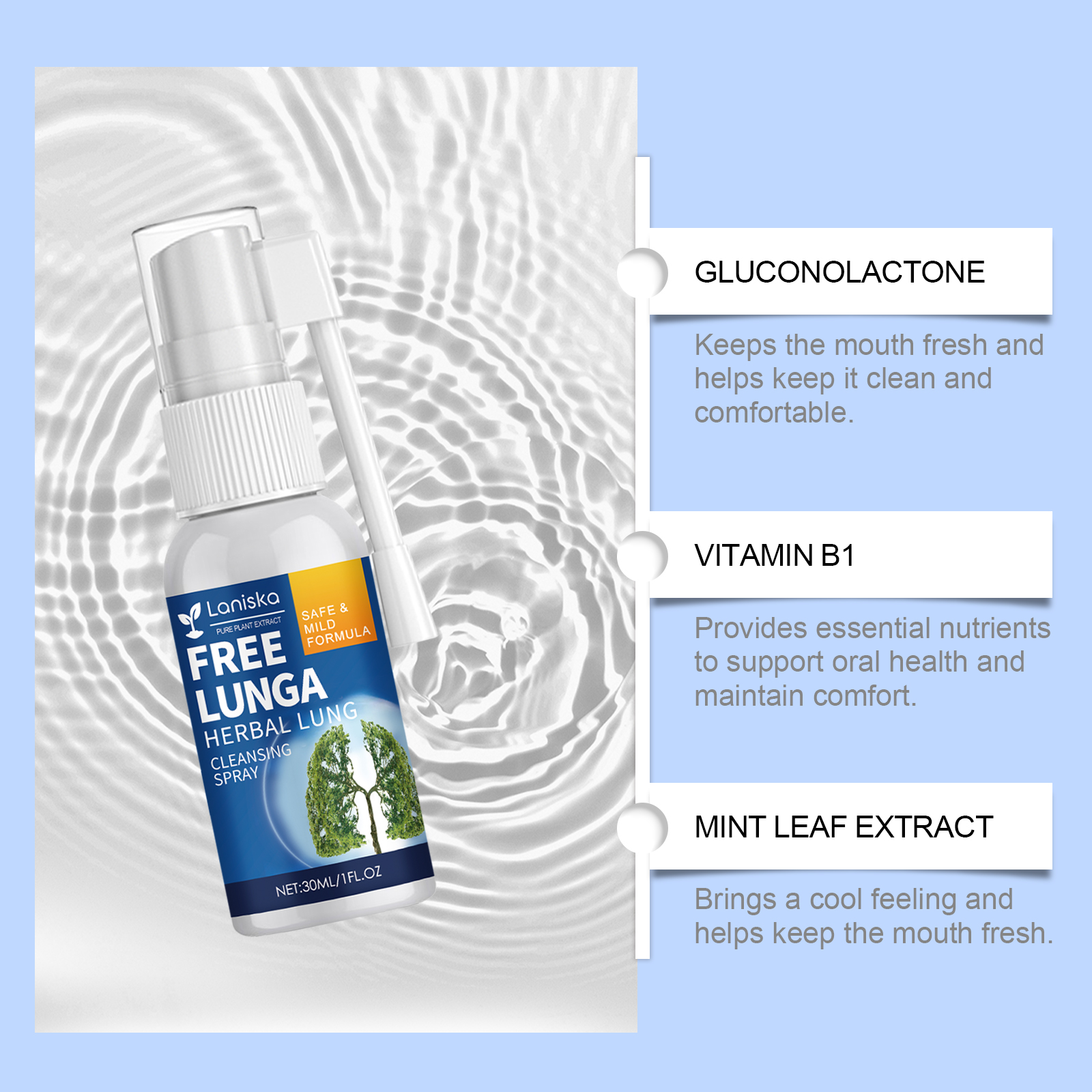 Our herbal spray contains glucose, vitamin B12 and peppermint leaf extract. It can effectively clear mucus from the respiratory tract and help improve respiratory function. Breathe easier. By cleaning the respiratory tract, it works quickly and improves the discomfort caused by mucus buildup. Its use method is very simple: 1. Shake the product to ensure internal uniformity. Mix ingredients well. 2. Point the nozzle at the mouth, gently press the nozzle, and spray 2-3 times; 3. Inhale and breathe slowly, allowing the spray ingredients to stay in your lungs for a while. Suitable for long-term use, help maintain respiratory health, reduce the impact of external environment on respiratory tract.
