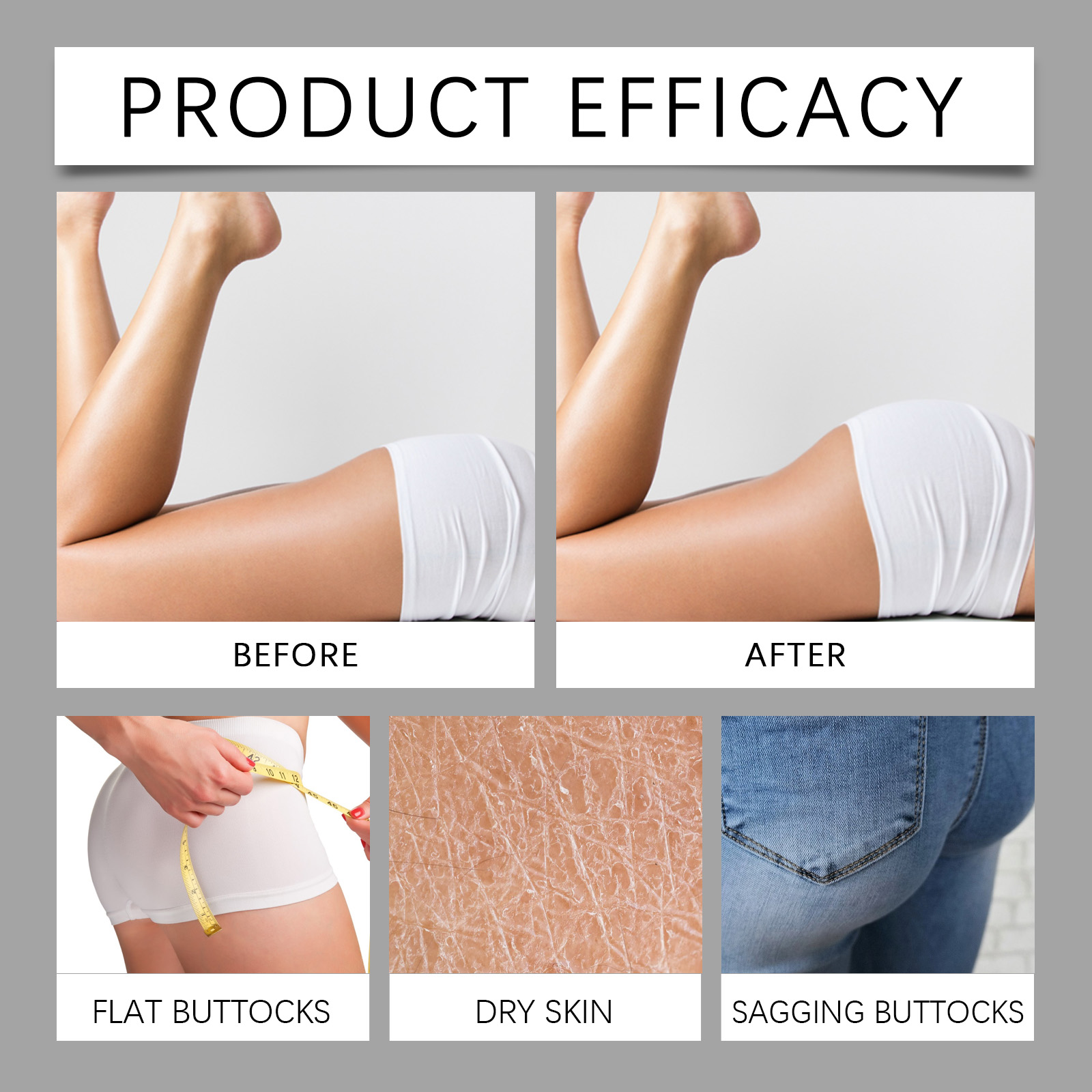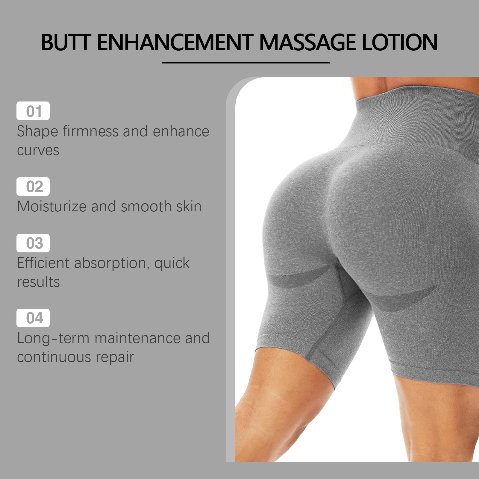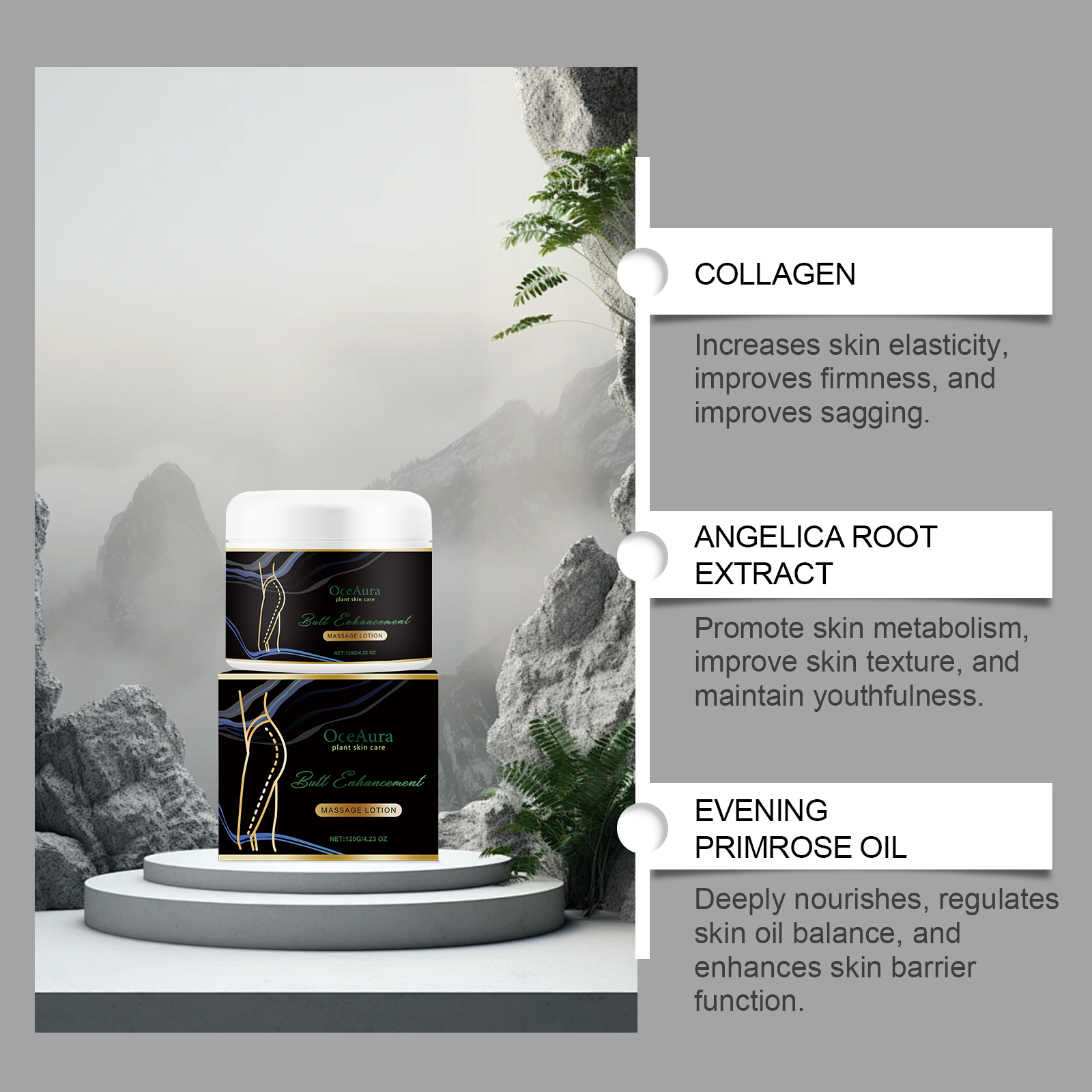 Our butt massage cream contains collagen, ginseng root extract, and Angelica root extract. It can increase skin elasticity, improve firmness, improve relaxation; Promote skin metabolism, improve skin quality, keep young. Deep nourishment, adjust skin oil balance, enhance skin barrier function. Its application method is simple: 1. Clean the buttock skin and keep it dry; 2. Apply appropriate amount of this product evenly on buttock skin; 3. Gently massage until completely absorbed. Designed for firm hips and improved curves; Deep moisture, leaves skin smooth and elastic.