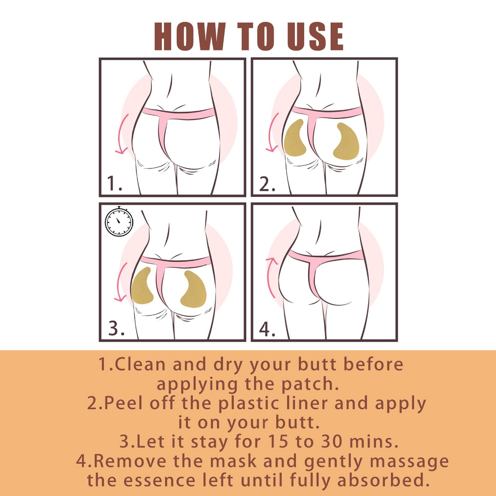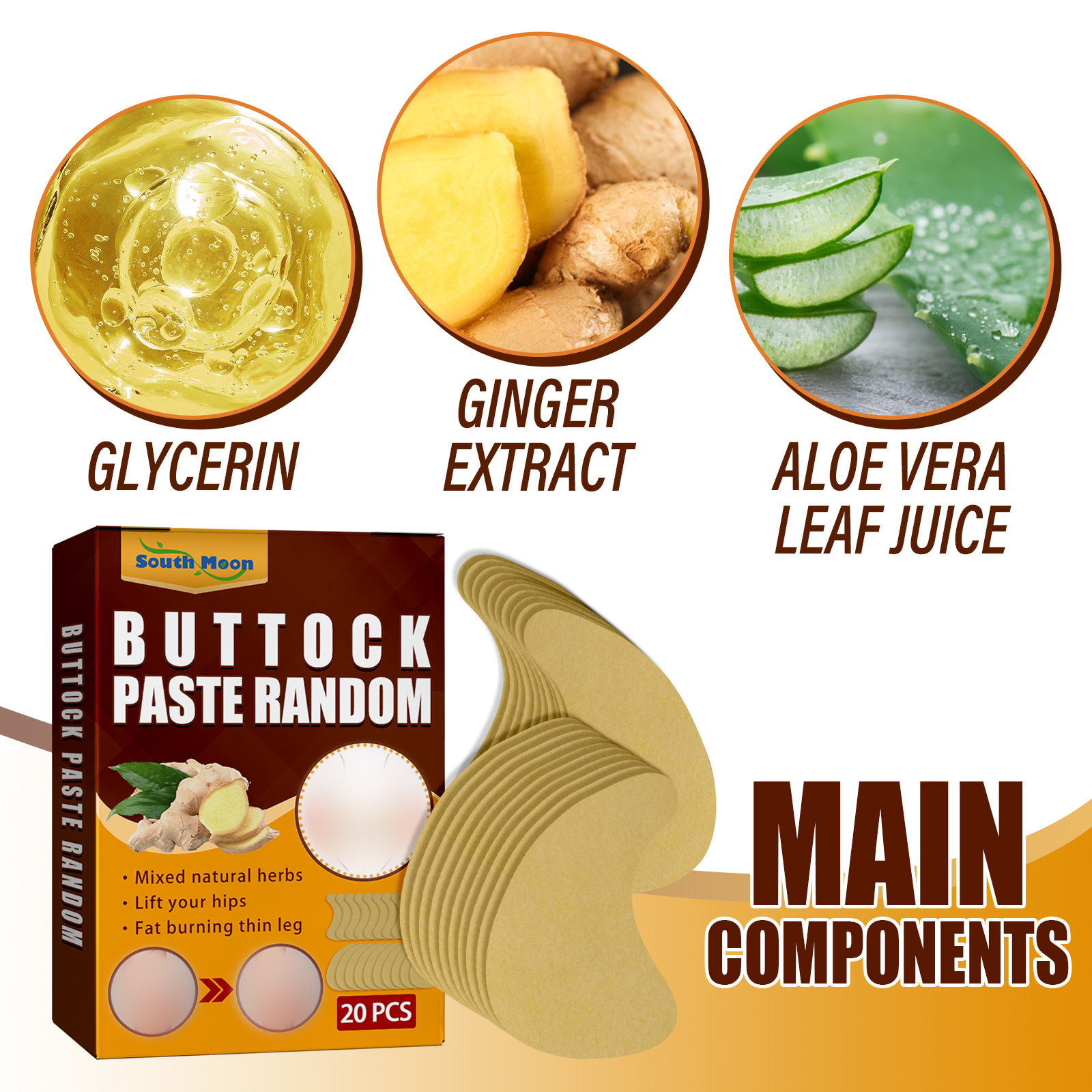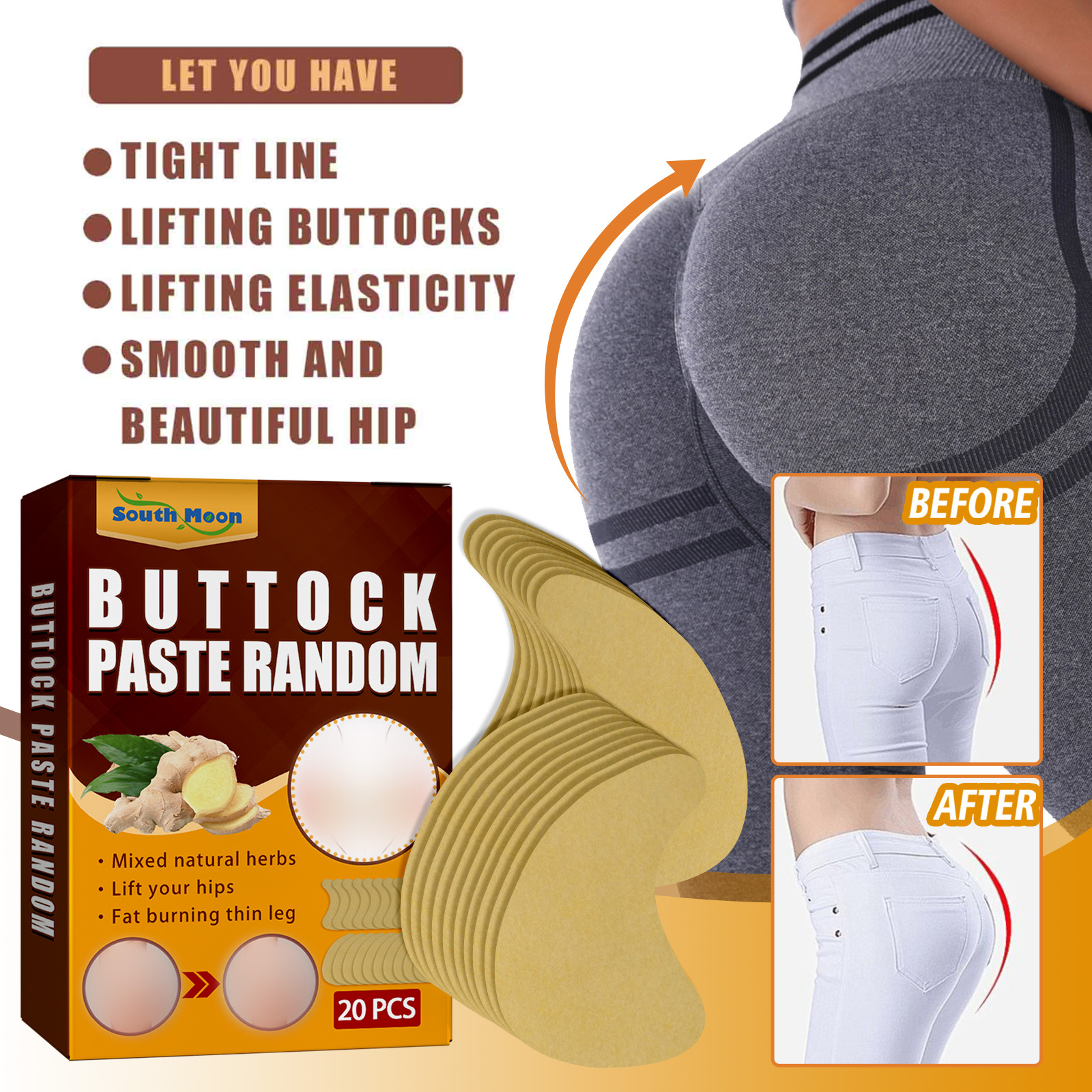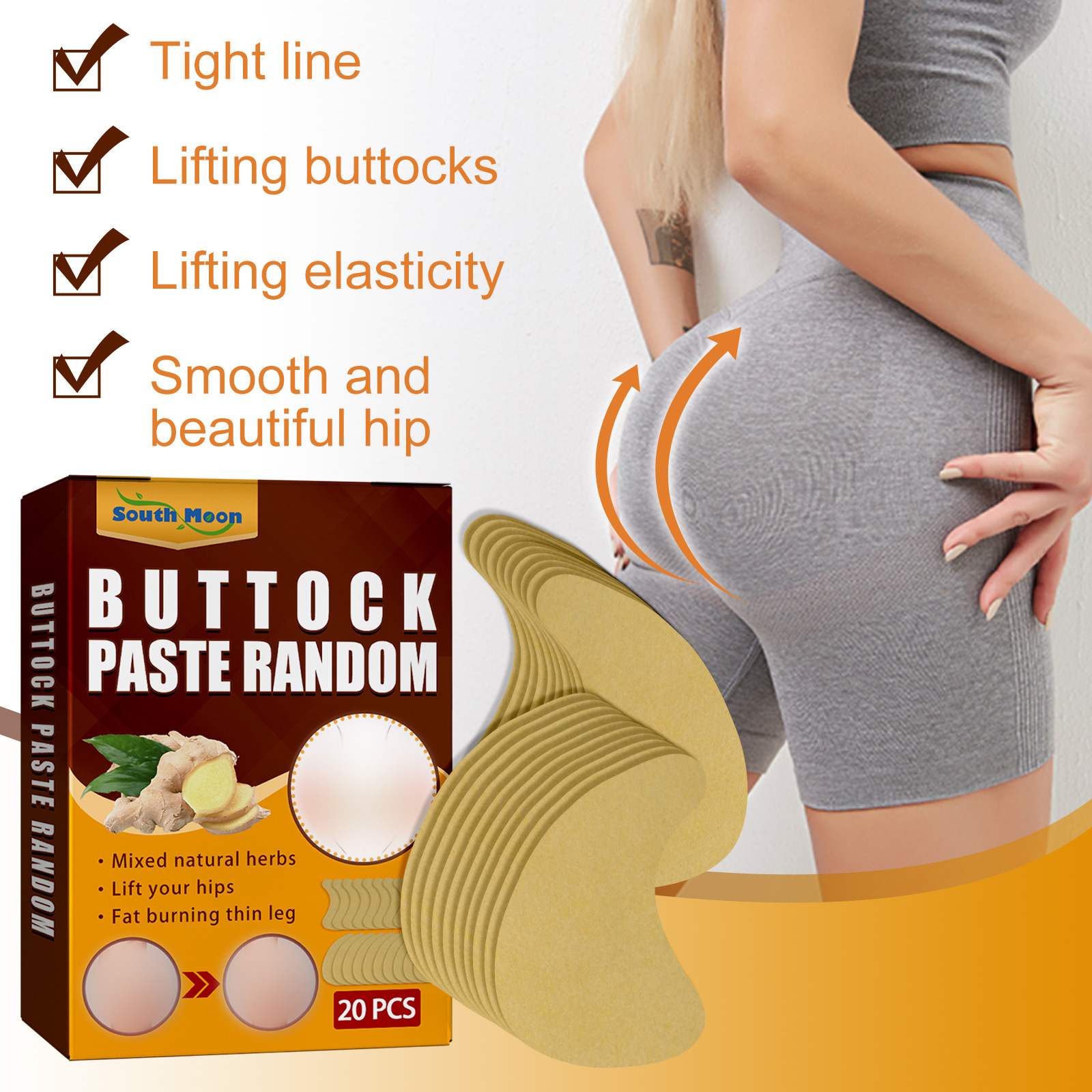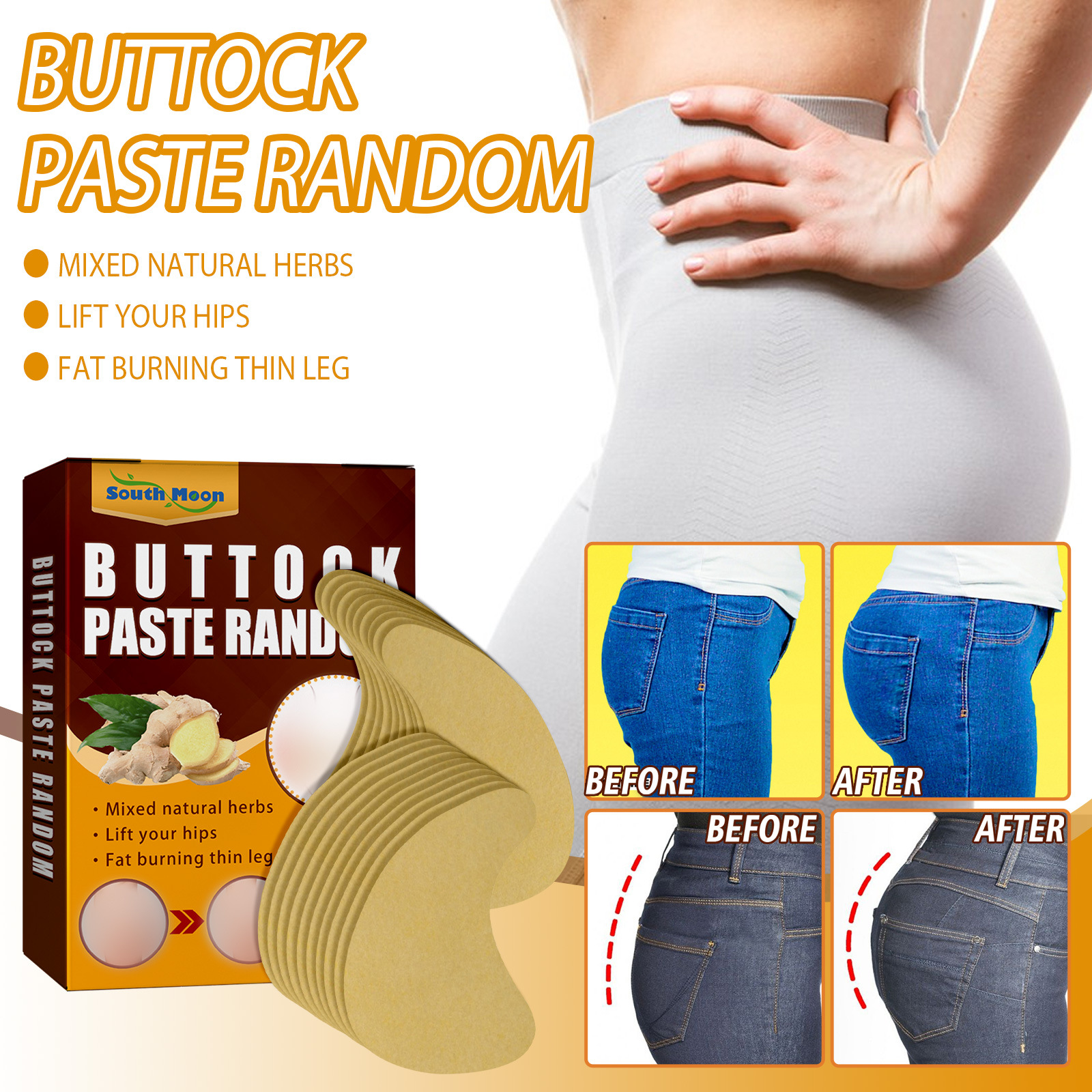 Our Buttock Paste Random contain ginger. It can tighten the butt line, lift the butt, create a smooth and beautiful butt, eliminate cellulite, and restore the elasticity of the butt. The method of application is simple: clean and dry, peel off the plastic liner of the product, apply the product to the skin of the buttocks, leave it on for 15 to 30 minutes, remove it, and gently massage the remaining serum until it is completely absorbed. Lift and tighten the hips, rejuvenate the skin, improve elasticity, and get a full butt.