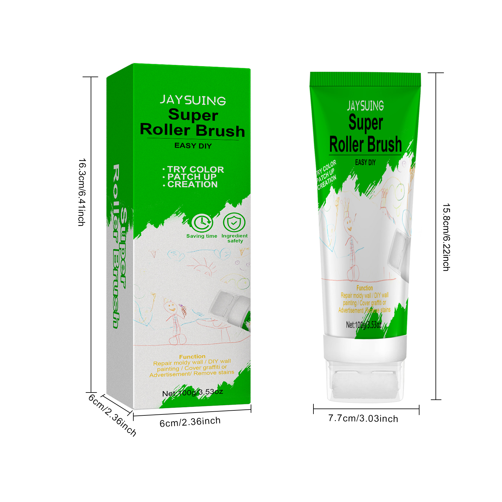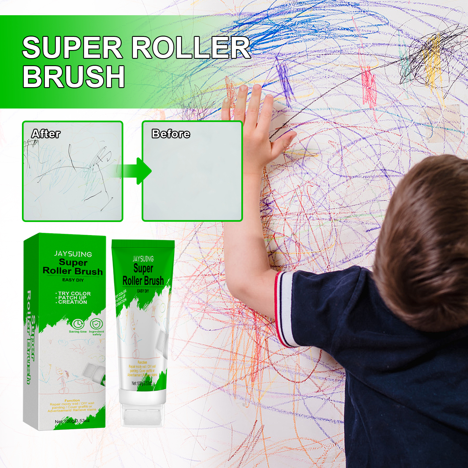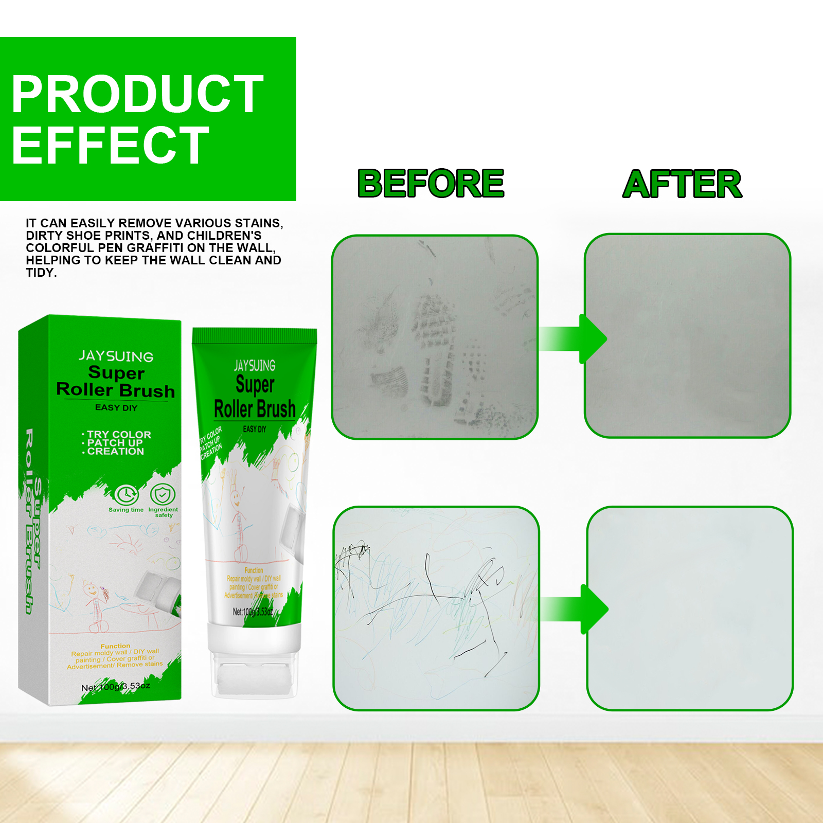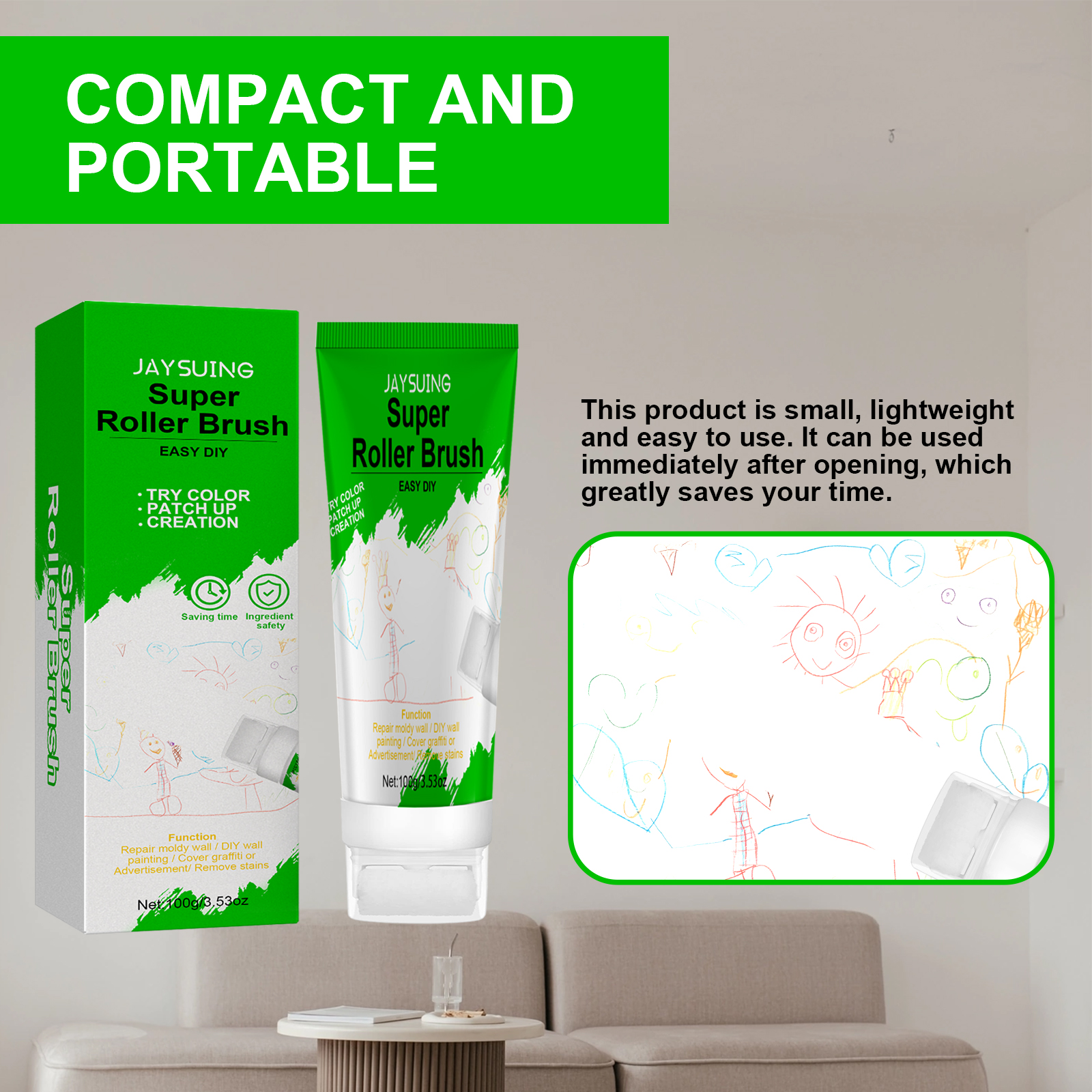 Our roller brush wall repair paste contains calcium carbonate and calcium oxide. It can easily remove all kinds of stains, dirty shoe marks and children's colored pen grey walls, helping to keep the walls clean and tidy; Easily cover dirty walls, no irritating taste, easy to store and use again. Its use method is very simple: wipe the dust off the wall with a towel; Open the bottle cap of this product, extrude the latex paint, and then roll on the wall; Let dry for 3 minutes. Roller brush repair wall paste small volume, light weight, easy to use, open can be used, greatly saving your time; The packaging uses a roller design, which helps to accurately grasp the amount and use location, so that you can restore all aspects of the wall as new.