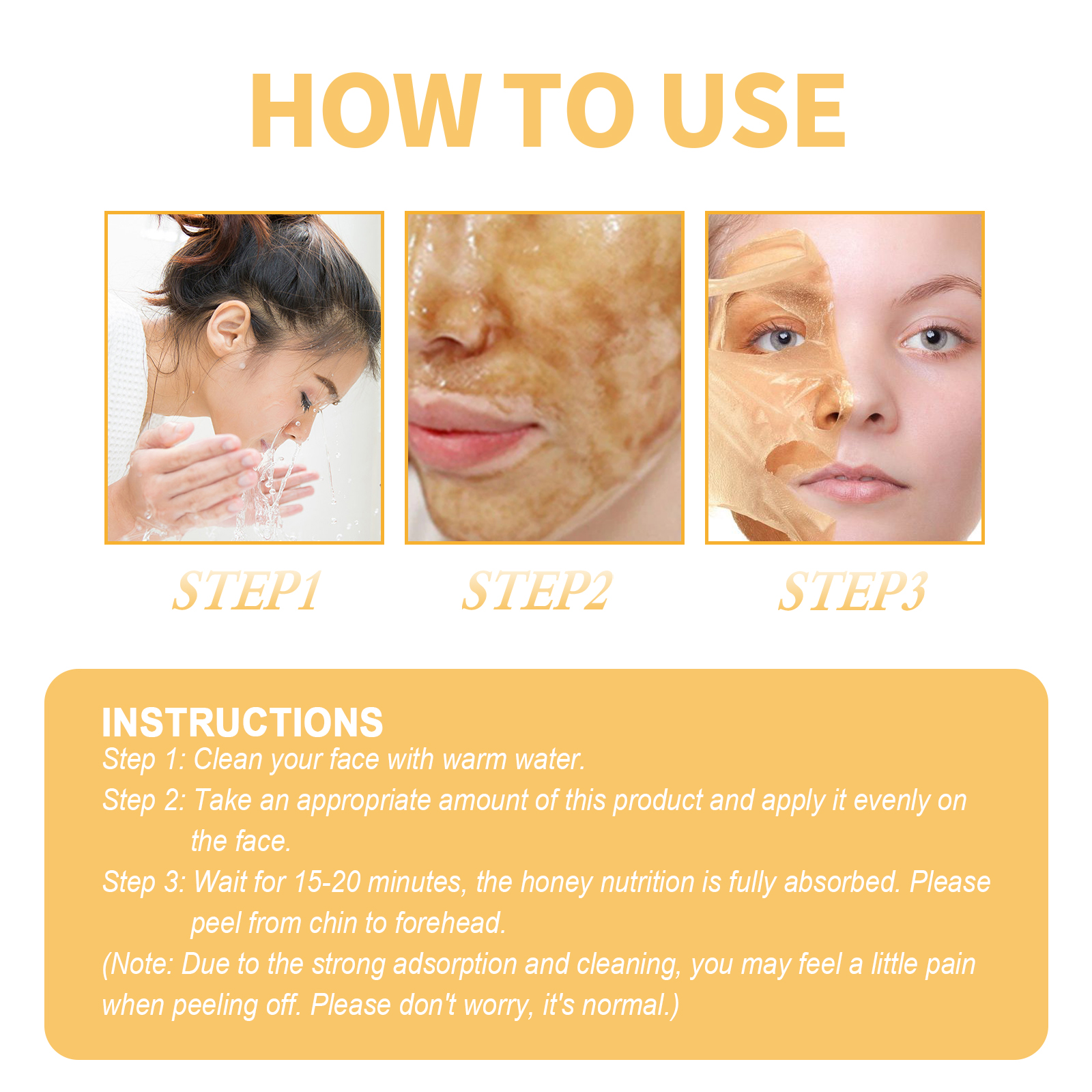 Our Honey Peel mask contains polyvinyl alcohol and glycerin. It can deeply clean the skin, open the pores, remove dirt, clean the old dead cuticle, remove the oil and dirt in the pores, enhance absorption, shrink the pores, and make the skin more easily absorbed. Its use method is very simple: first wash your face with warm water, then take the right amount of this product evenly apply on the face, wait 15-20 minutes, honey nutrition is fully absorbed, peel from the chin to the forehead. Prevent the formation of new spots after use, decompose the color spots. Create a water-locking barrier on the surface of the skin to prevent dark spots at source. Moisturize, nourish and replenish the moisture needed by the skin, leaving the skin smooth and bright.