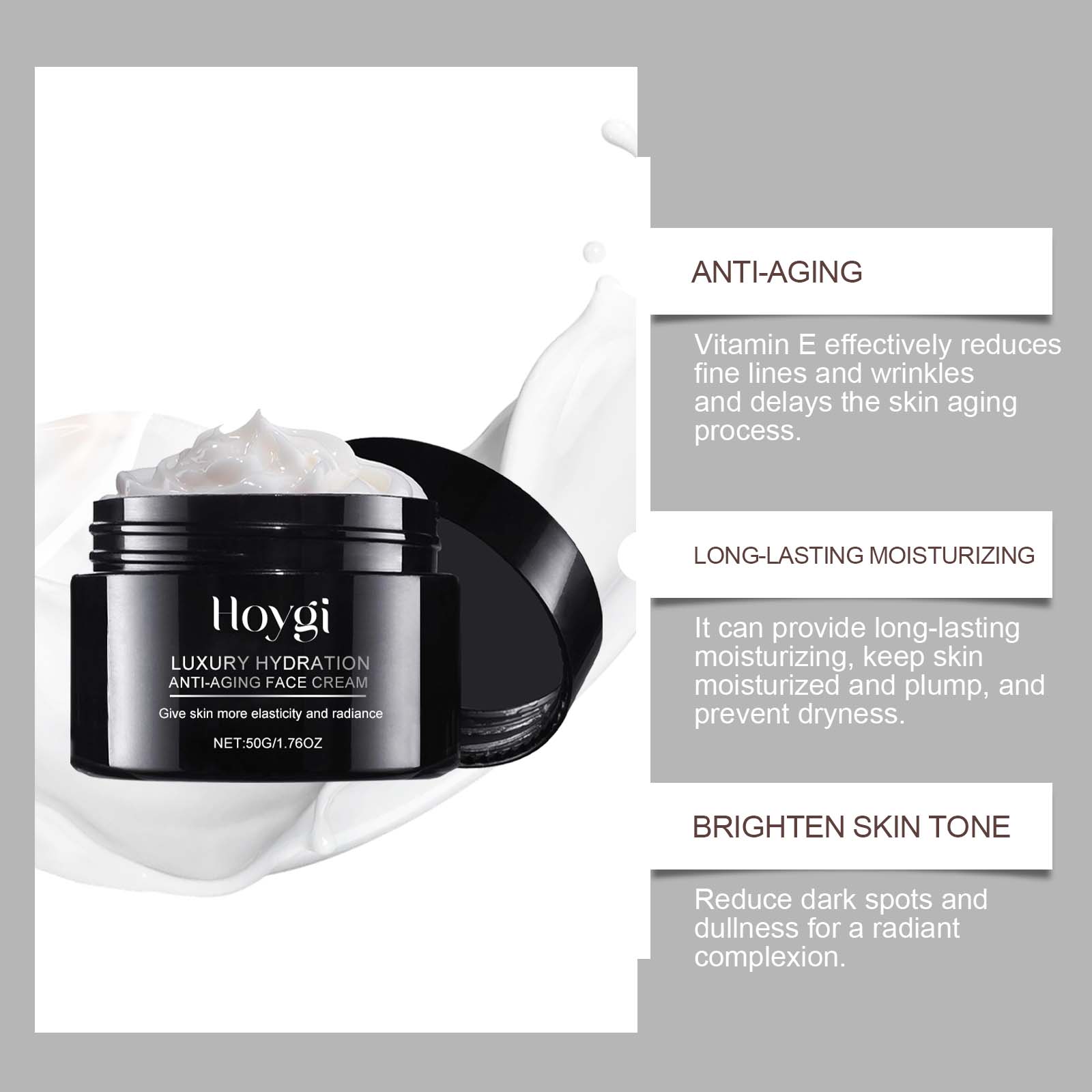 Our hyaluronic acid anti-wrinkle cream contains hyaluronic acid, hydrolyzed soy protein, and turmeric extract. It can deeply nourish the skin and enhance skin elasticity and firmness. Vitamin E is effective in reducing fine lines and wrinkles and delaying skin aging. Its application method is very simple: 1. Thoroughly clean the skin, dry it first; 2. Apply appropriate amount of the product evenly on the face; 3. Gently massage until fully absorbed. Deep nourishment, improve skin elasticity. Effective anti-wrinkle, delay aging.