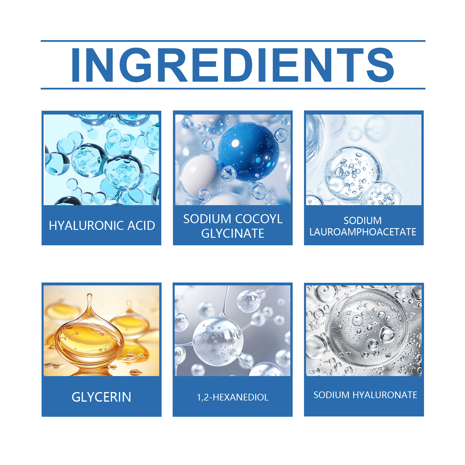 Our hyaluronic acid cleansing foam contains sodium cocoyl glycine and sodium lauryl amphoacetate. It gently soothes the skin and reduces irritation. The fine foam carries away the dirt and grease. Its application method is simple: 1. Clean and moisturize the facial skin; 2. Squeeze proper amount of cleansing mousse into palms, lather and massage into face. 3. Wash your face with clean water until it is clean. Deep cleansing of the skin removes dirt and excess oil to prevent clogged pores. Deeply nourish skin, anti-wrinkle, restore skin moisture and full, full of youthful vitality.