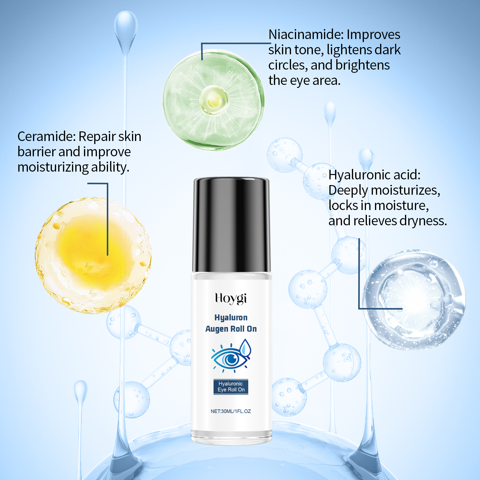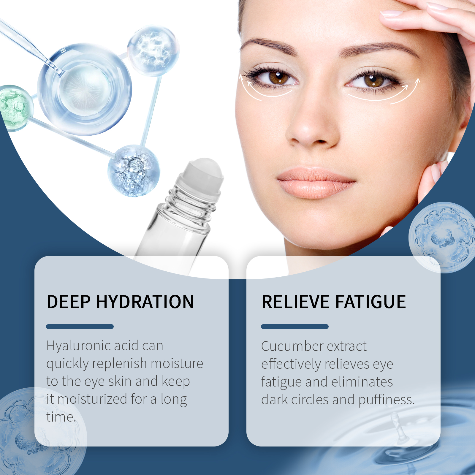 Our hyaluronic acid eye balls contain hyaluronic acid, ceramide and niacinamide. It can quickly replenish the moisture of the eye skin with hyaluronic acid and keep it moisturized for a long time. Cucumber extract effectively relieves eye strain, dark circles and puffiness. Its application is simple: clean the eye by gently rolling the ball along the eye area, then gently tapping the skin around the eye to help the essence be absorbed and dried. And nicotinamide can lighten the skin, make the eye skin more bright.