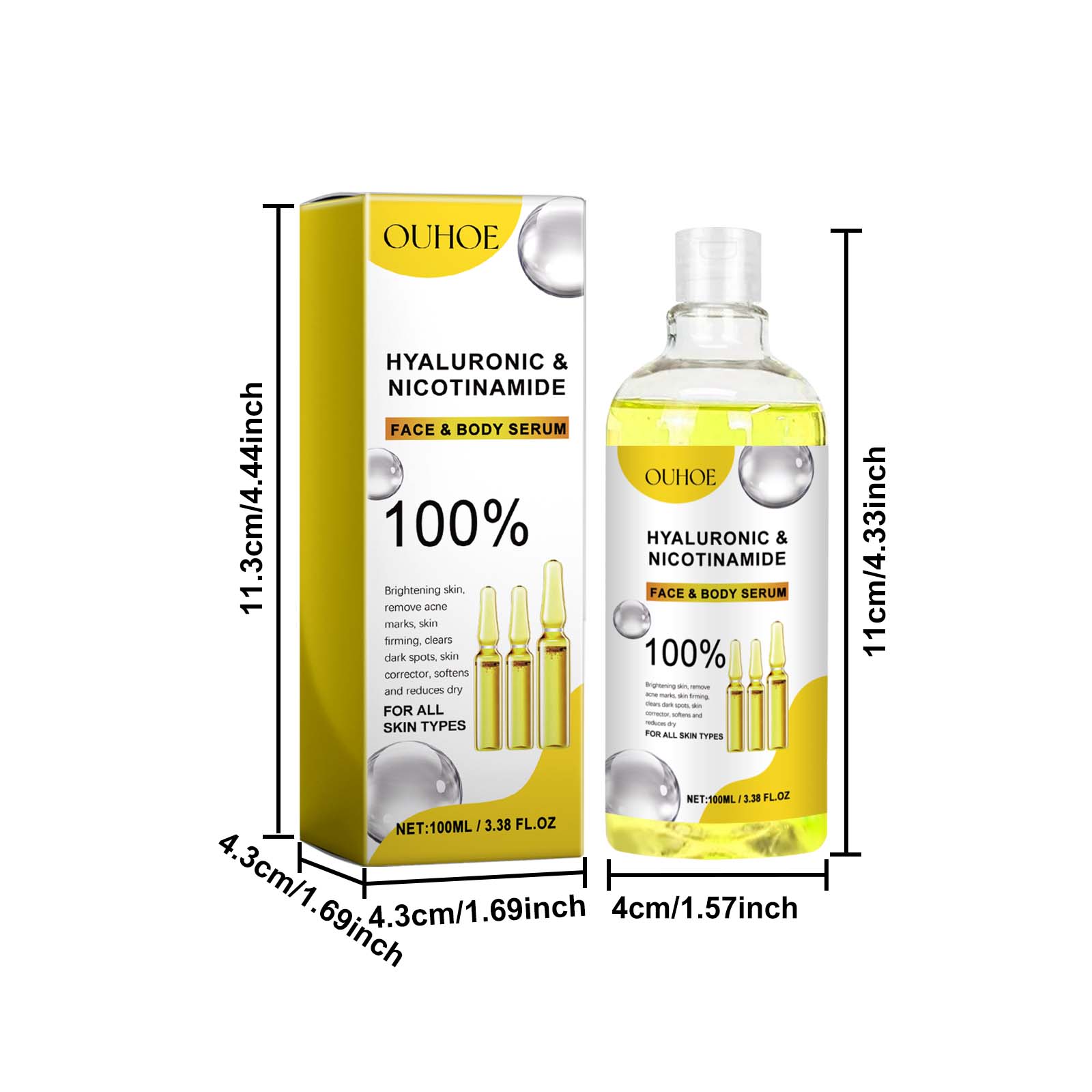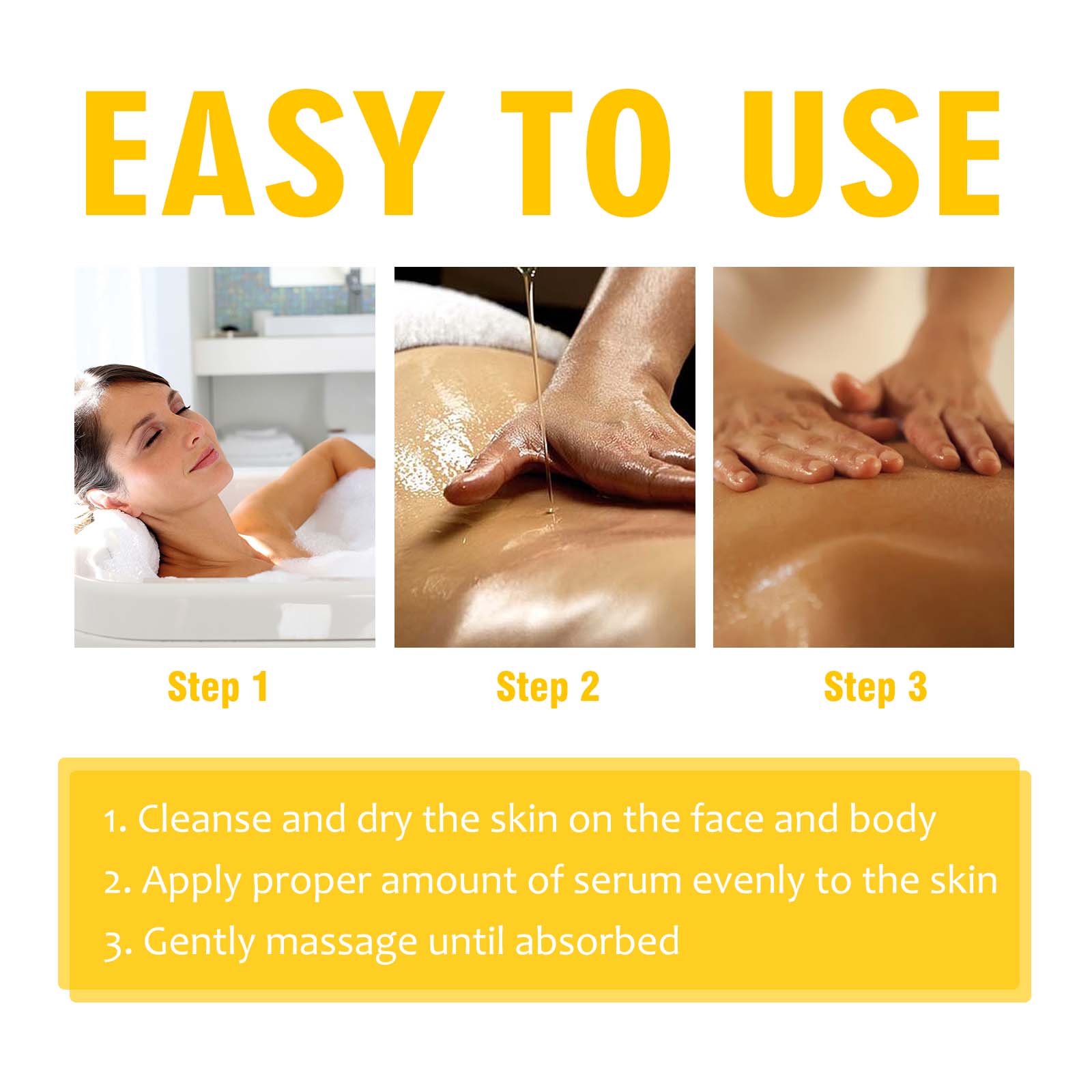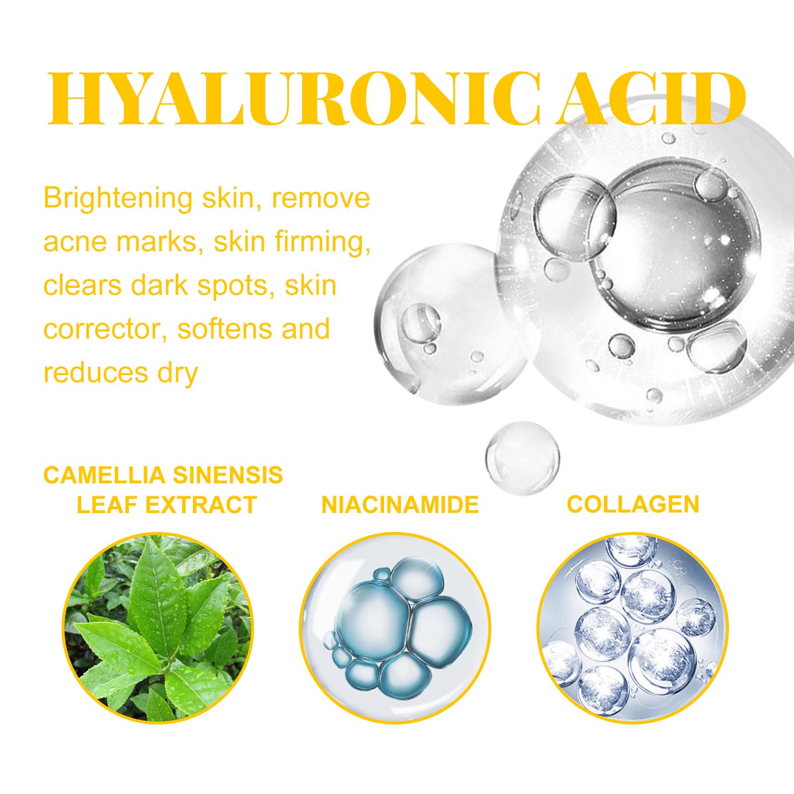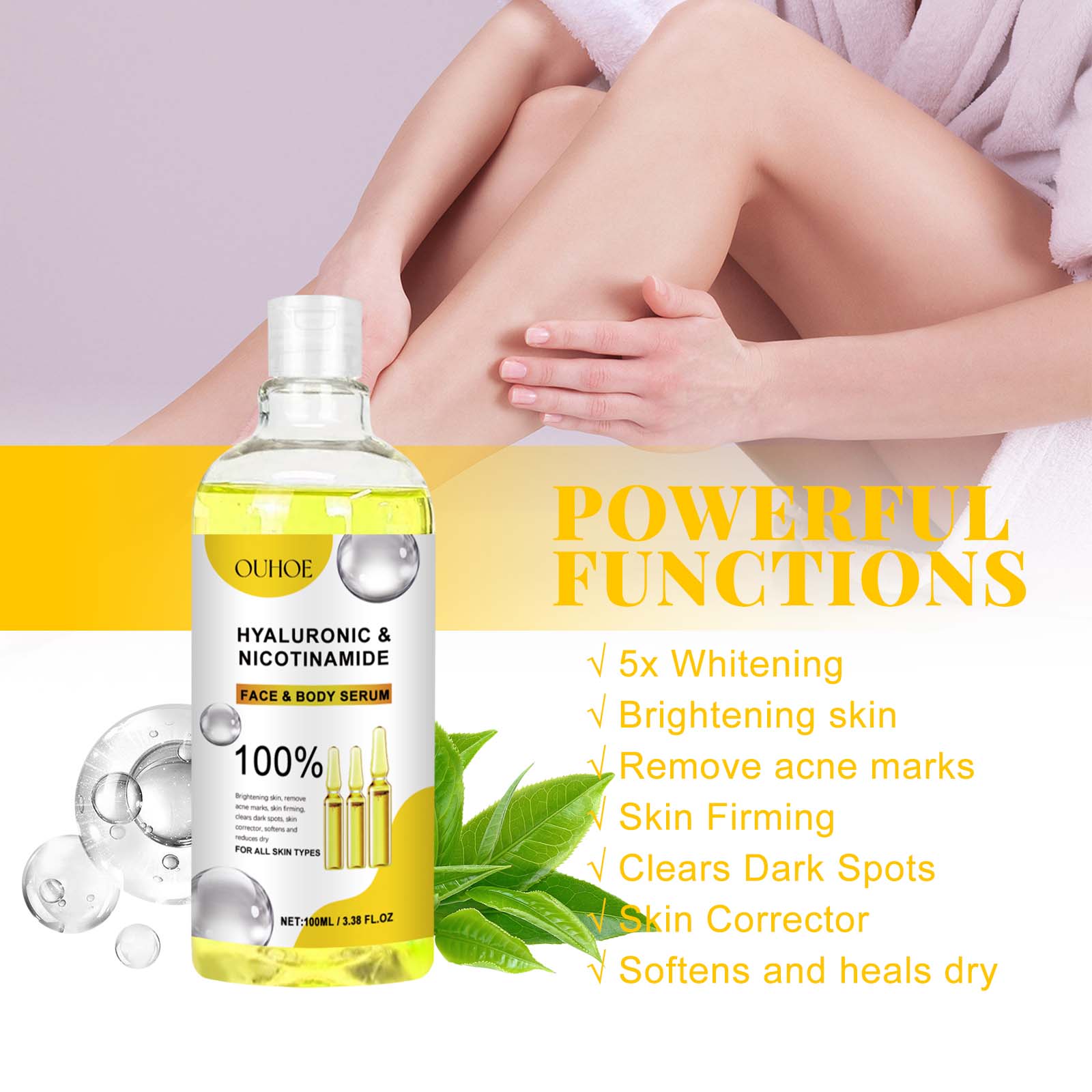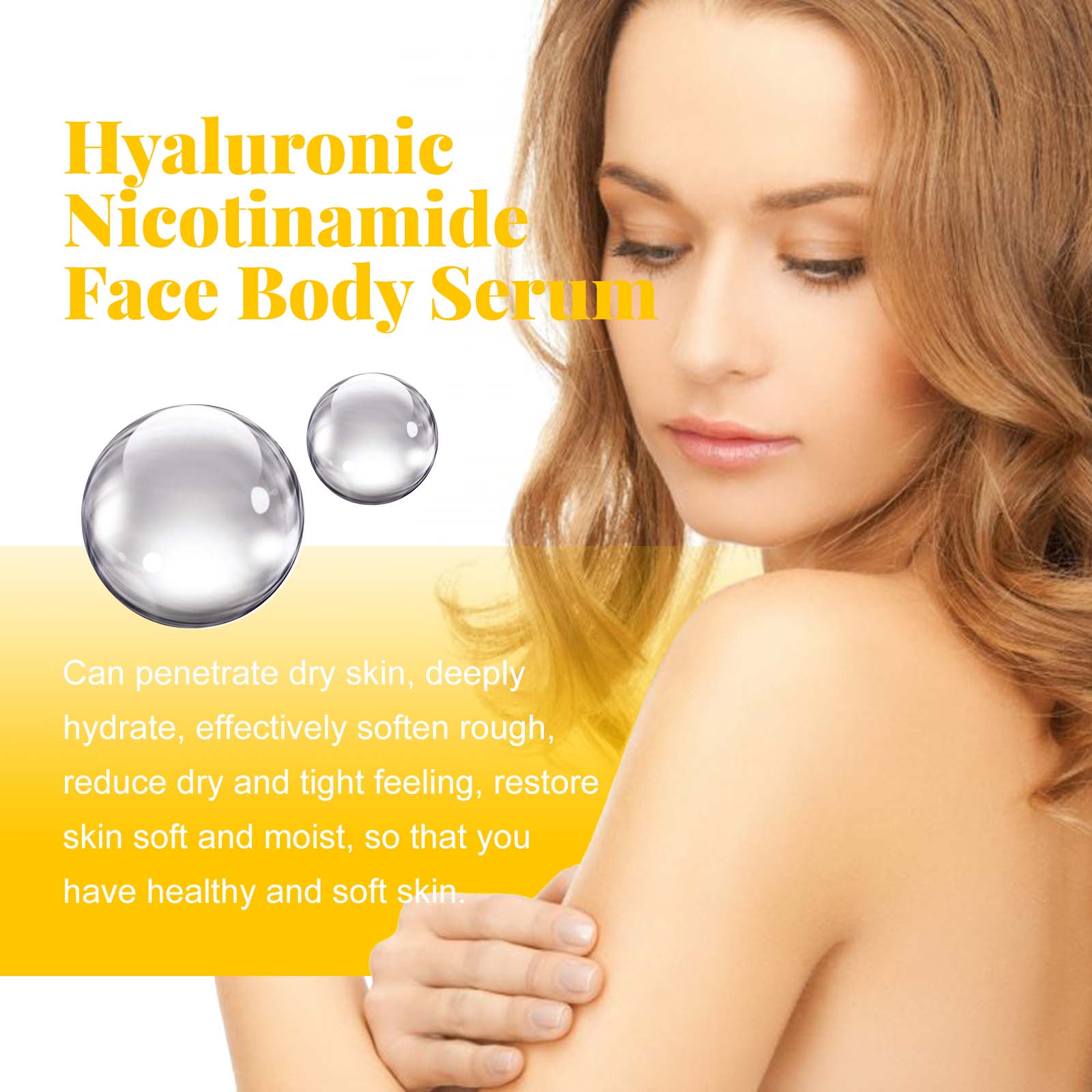 Our hyaluronic acid Facial Body serum contains tea extract, nicotinamide. It can penetrate dry skin, deeply moisturize, effectively soften rough skin, reduce dry and tight feeling, restore skin soft and moist, so that you have healthy and soft skin. Its use is simple: 1. Clean and dry skin on the face and body. 2. Apply proper amount of serum to skin evenly. 3. Gently massage until absorbed. And can go deep into the bottom of the muscle to repel dullness, fade stains, brighten the skin, make the skin glow from the inside out, bring you a pearl-like luster.