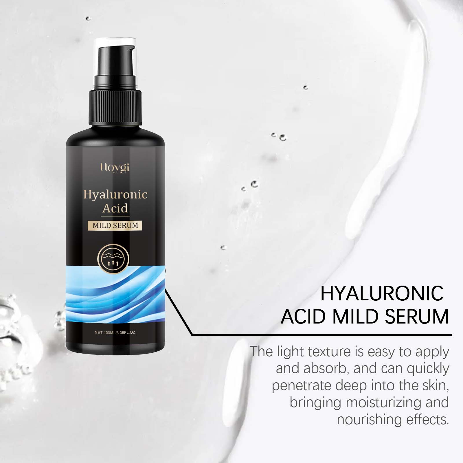 Our hyaluronic acid face serum contains glycerin, vitamin E(tocopherol). It deeply nourishes the skin, helps to restore the fullness of the skin, and enhances the overall glow. Its application method is very simple: clean facial skin, keep skin dry, apply appropriate amount of this product evenly on facial skin, gently massage until absorbed. It can also reduce fine lines and wrinkles around the face and eyes, and restore the firmness and elasticity of the skin.