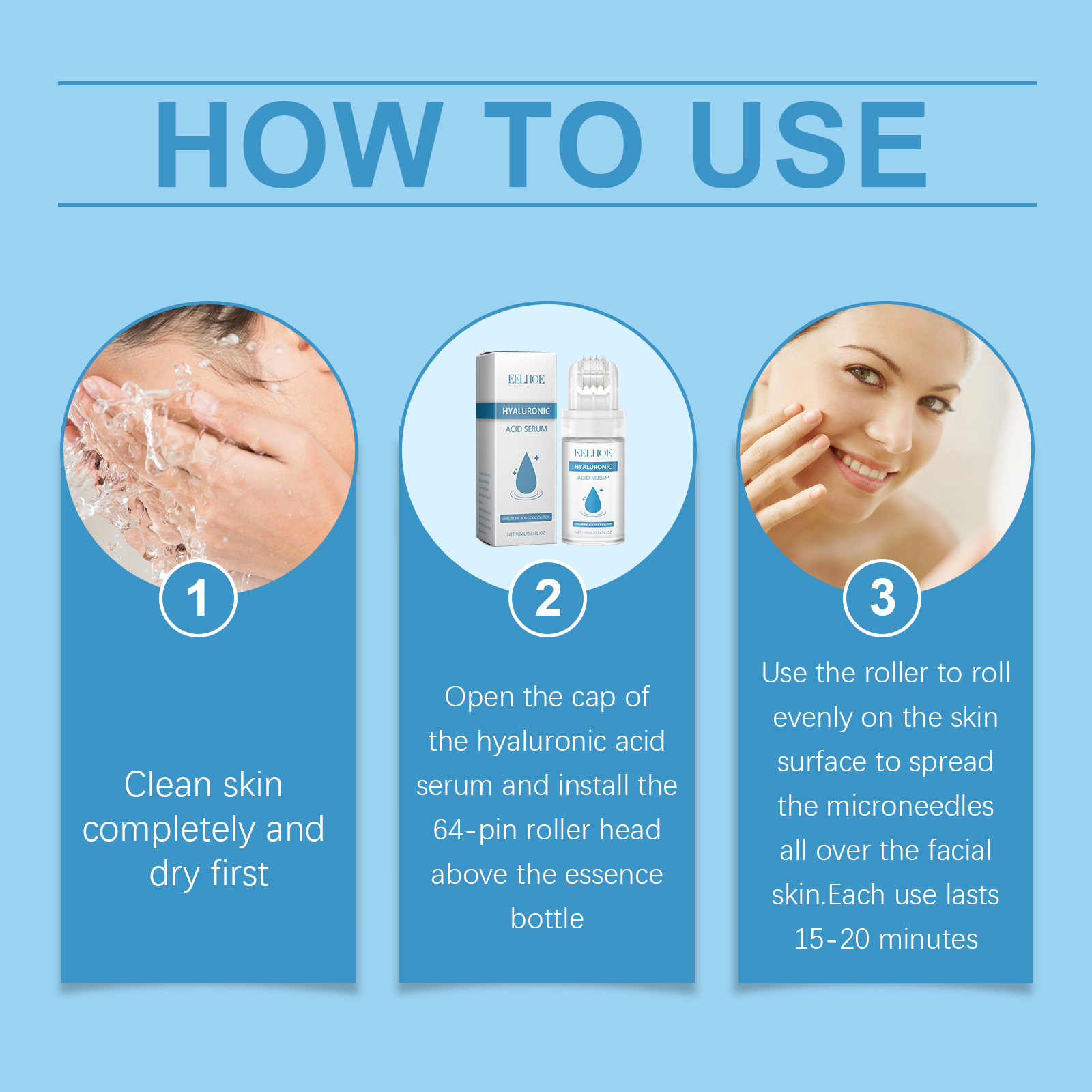 Our hyaluronic acid Roller serum contains hyaluronic acid, hydrolyzed collagen, glycerin. It penetrates deep into the skin and locks in moisture, leaving skin hydrated and smooth for a long time. After application, your skin will immediately feel hydrated and plump, with reduced fine lines and a healthy glow. Its application method is very simple: 1. First thoroughly clean and dry the skin; 2. Open the cap of the hyaluronic acid serum bottle and install the 64-needle roller head on the top of the serum bottle; 3. Roll the wheel on the skin surface to spread the microneedles all over the facial skin. Use for 15-20 minutes at a time. Microneedles stimulate collagen production, improve skin elasticity, reduce wrinkles and sagging.