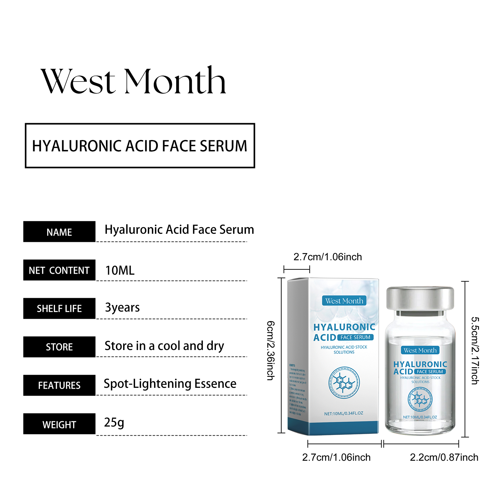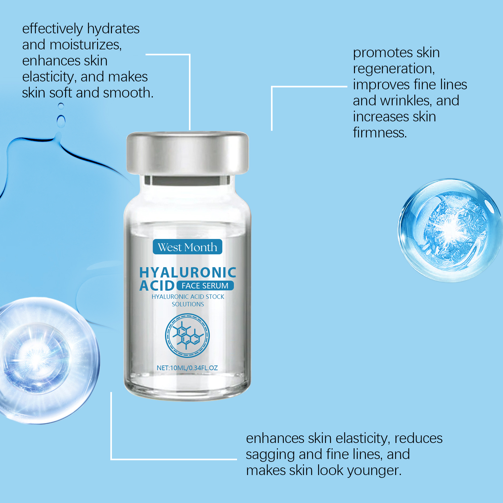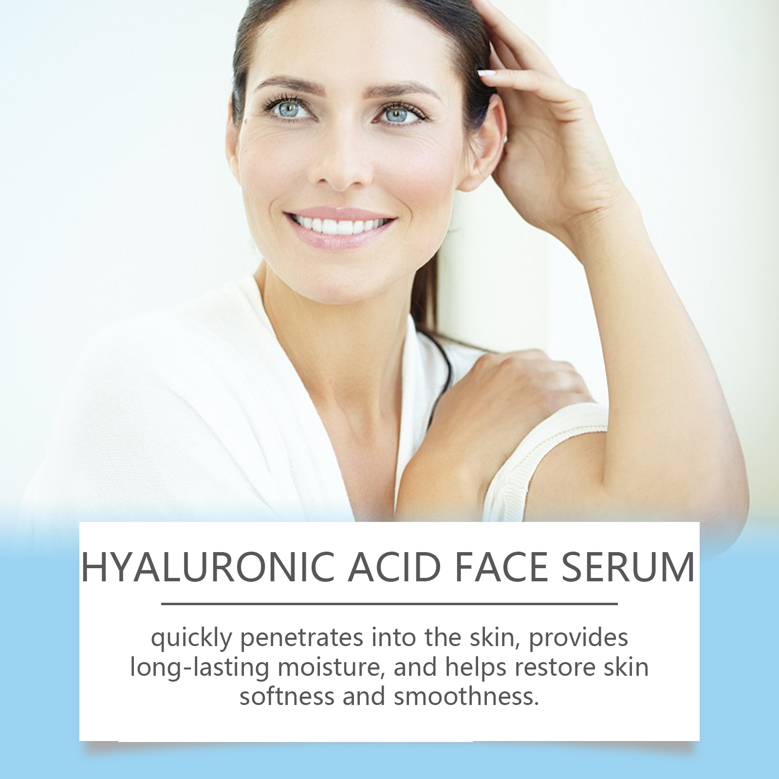 Our hyaluronic acid serum contains glycerin, panthenol, and PCA sodium. It lightens pigmentation, equalizes skin tone, reduces the appearance of fine lines and wrinkles, quickly penetrates into the skin, provides lasting moisture, and helps restore soft and smooth skin. Its use method is very simple: clean the facial skin, keep dry, take an appropriate amount of essence evenly apply to the facial skin, gently massage with your hand to promote absorption. Can improve skin elasticity, reduce the appearance of fine lines and wrinkles, continuous use can improve skin quality, make skin more delicate and smooth.