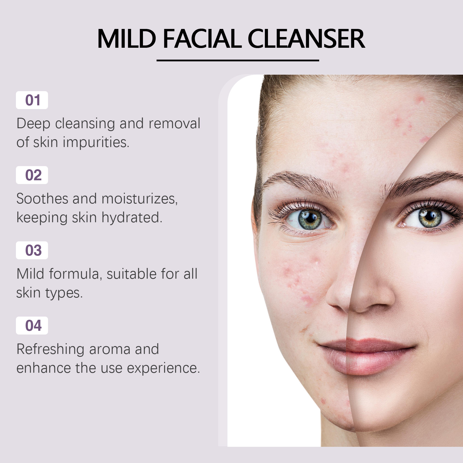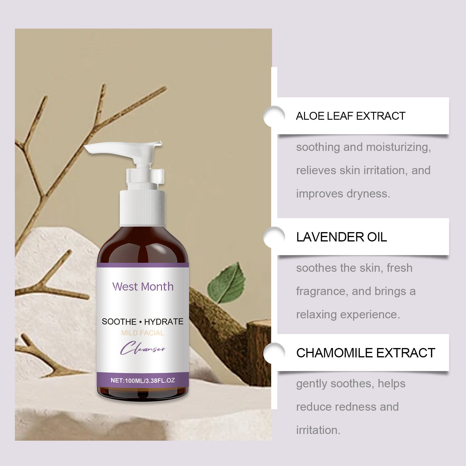 Our moisturizing cleanser contains chamomile extract, cocamidopropyl betaine. It deeply moisturizes, relieves dryness and leaves skin soft. The way to use it is simple: clean and moisturize the facial skin, squeeze out the right amount of cleanser, and gently massage the face. Wash your face with water until it is clean. And can soothe the skin, fresh fragrance, and bring a relaxed experience.