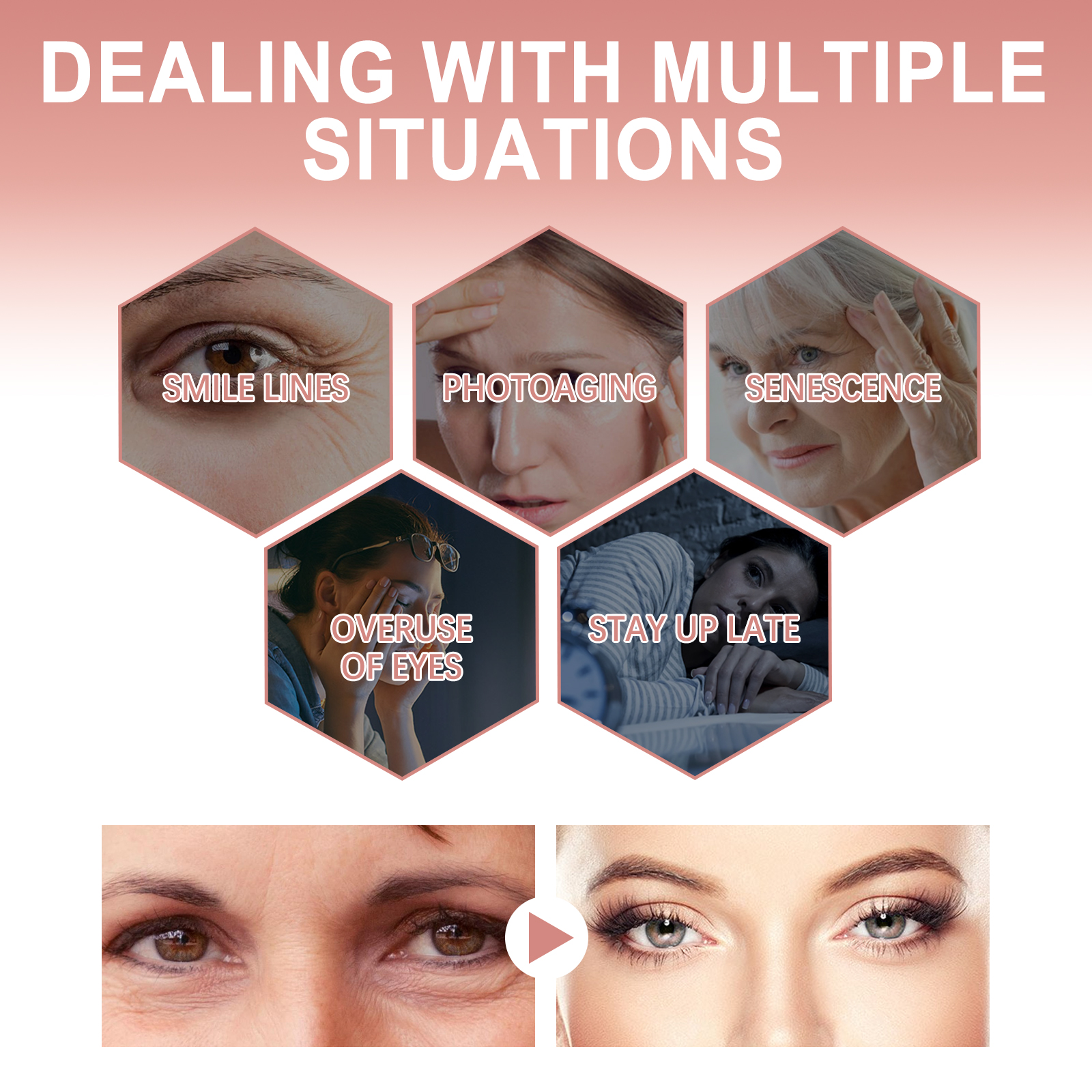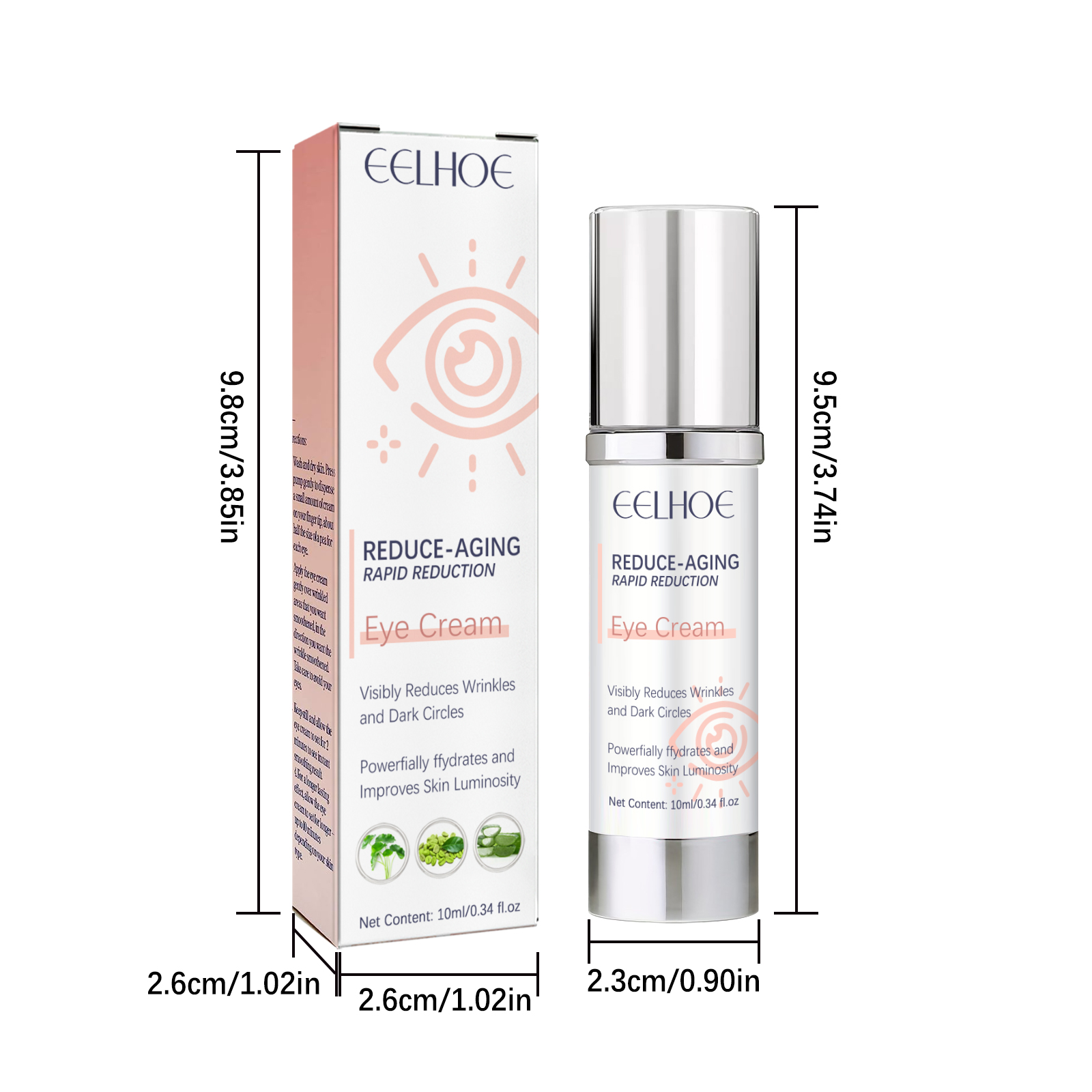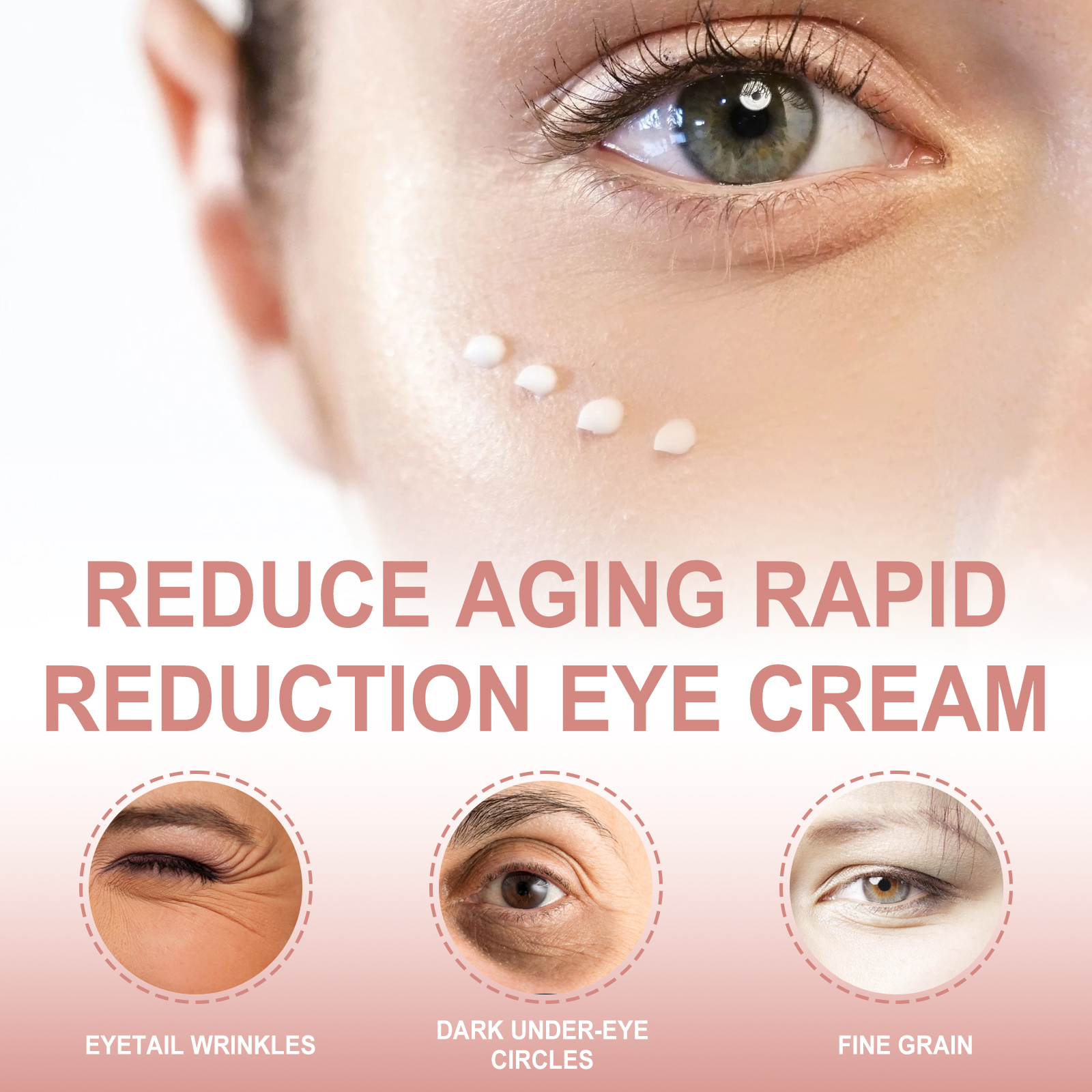 Our instant anti-wrinkle eye cream contains hydrolyzed collagen and Centella asiatica extract. It can quickly fade dark circles, smooth bags and laugh lines, replenish collagen and hyaluronic acid to tighten and smooth skin, speed up blood circulation, and reduce muscle contractions caused by facial expressions. Its application is simple: After cleansing and toning, take a mung bean-sized eye cream and apply it to the skin around your eyes. Massage gently with your fingertips in circular motions for 2 minutes to fully absorb. Use it daily for better results. And can care for the eyes.