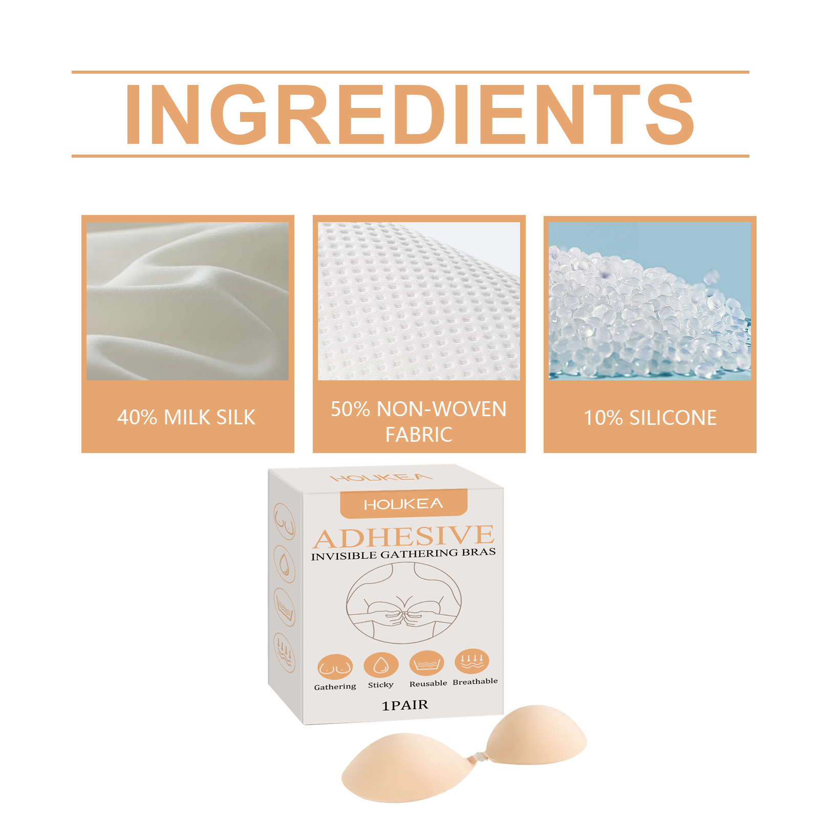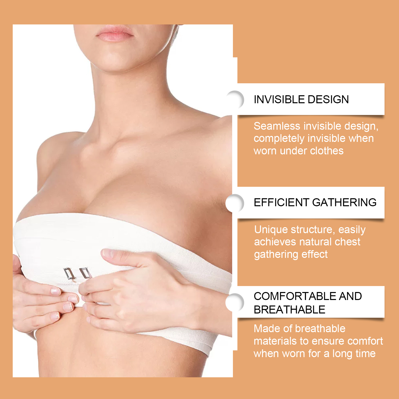 Our invisible bra contains 40% milk silk, 50% non-woven fabric and 10% silicone. It can be designed without steel rings to avoid squeezing and reduce discomfort. Back strapless design, suitable for backless, strapless clothing. Its application method is simple: 1. Completely clean and dry chest skin; 2. Place one side of the bra under your chest shoulder, on the lower and outer sides of your breasts; 3. Press gently to make sure it is snug, then stick to the other side; 4. Finally, lift the sides of the bra and button the center button. Do not increase the burden, so that you feel relaxed and comfortable. Suitable for all occasions, whether daily, sports or evening wear.