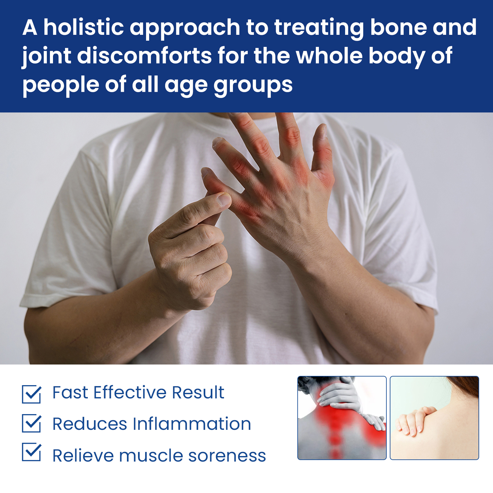 Our Various Vitamins Joint & Bone Care Cream contains bee venom, polysaccharides, curcumin. It can repair damaged joints and muscles, eliminate stiffness, correct deformities, eliminate cysts, reduce inflammation, and relieve muscle soreness. Its use method is very simple: 1 Clean and dry the skin of the joint, apply appropriate amount of care cream evenly on the joint, massage gently with your hand in a circle until absorbed. Use twice daily is more effective in reducing and treating osteoarthritis, rheumatoid arthritis, bursitis, myositis, osteoporosis, gout, carpal tunnel syndrome, ligament strain, synovitis, tennis elbow, cysts.