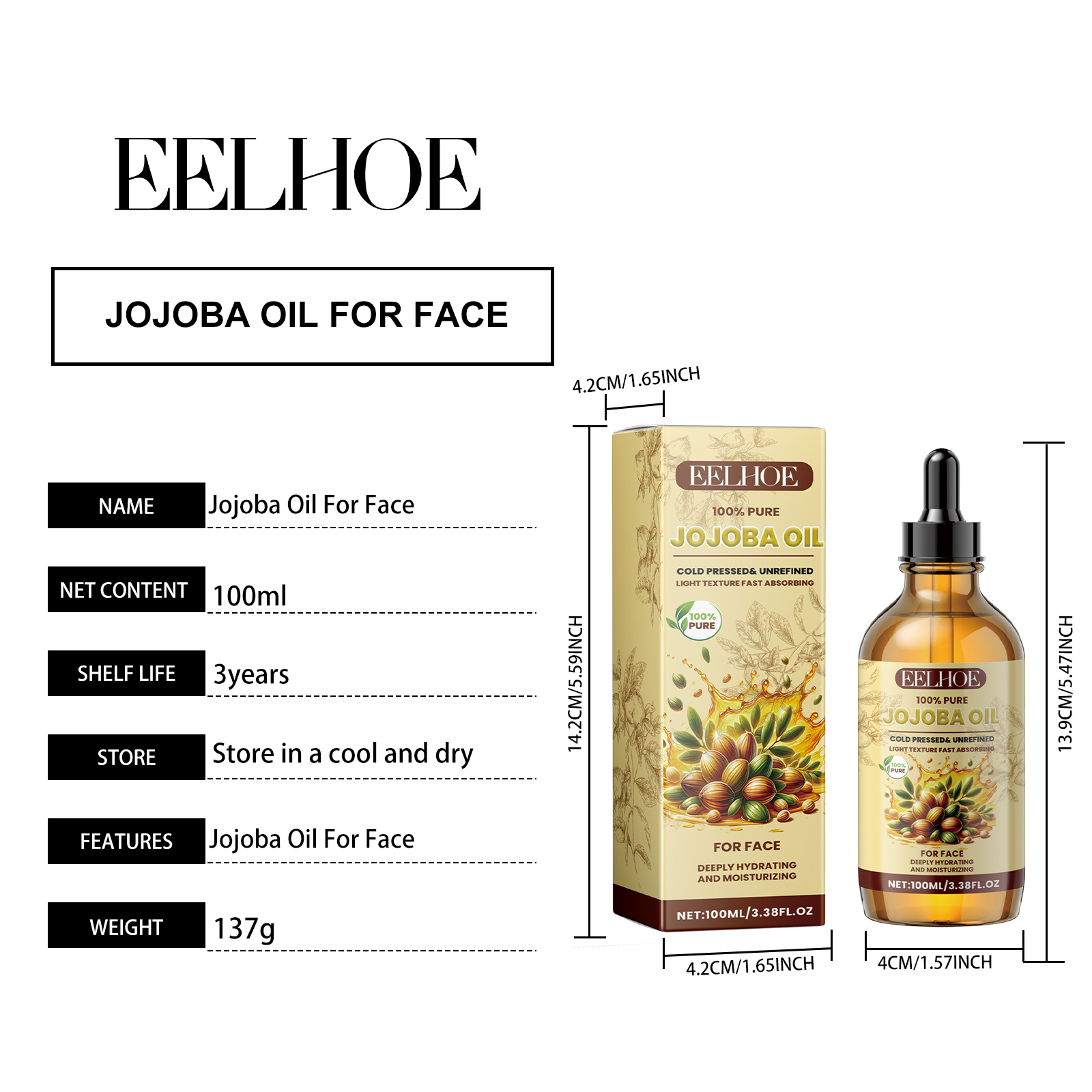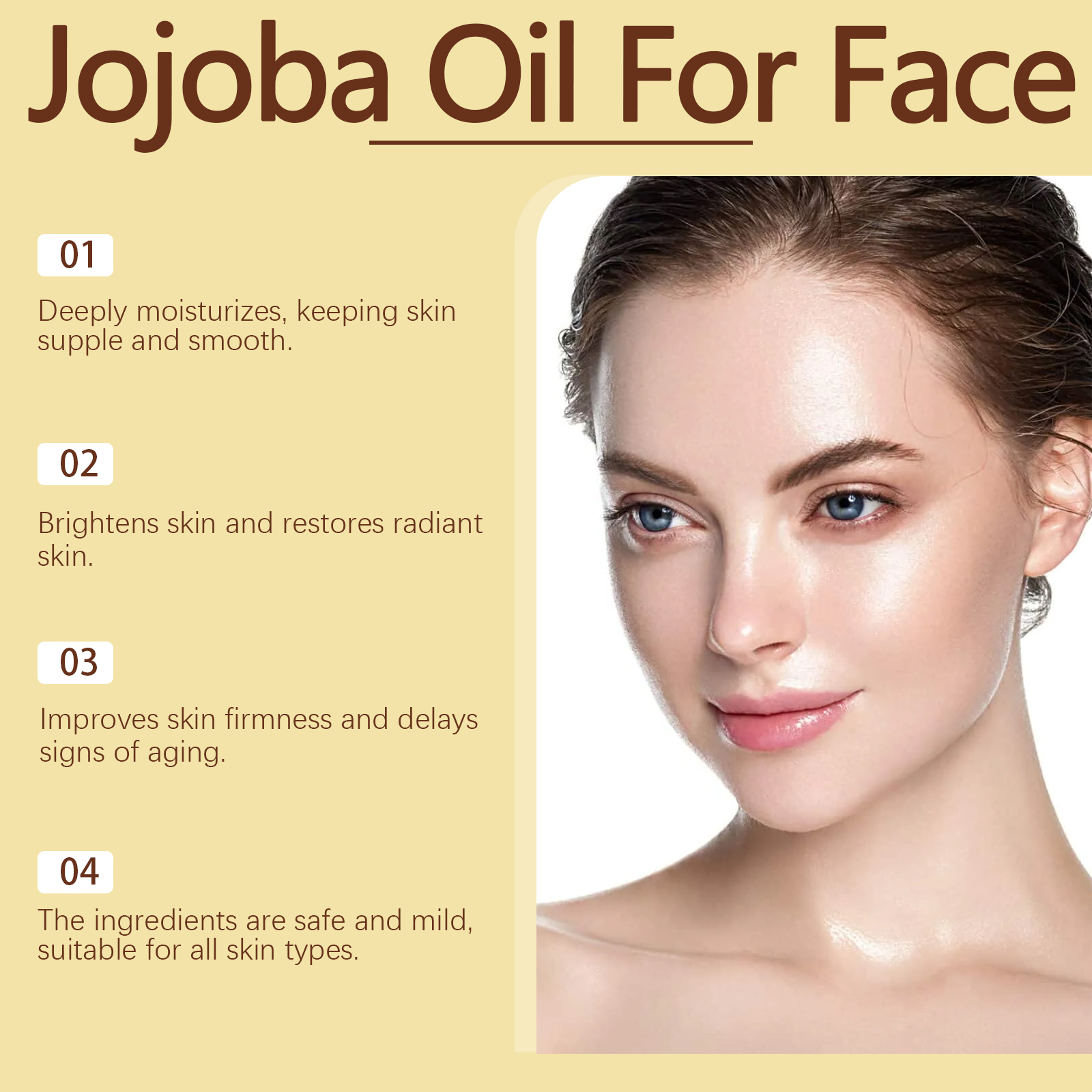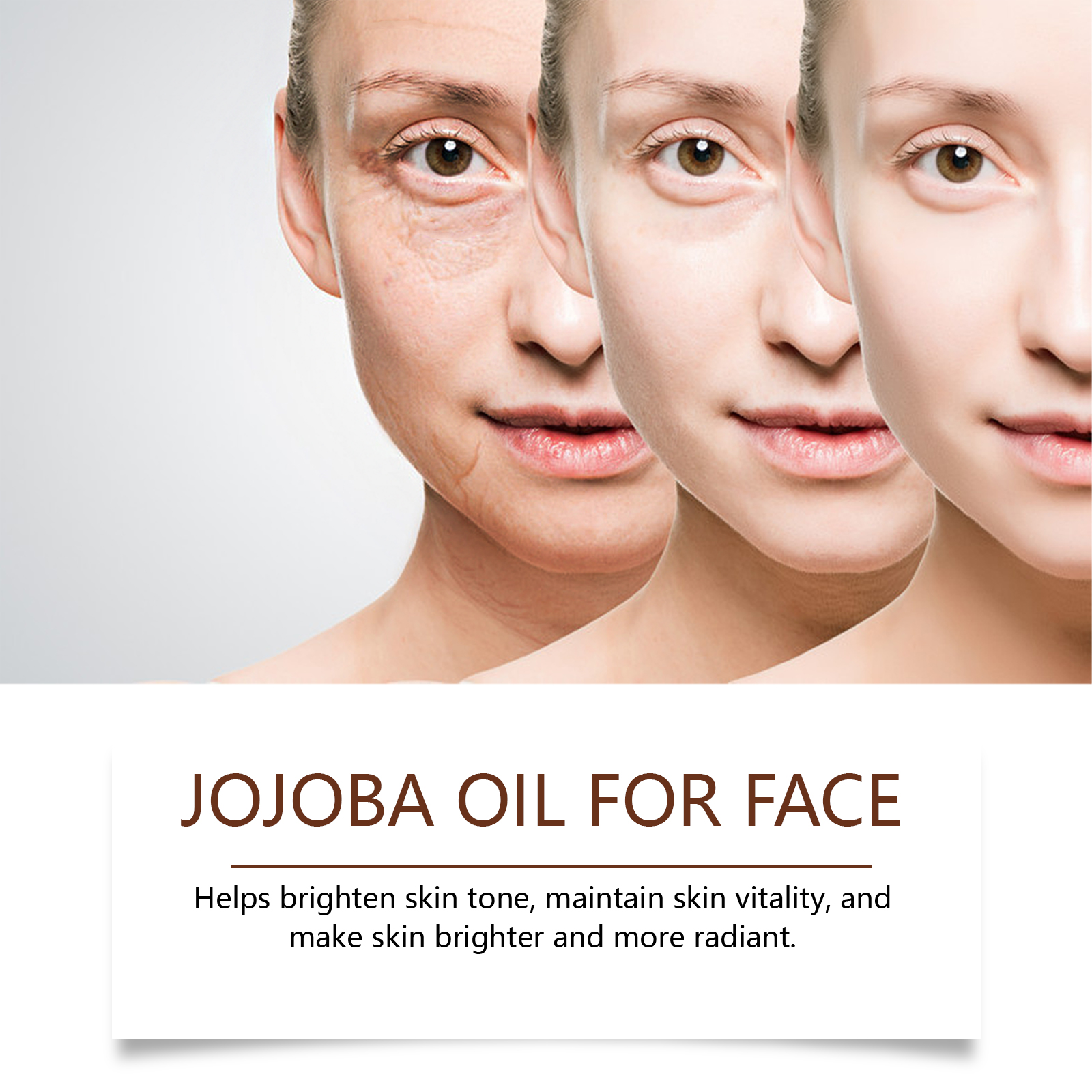 Our Jojoba face essential oil contains vitamin E, hyaluronic acid. It can boost the metabolism of the skin and lighten the complexion. How to use it is simple: start with a clean and toner. Take appropriate amount of essential oil, evenly apply to face skin, and gently pat face to absorb. It can also improve skin firmness and delay signs of aging.