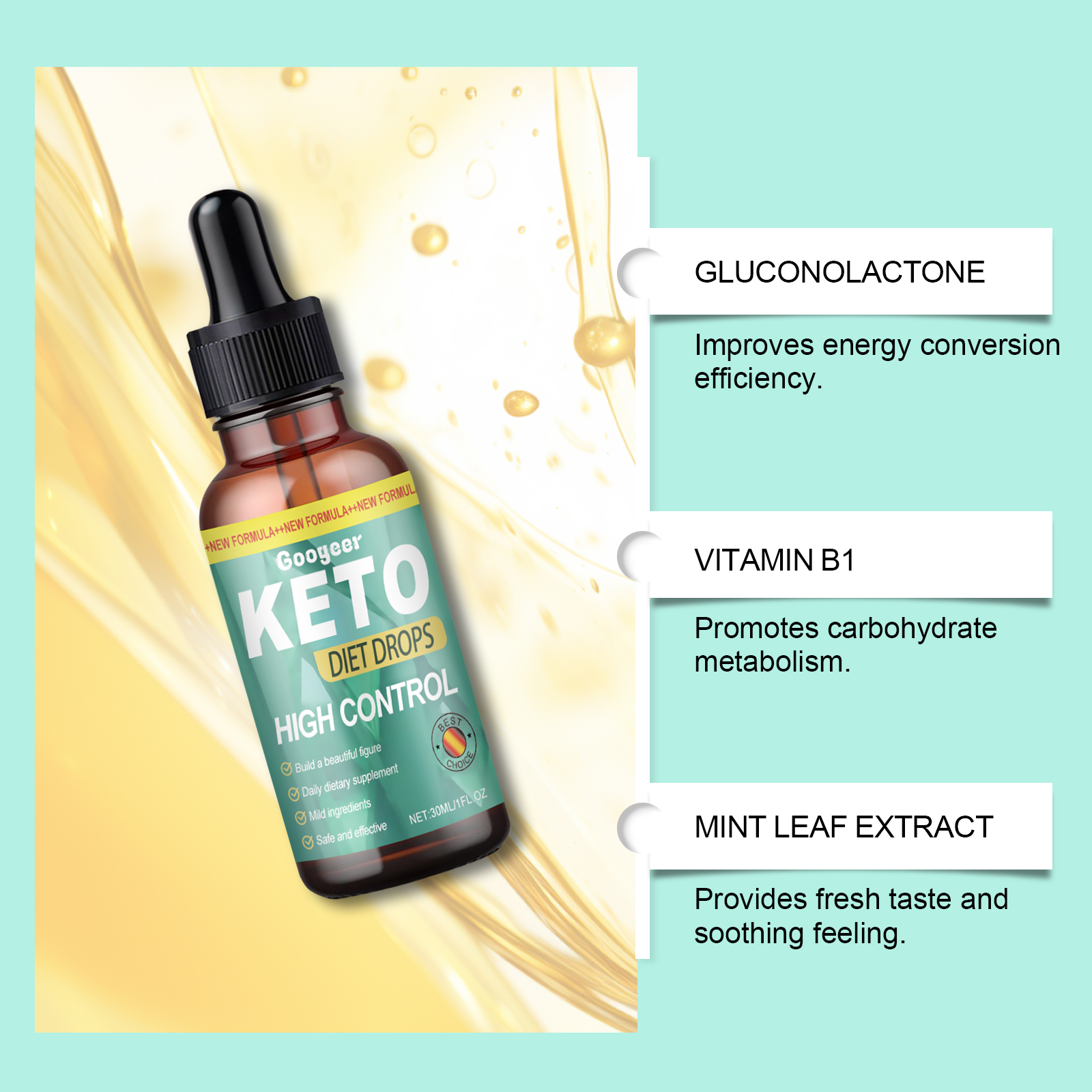 Our ketogenic diet drops contain Chinese herbal extracts, gluconolactone, vitamin b1. It can improve the efficiency of energy conversion. Promotes carbohydrate metabolism. Provides a refreshing taste and soothing feeling. The way to use it is simple: Shake it well before serving, 1-2 drops at a time. Rapid release of energy absorption is fast, the effect is fast. Scientific proportion, good effect. No added sugar, healthier option.