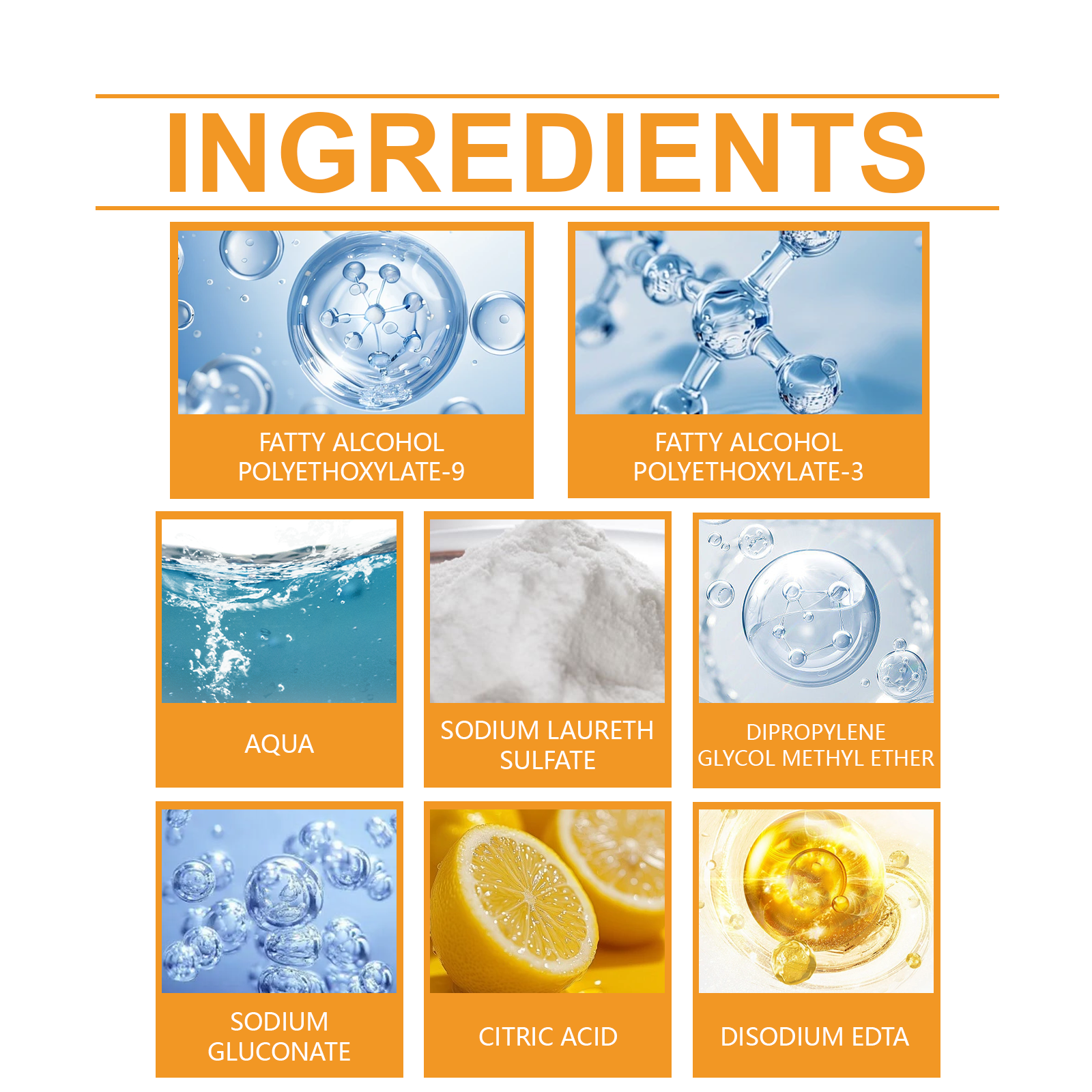 Our kitchen grease cleaner contains citric acid and disodium EDTA. It can easily remove stubborn oils and is suitable for a variety of kitchen surfaces. Its use method is very simple: wear gloves before use, and shake the spray, spray the spray on the stain, wait a few minutes, let the stain dissolve, wipe the surface with a washing pad, and wipe off the residue with a wet dust-free cloth. And can effectively soften the water quality, improve the cleaning effect.