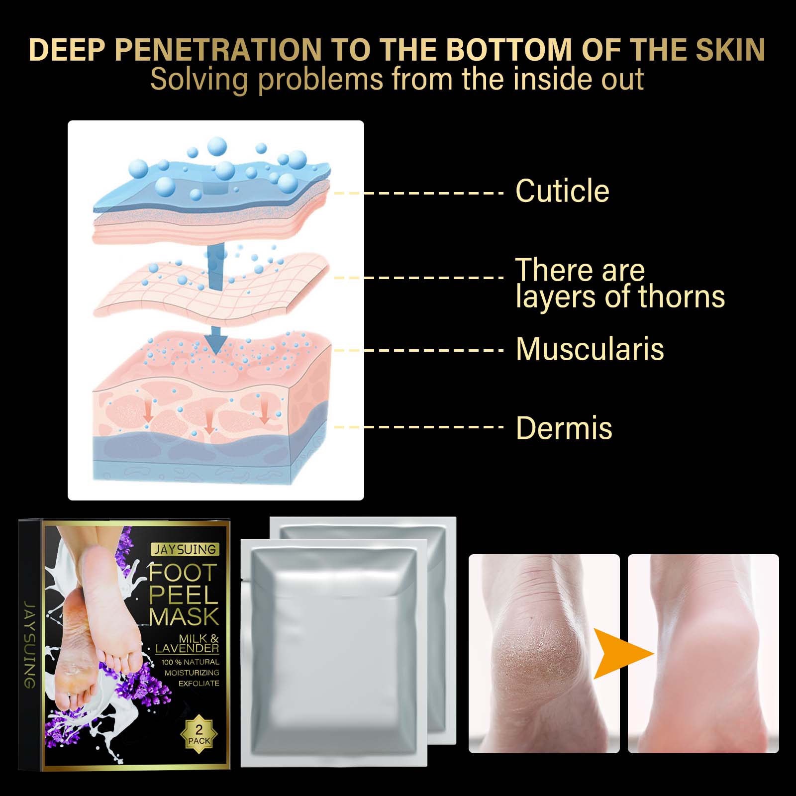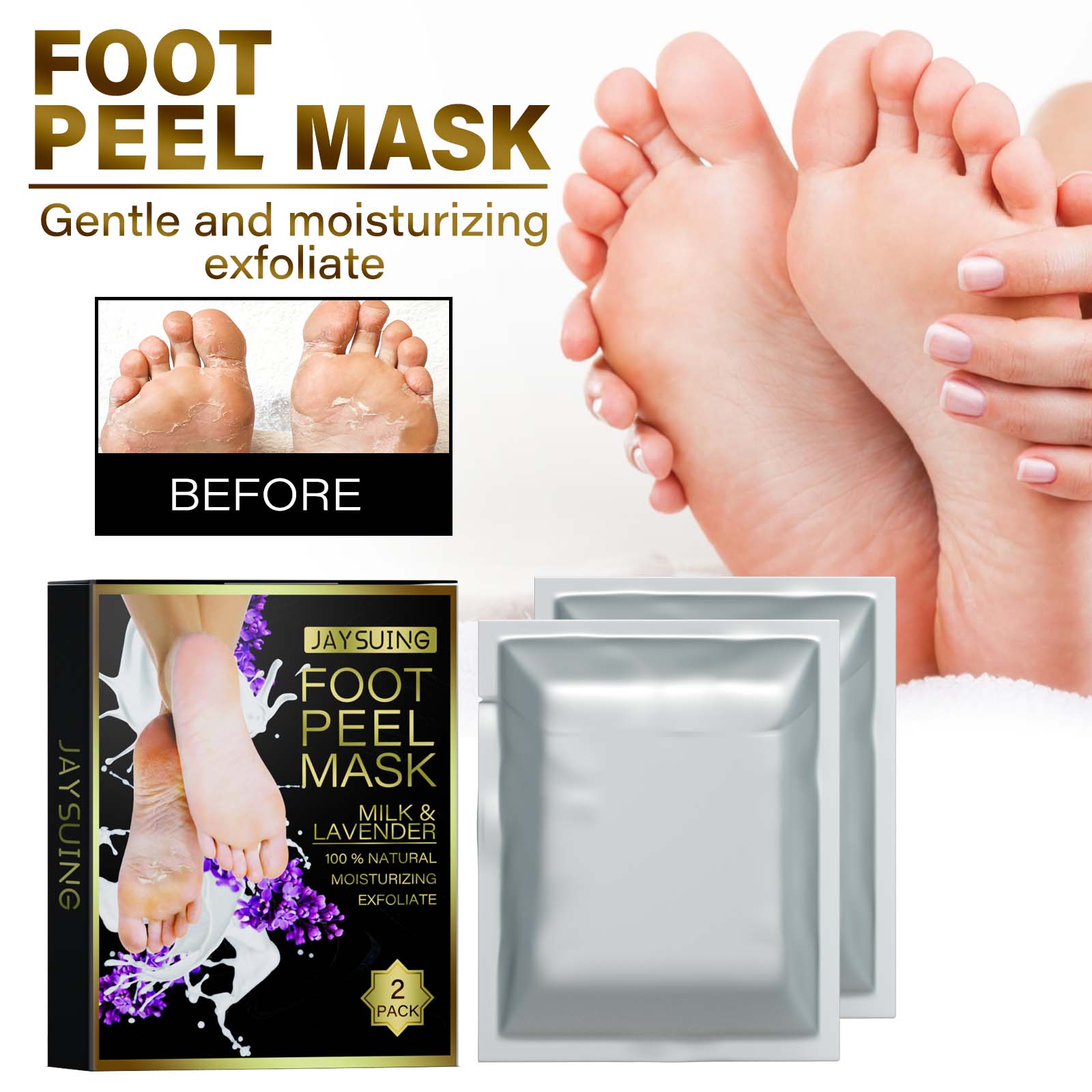 Our lavender exfoliating foot mask contains lactic acid, lavender extract, aloe vera extract. It can decompose dead skin, easy to peel off old cutin, soften dead skin, improve smell, moisturize and nourish foot skin, make skin smooth, gently moisturize and nourish skin, tender skin. Its use is very simple: After cleansing, take out the foot mask and cut along the dotted line. Put on the foot mask, tear off the adhesive and fasten. Wait about 15 minutes. Just wash with clean water. Let the feet better absorb the essence, skin friendly foot mask can effectively lock the membrane sleeve essence, plant extract essence, safe formula, easy to remove sunburn, dead skin, calluses, deep penetration into the bottom of the skin, from the inside out to solve the problem.