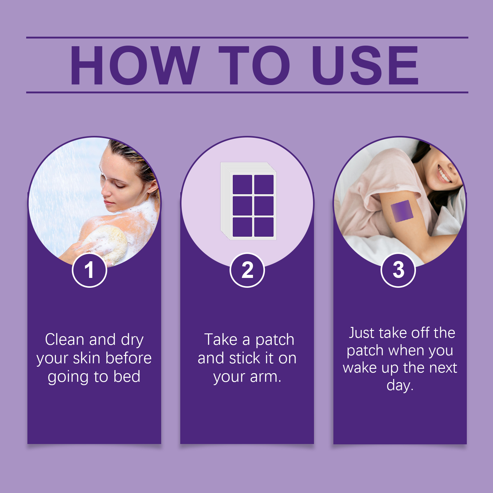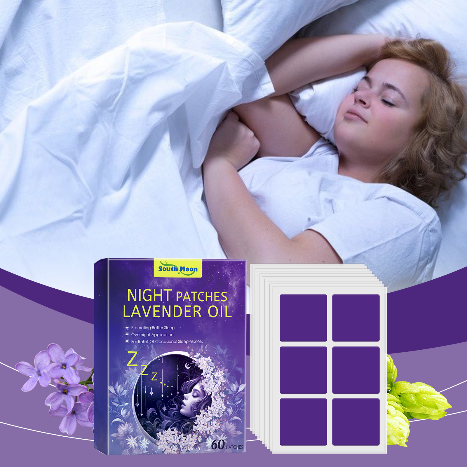 Our Lavender scented sleep patches contain lavender, hop and rose essential oils. It can be used to promote relaxation and its mild aroma helps to calm the mind. Can help relieve tension and stress during the day. Helps to improve sleep and regulate sleep cycles. Its application method is very simple: 1. Clean and dry the skin before going to bed; 2. Take a patch and put it on your arm. 3. Just remove the patch when you wake up the next day. Patented technology to guide you to sleep naturally. Effectively relieve the stress that builds up during the day.