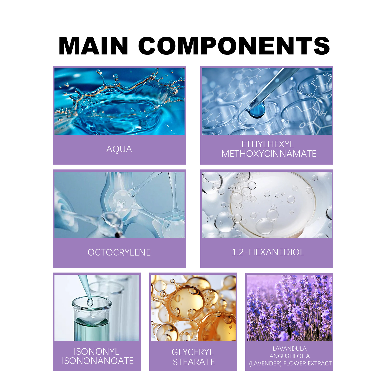 Our lavender UV protective cream contains isononyl isonanoate, glyceryl stearate, lavender flower extract. It prevents UV damage to the skin and forms an invisible skin barrier on the skin to help keep it pale and protect your skin. Its application is simple: clean and dry the skin, and apply the product evenly to the desired area. Can reflect ultraviolet light, absorb and filter ultraviolet light, full-wavelength protection, multi-directional protection of ultraviolet radiation.