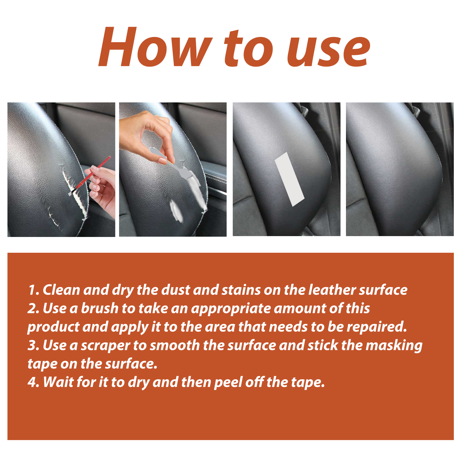Our leather fillers contain lanolin, animal protein and beeswax. It can fully maintain the leather, penetrate into the leather, and make the leather glow while filling. Its use method is very simple: first clean and dry the dust and stains on the leather surface, use a brush to take an appropriate amount of this product, apply it to the part that needs to be repaired, use a scraper to smooth the surface, and paste masking tape on the surface, wait for it to dry, and then tear off the tape. After use, it can provide protection for leather, extend the service life of leather products, and make leather more durable.