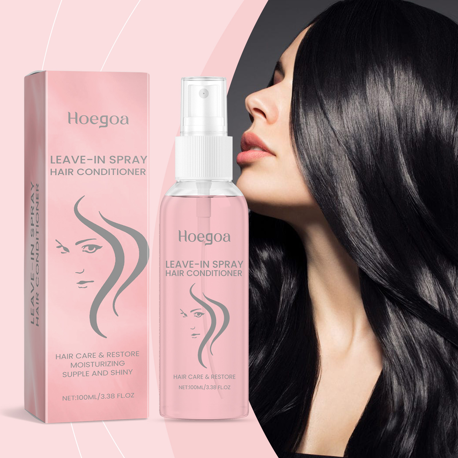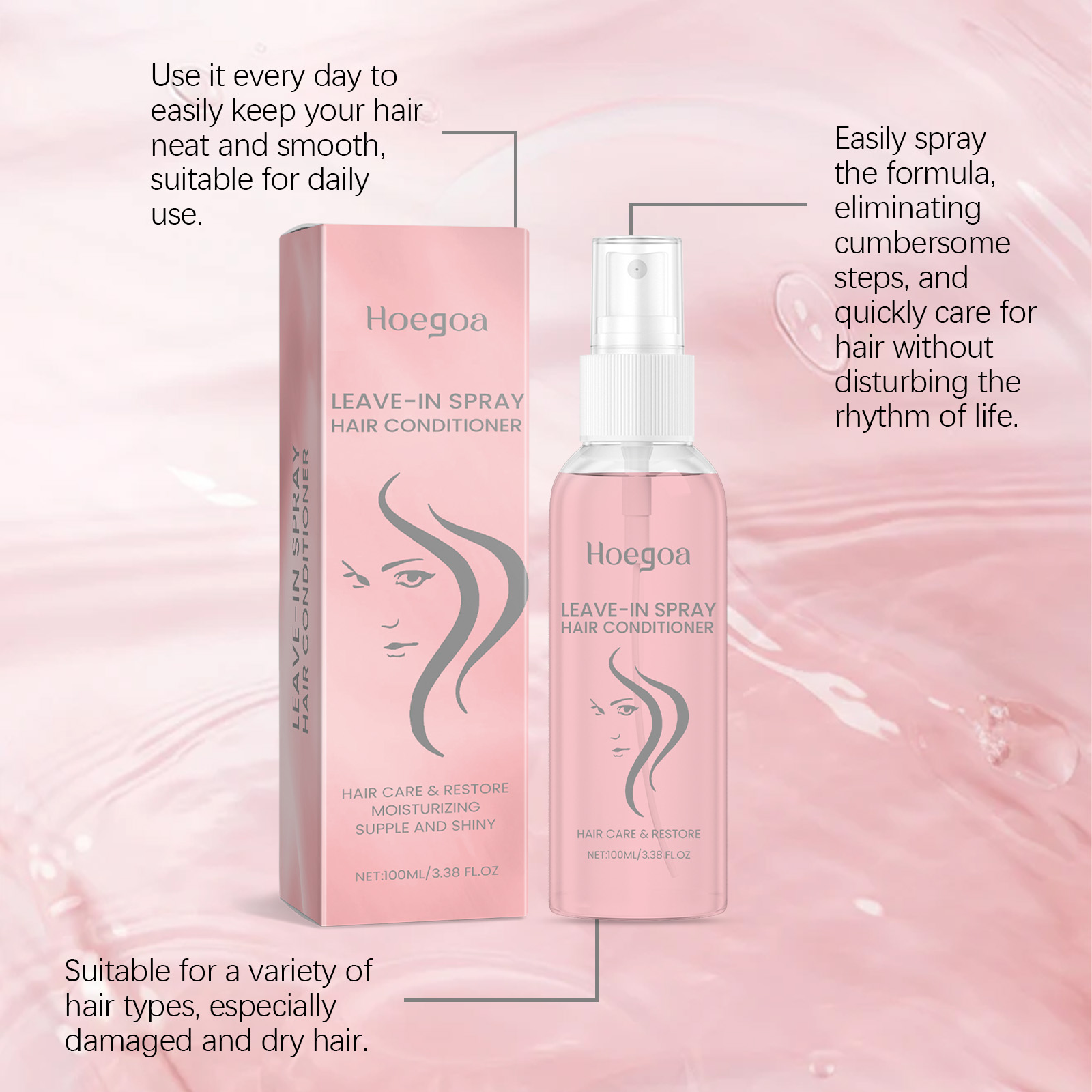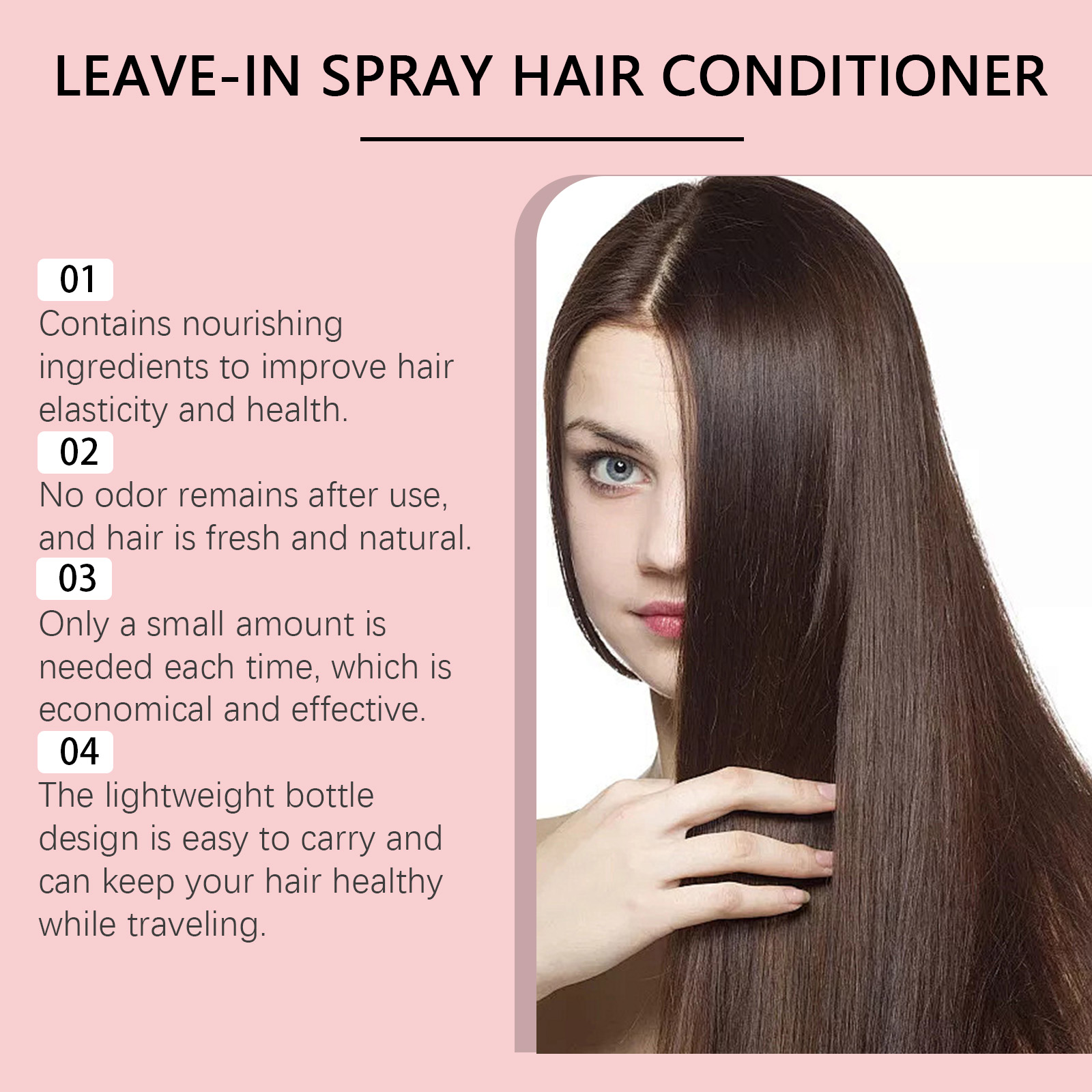 Our leave-in smoothing repair spray contains wheat amino acids, glycerin, cocamidopropyl betaine. It can help to deeply repair damaged hair, improve dryness, and keep hair smooth and healthy. Its use method is very simple: 1. Before use, gently shake the conditioner bottle and evenly spray on dry or semi-dry hair, 10-15 cm away, especially the damaged and dry parts. 2. Gently comb your hair with your fingers or a comb to evenly distribute the shampoo and get the repair ingredients deep into your hair. After use, hair will not be greasy, keep light and fluffy, and hair will flow all day long.