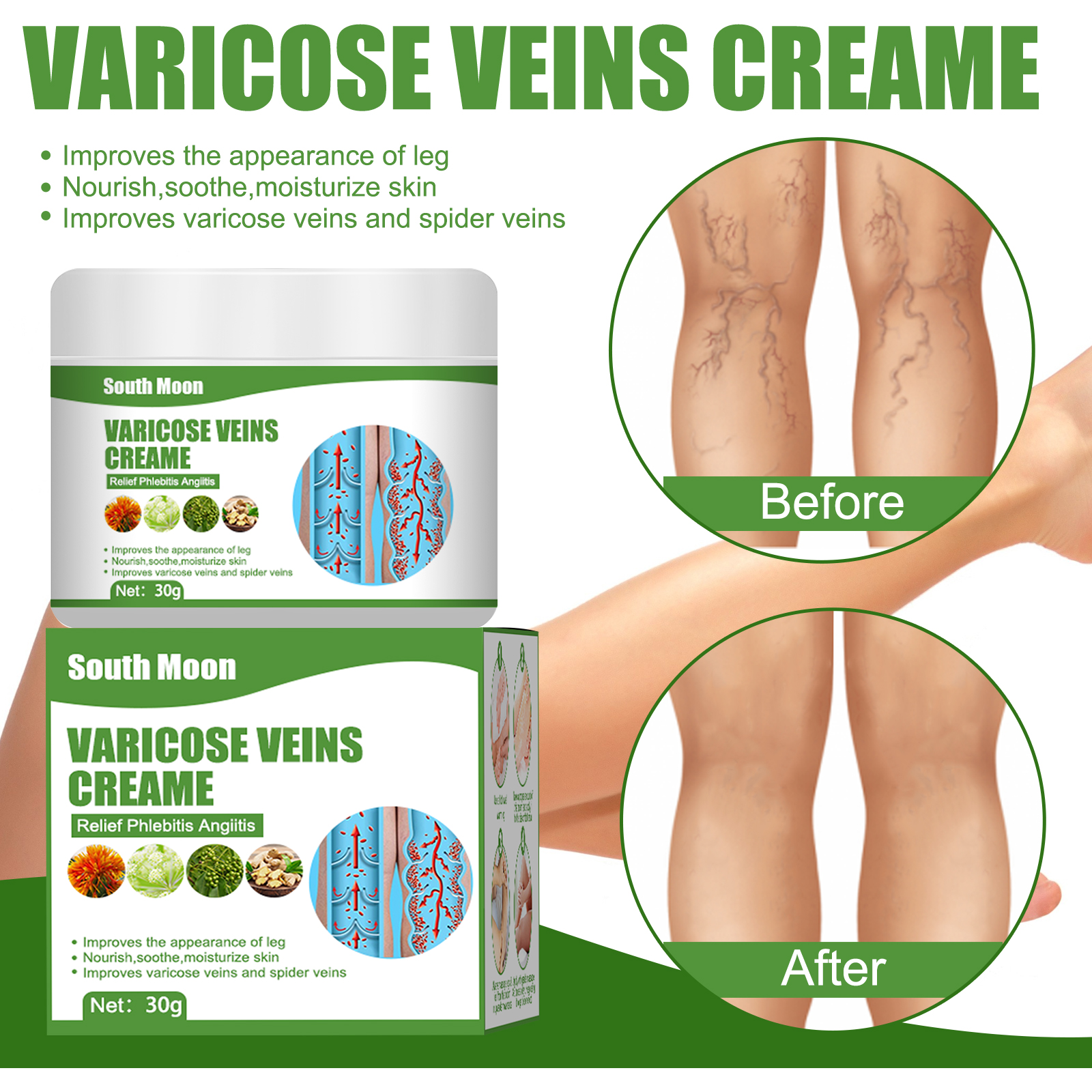 Our leg cream contains Phellodendron, angelica, safflower. It can improve the appearance of the legs, nourish, soothe and moisturize the skin, and improve varicose veins and spider veins. Its use method is very simple: 1. Warm legs with a hot towel; 2. Apply proper amount of this cream to uncomfortable areas; 3. Massage the legs and feet from the bottom up; 4. Gentle massage 3-5 times a day. Use continuously for better results. Relieve phlebitis, varicose veins.