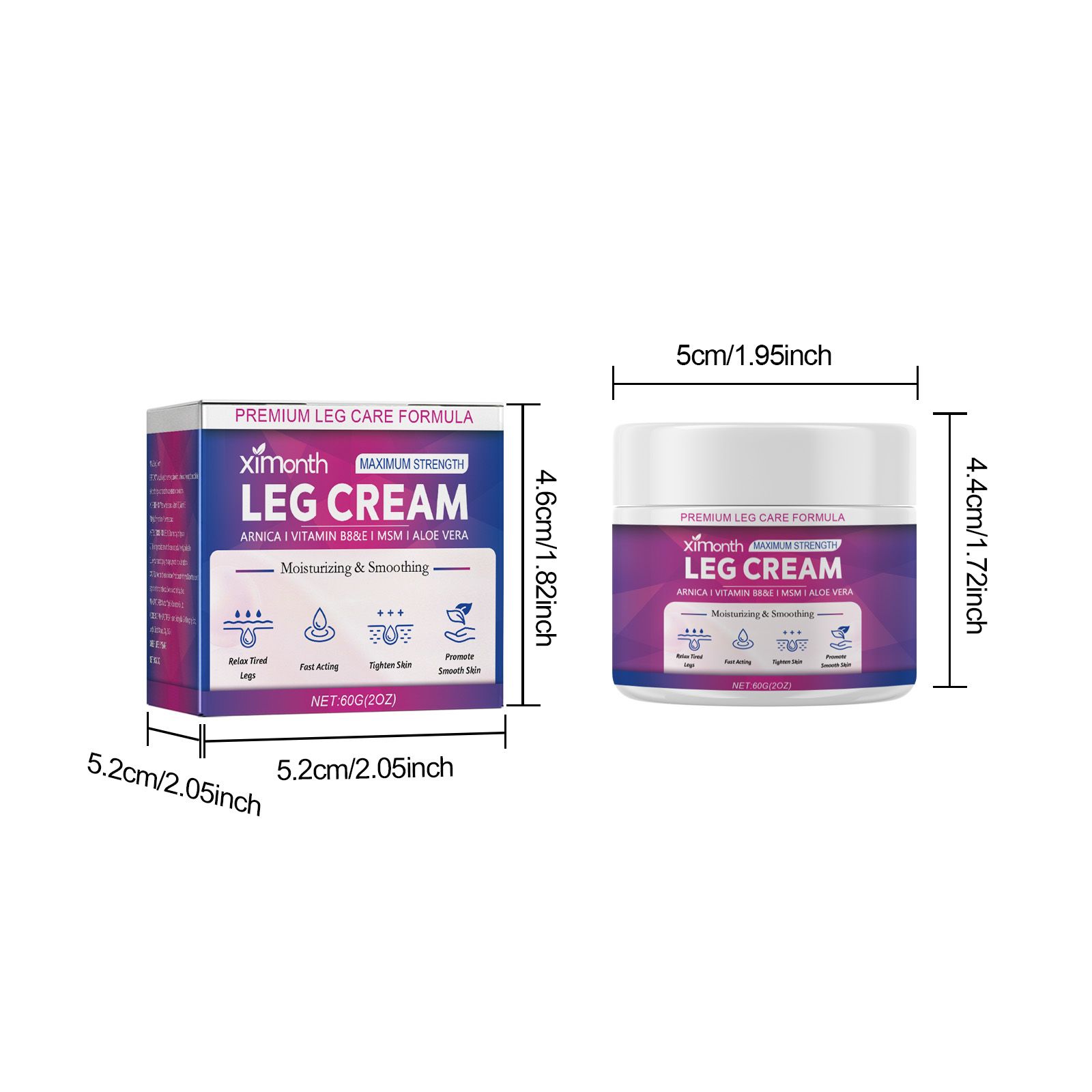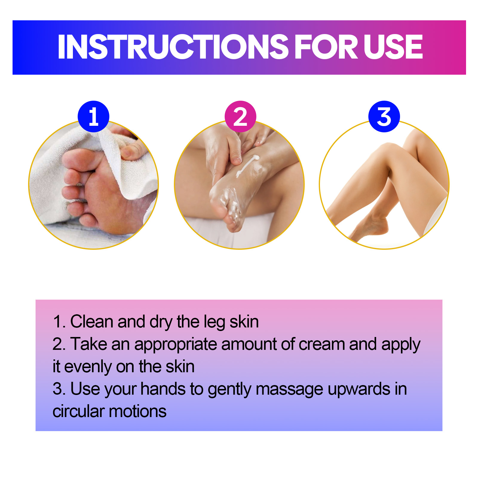 Our leg care cream contains arnica extract, vitamin B6. It can promote firming, plump skin and calming blood circulation. Its application method is very simple: 1. Clean and dry the leg skin.2. Apply an appropriate amount of cream evenly to the skin. 3. Gently massage upward with your hands in circular motions. It can also enhance capillary health and improve blood circulation.