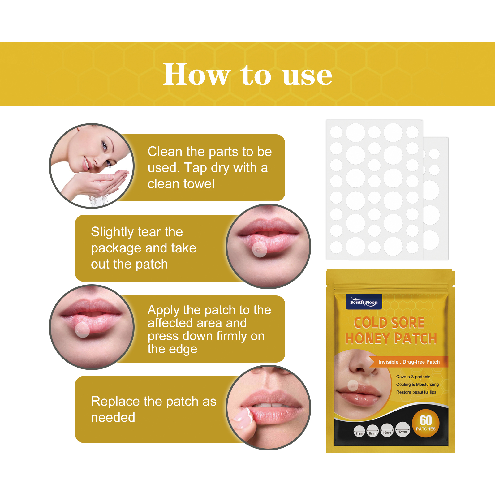Our mouth blister patches contain hydrocolloids, honey extracts. It soothes mouth blisters and restores herpes. Its use method is very simple: 1. Clean the parts to be used; 2. Dry with a clean towel. 3. Gently tear the package and remove the patch. 4. Apply the patch to the affected area and press firmly on the edge; 5. Replace the patch as required. Mouth blister Patches provide 3-in-1 comfort and protect your blisters with advanced hydrocolloid technology. As a protective layer, our honey hydrocolloid patch creates an ideal environment for absorbing cold sore secretions and helps prevent further blistering.