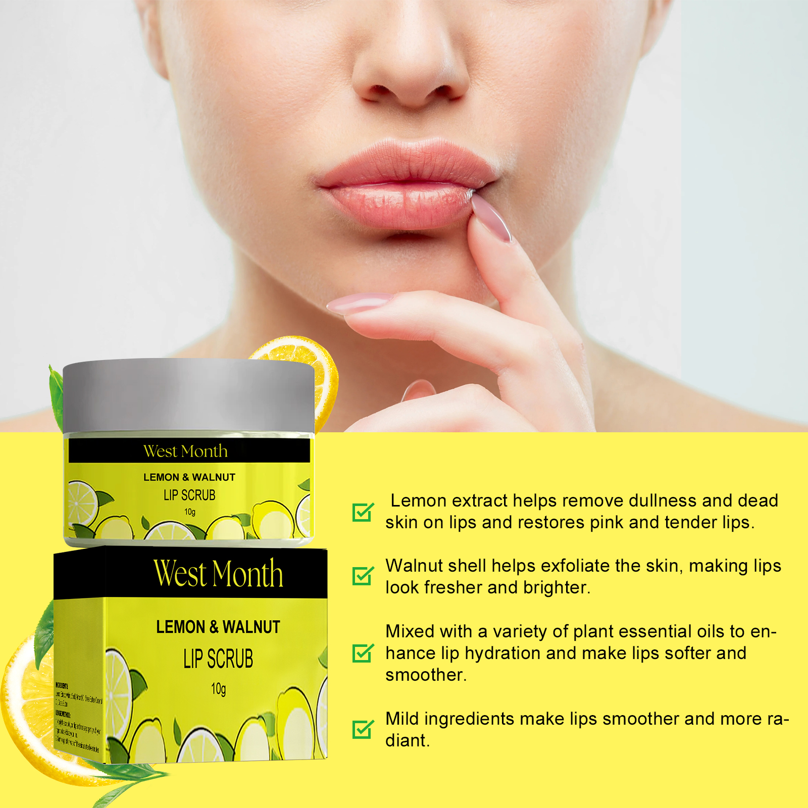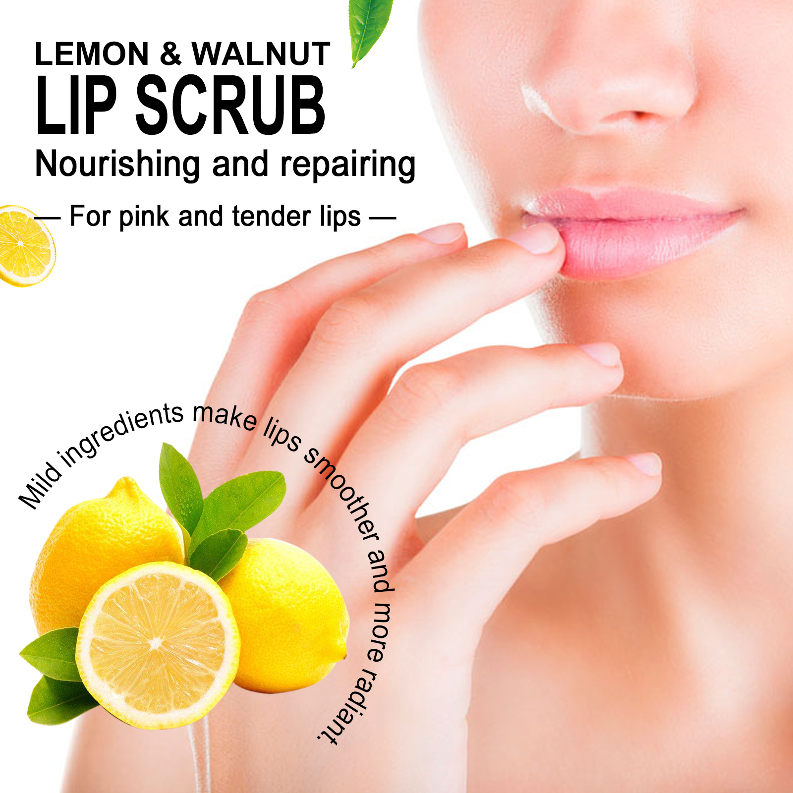 Our lip scrub contains lemon extract, walnut shell and almond oil. It can help remove dull lips and dead skin, restore red and tender lips, help exfoliate, make lips look fresher and brighter, enhance lip moisture, and make lips softer, smoother and more shiny. Its application is simple: apply the scrub to your lips, massage it gently with your fingertips, and after five minutes gently wipe or wash away the residue. And it moisturizes your lips.