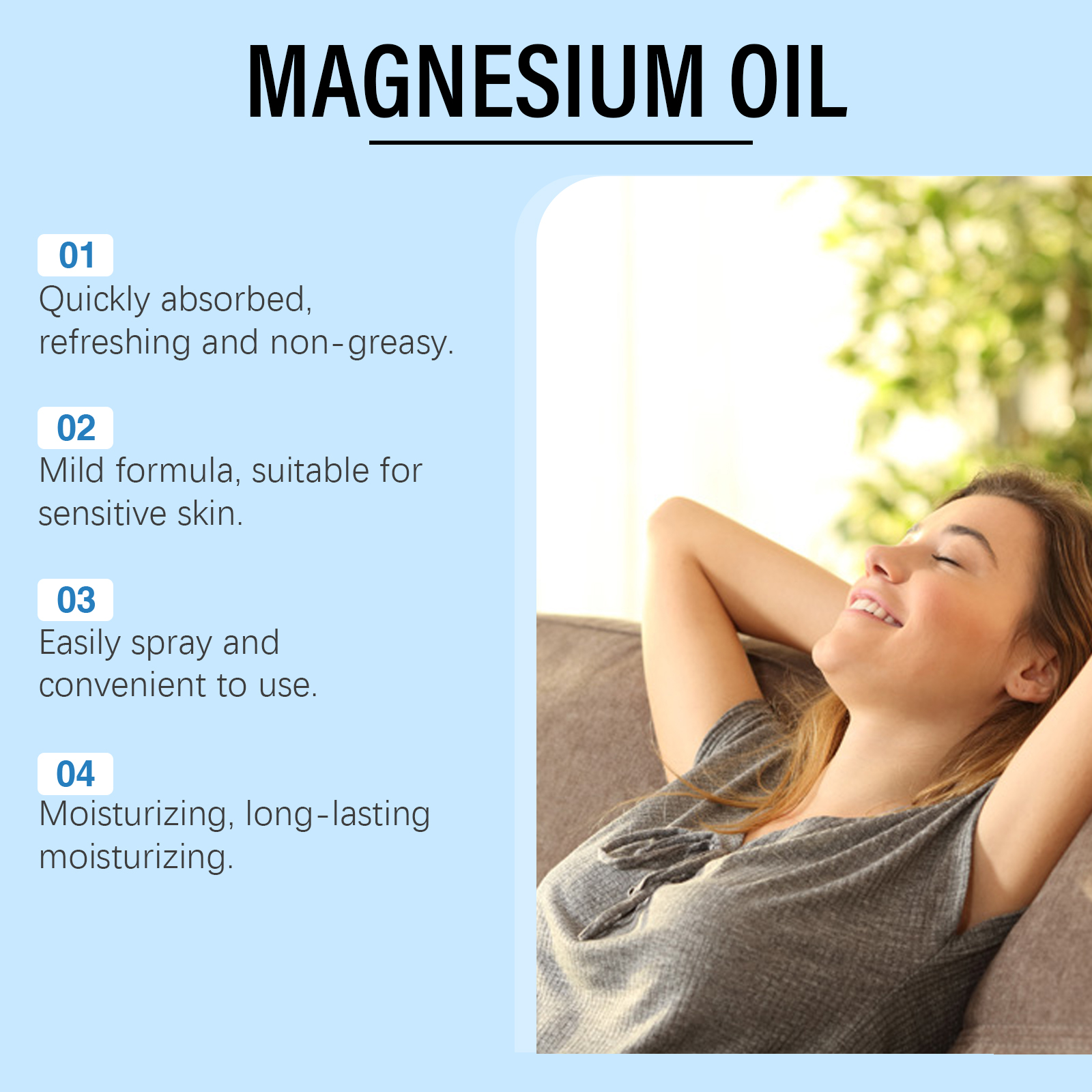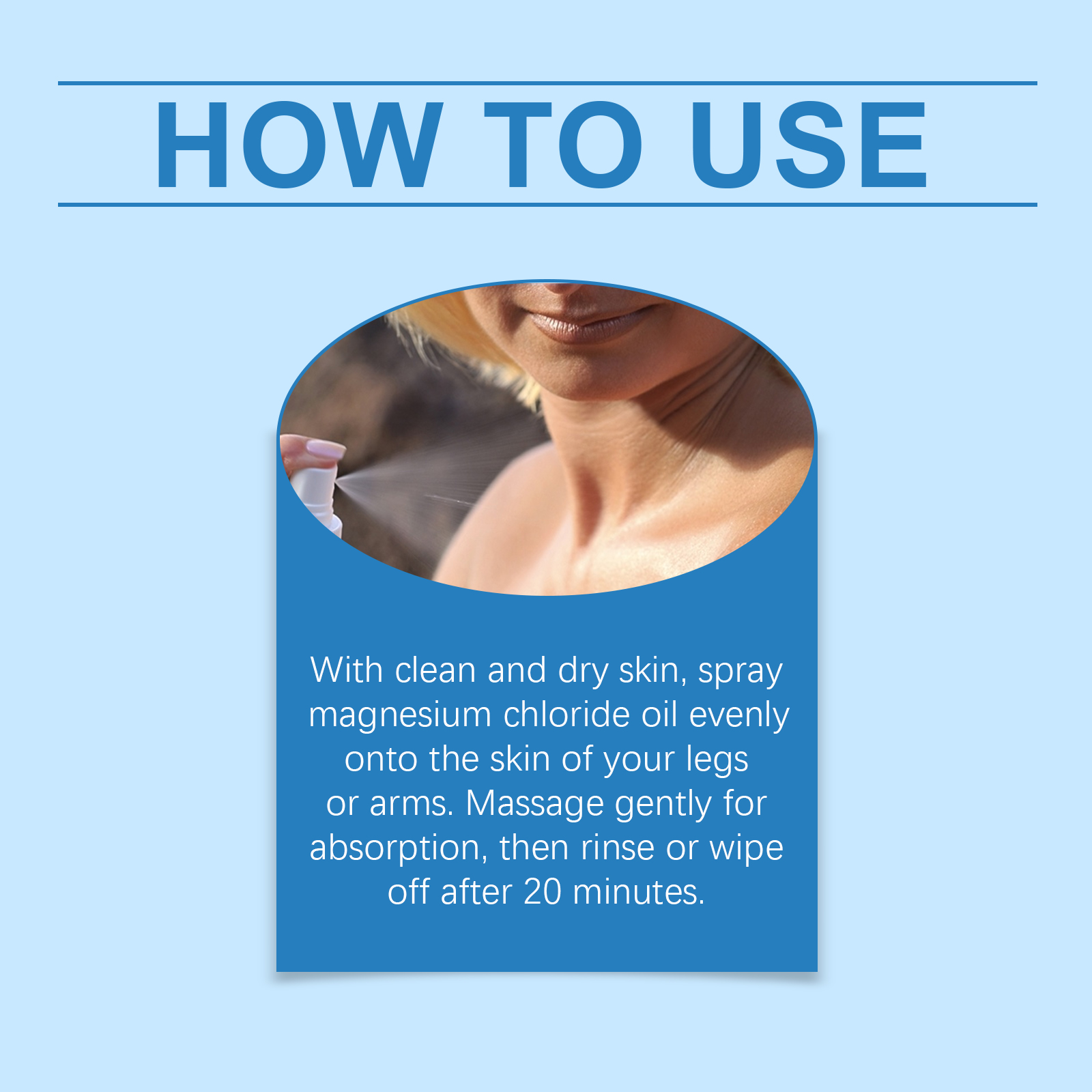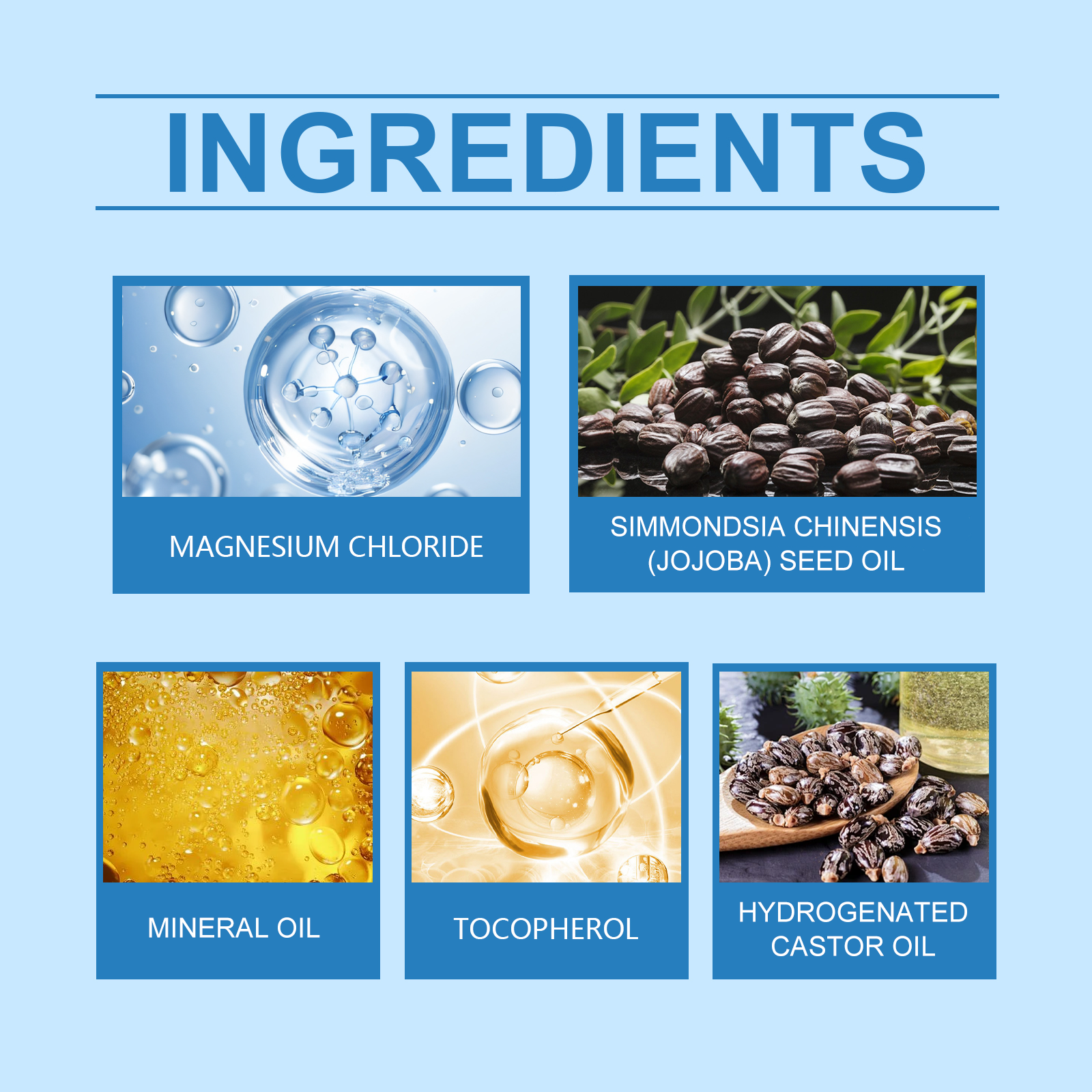 Our magnesium chloride oil spray contains tocopherol (vitamin E), magnesium chloride. It provides a long-lasting moisturizing effect, keeping skin hydrated with a light formula that does not clog pores. Its application is simple: to clean dry skin, spray magnesium chloride oil evenly on the legs or arms. Massage gently until absorbed. Rinse or wipe off after 20 minutes. And it can reduce the discomfort caused by dry skin.