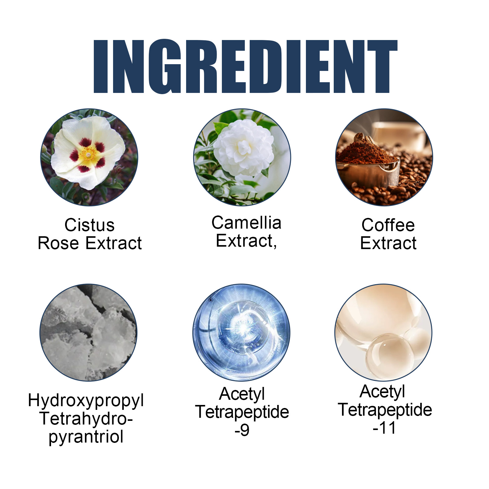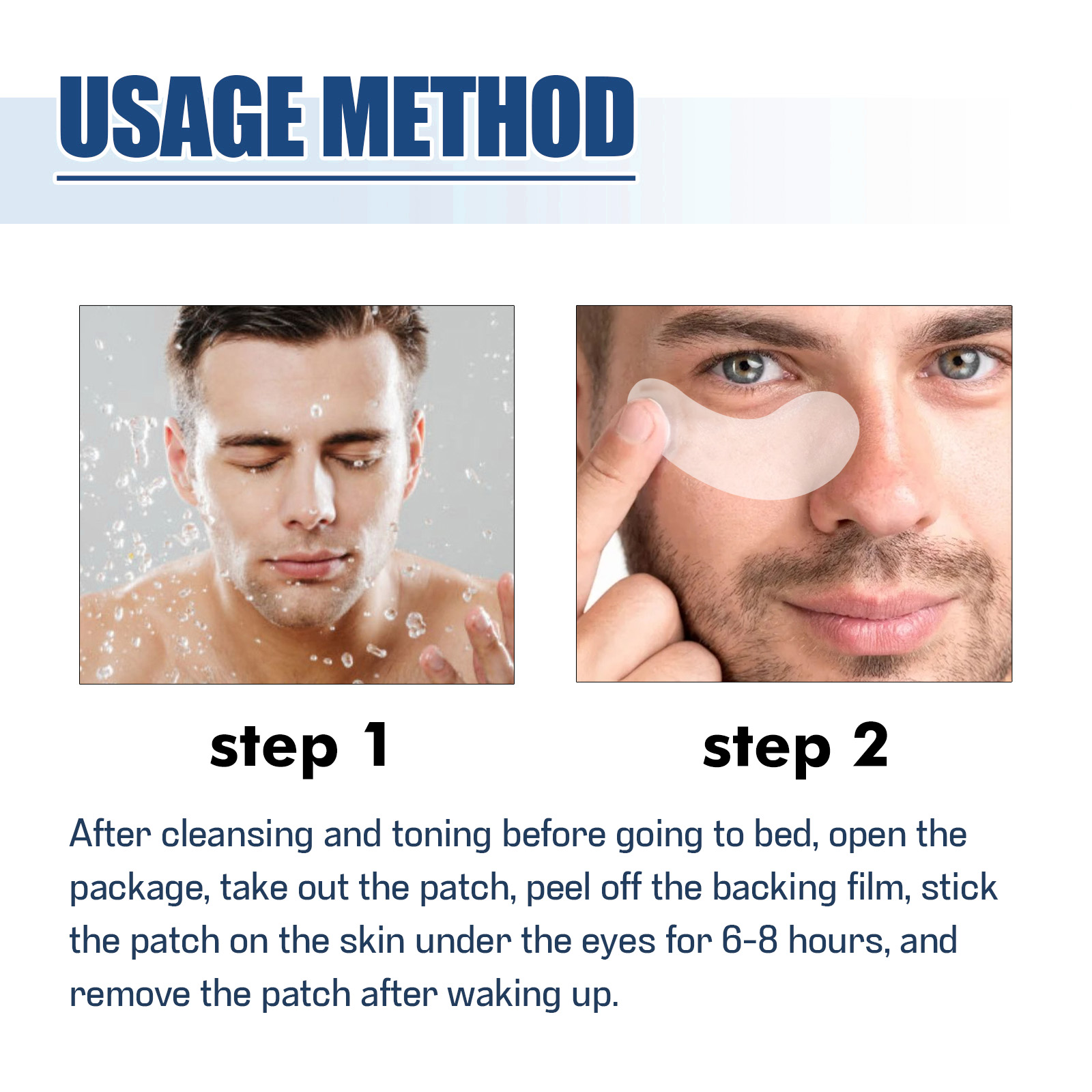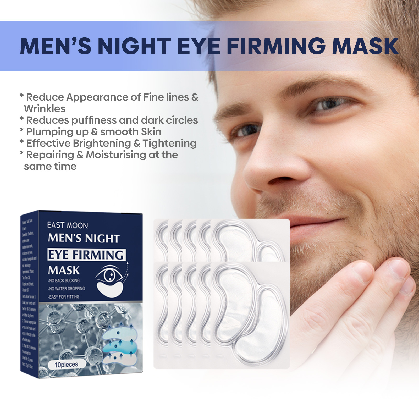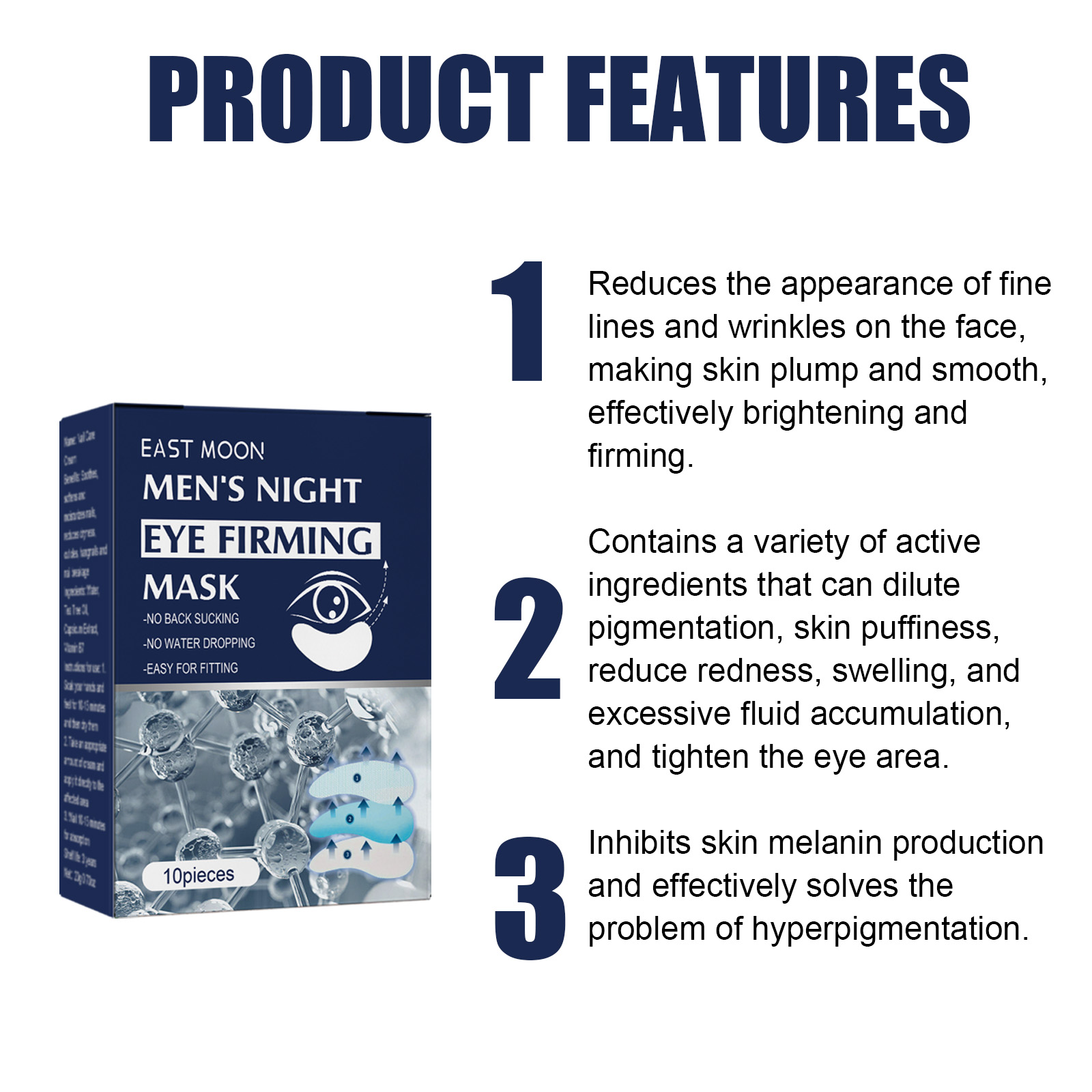 Our Men's Night Eye Firming Mask contain Acelyl Tetrapeptide-11, Acety!Tetrapeptide-9, Hydroxypro-Pyl Tetrahydropyrantriol. It can reduce the appearance of fine lines and wrinkles on the face. Make the skin plump and smooth, effectively brighten and tighten, this product contains a variety of active ingredients, can reduce pigmentation, skin puffiness, reduce redness, edema and excessive fluid accumulation, tighten the skin around the eyes. Its use method is very simple: after cleansing and toning before going to bed, open the package, take out the eye patch, tear off the back film, stick the eye patch on the skin under the eye, keep it for 6-8 hours, and remove it after waking up. It can inhibit the production of melanin in the skin and effectively solve the problem of pigmentation.