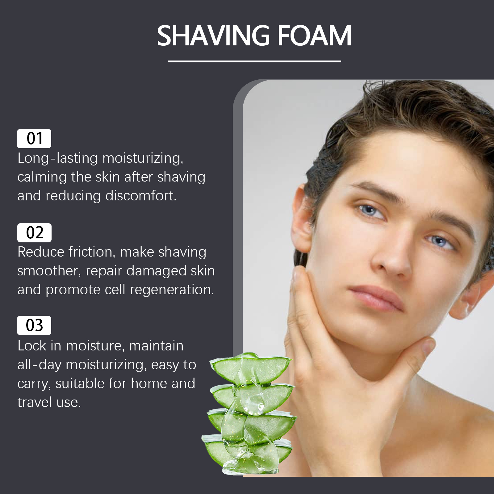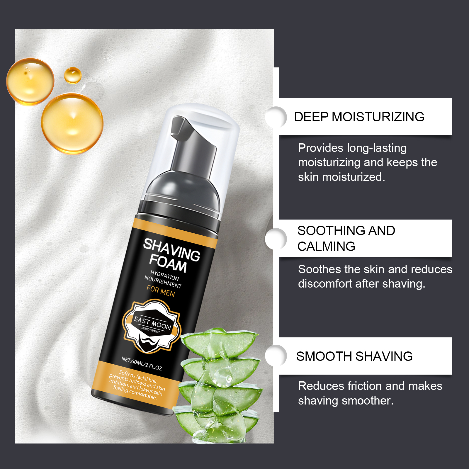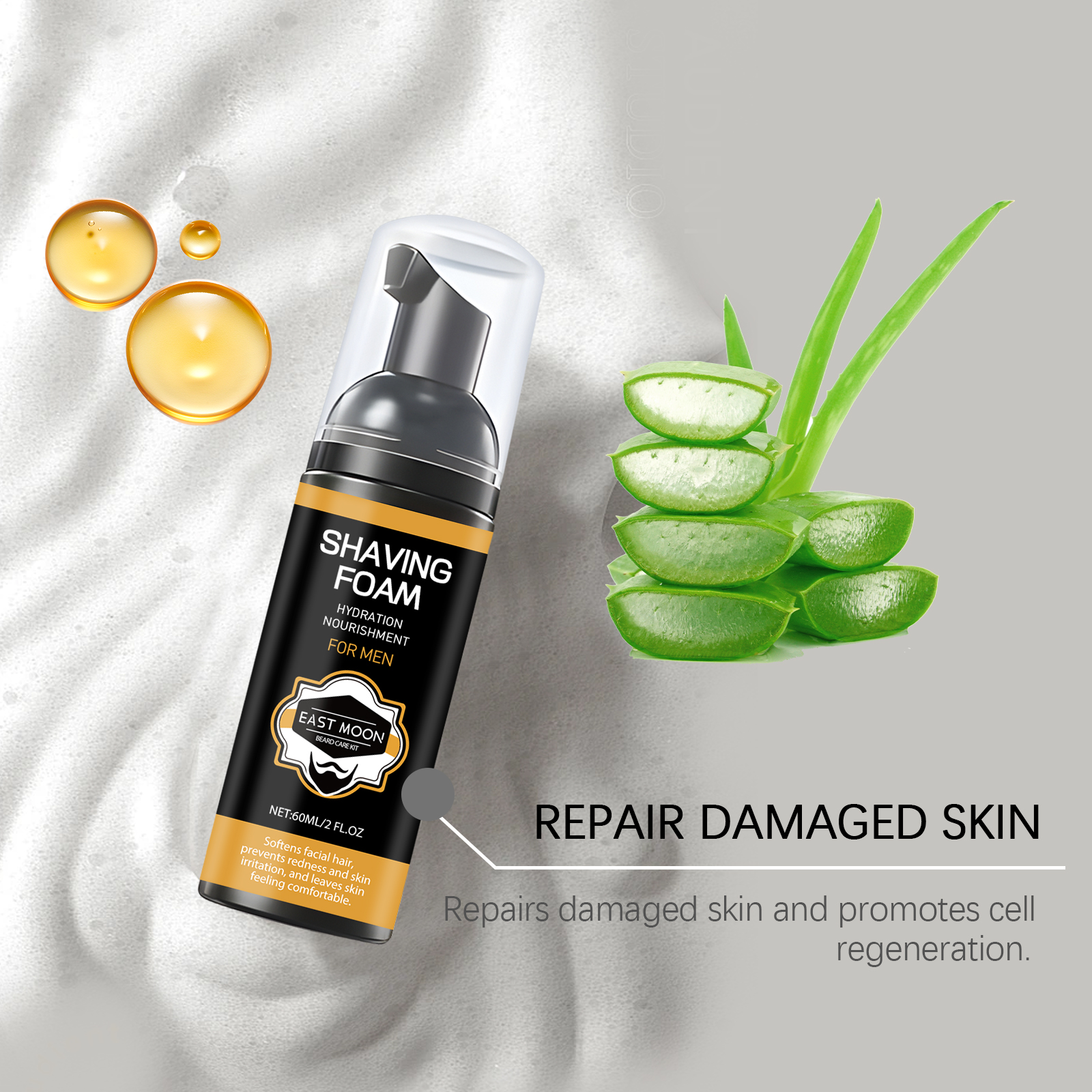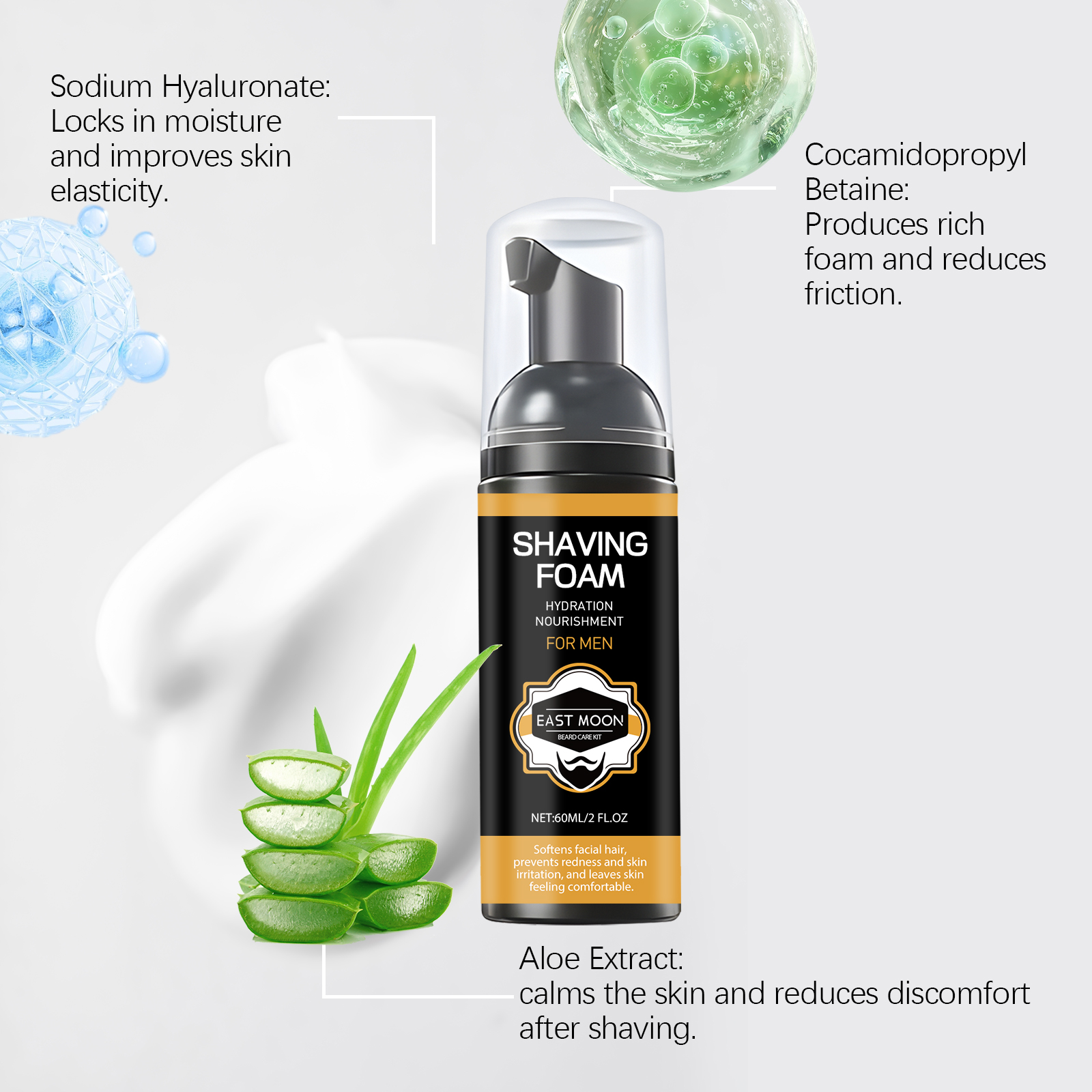 Our pre-shave foam contains glycerin, cocamidopropyl betaine, aloe vera extract. It provides long-lasting moisture and keeps the skin moisturized; Soothe skin and reduce discomfort after shaving; Reduces friction and makes it smooth. Its application method is very simple: thoroughly clean the shaving area with warm water, apply an appropriate amount of this product evenly to the beard, then shave with a razor, and finally wash your face. Locks in moisture and improves skin elasticity. Suitable for all shaving tools, including electric shavers and manual shavers.