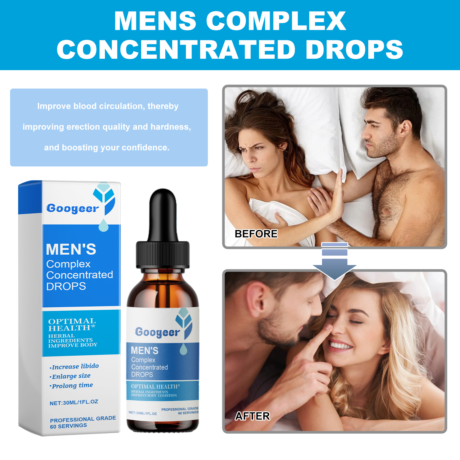 Our Men's Complex Concentrated Drops contain Ginseng Extract, Maca Root Extract, Ginkgo Leaf Extract. It can improve blood circulation, thereby improving the quality and hardness of erections and boosting your confidence. Its use is very simple: shake well before eating, take 1-2 drops each time, 1-2 times a day. This product works fast, increases capacity in a short period of time, and is rich in plant ingredients to make you feel more confident after eating.