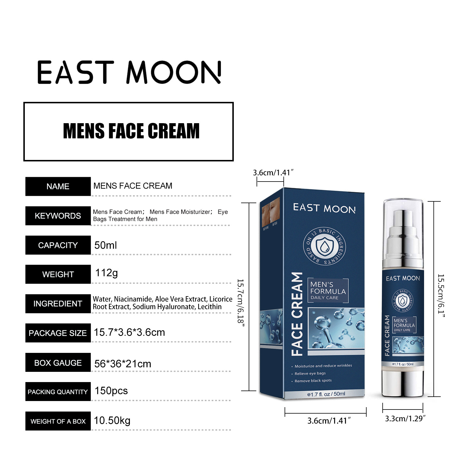 Our men's facial moisturizer contains niacinamide, aloe vera extract, Licorice root extract. It reduces wrinkles, relieves bags under the eyes and removes dark spots, soothes post-shave skin, moisturizes the skin and restores skin moisture levels while brightening the complexion and helping to treat bags under the eyes caused by an active lifestyle and lack of sleep. Its use method is very simple: after cleansing and toning, take appropriate amount of cream evenly apply on the face and neck, gently wipe and press, so that the skin can fully absorb. It can reduce all kinds of facial wrinkles and fine lines, deeply moisturize, nourish the skin, and effectively improve the skin quality.