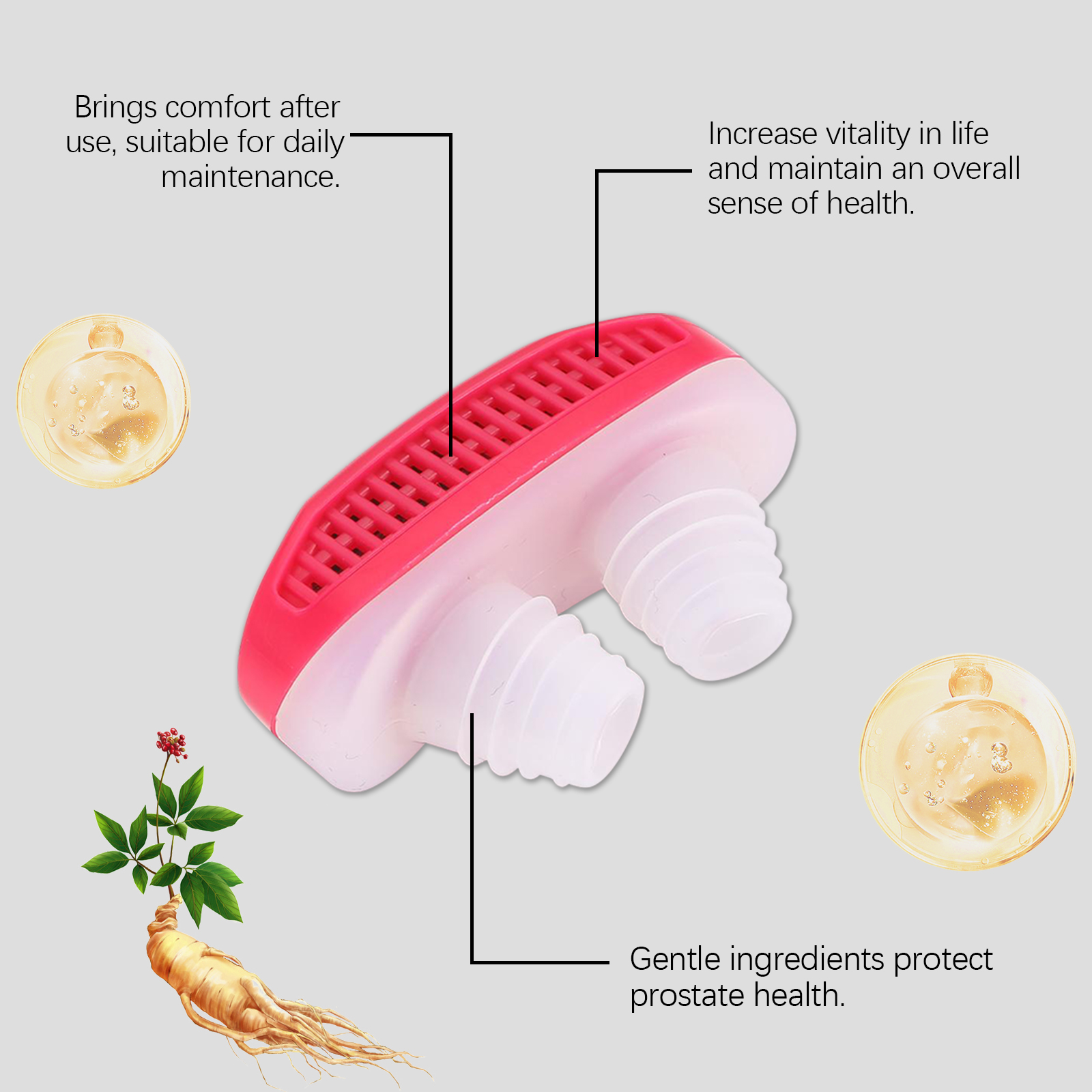 Our men's care products contain Cornus officinalis fruit extract, Angelica sinensis extract, ginseng extract. It can help improve prostate health. Its application is simple: Breathe in directly under your nose for 15 minutes to feel soothing. It can also help improve local blood circulation and improve overall comfort.