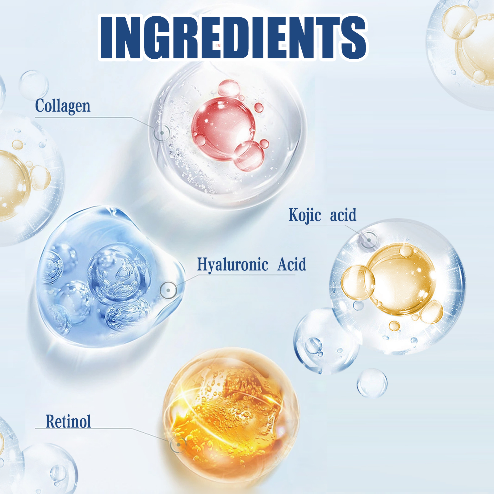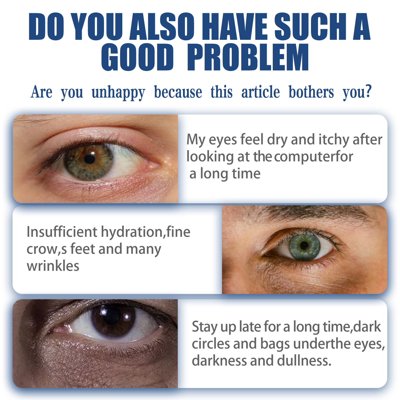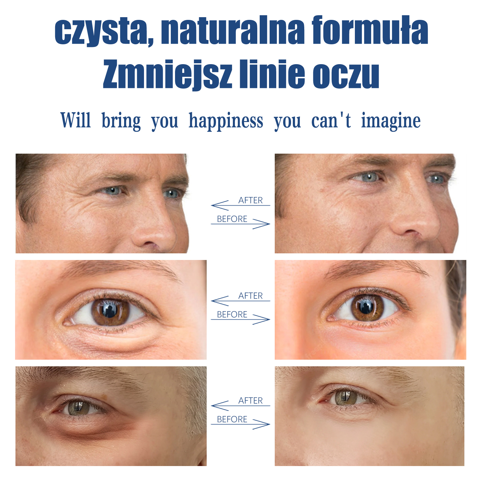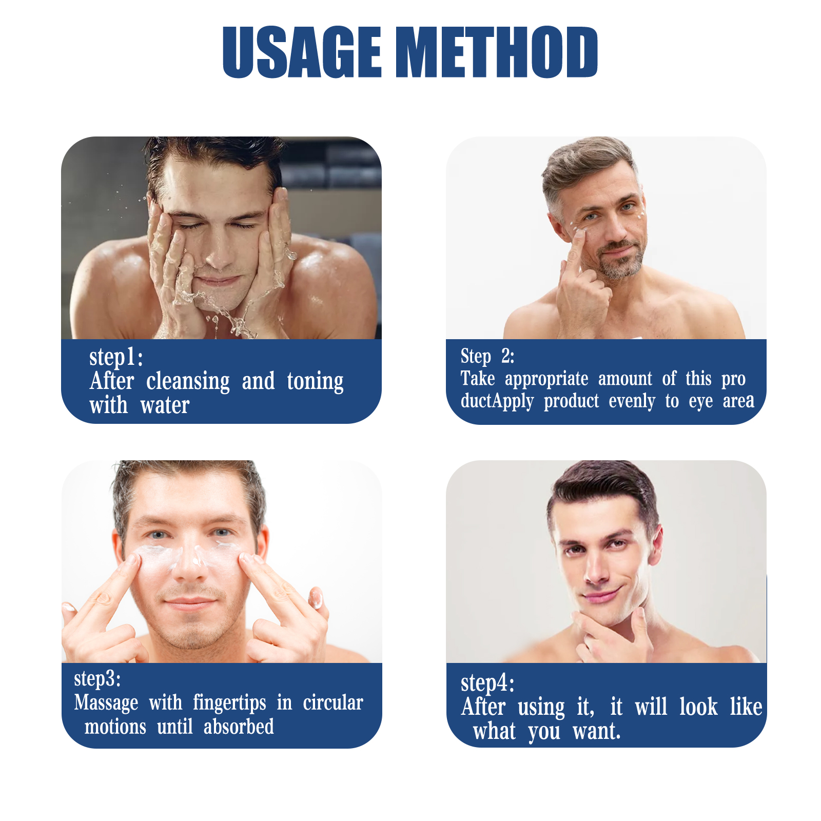 Our men's retinol eye cream contains kojic acid, collagen. It can help tighten the eye area, reduce eye dimness, reduce eye wrinkles, make your eyes brighter and make you look younger. Its use is very simple: the first step, after cleaning and conditioning with water. The second step, take appropriate amount of this product evenly apply to the eyes. The third step, use the fingertips to make a circular massage until absorbed. Step four, after you use it, you'll look exactly like you want. And silky and moist, easy to absorb, moisturizing without greasy, make the skin moist and plump.
