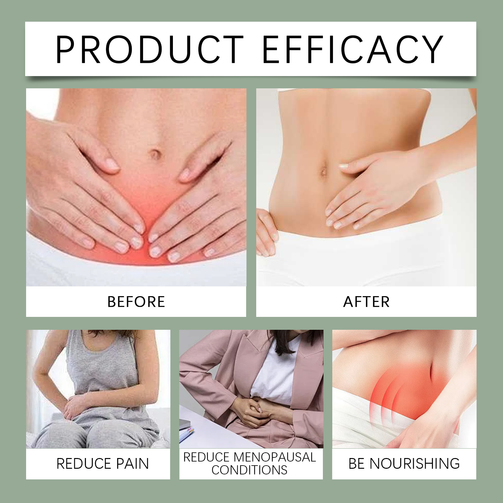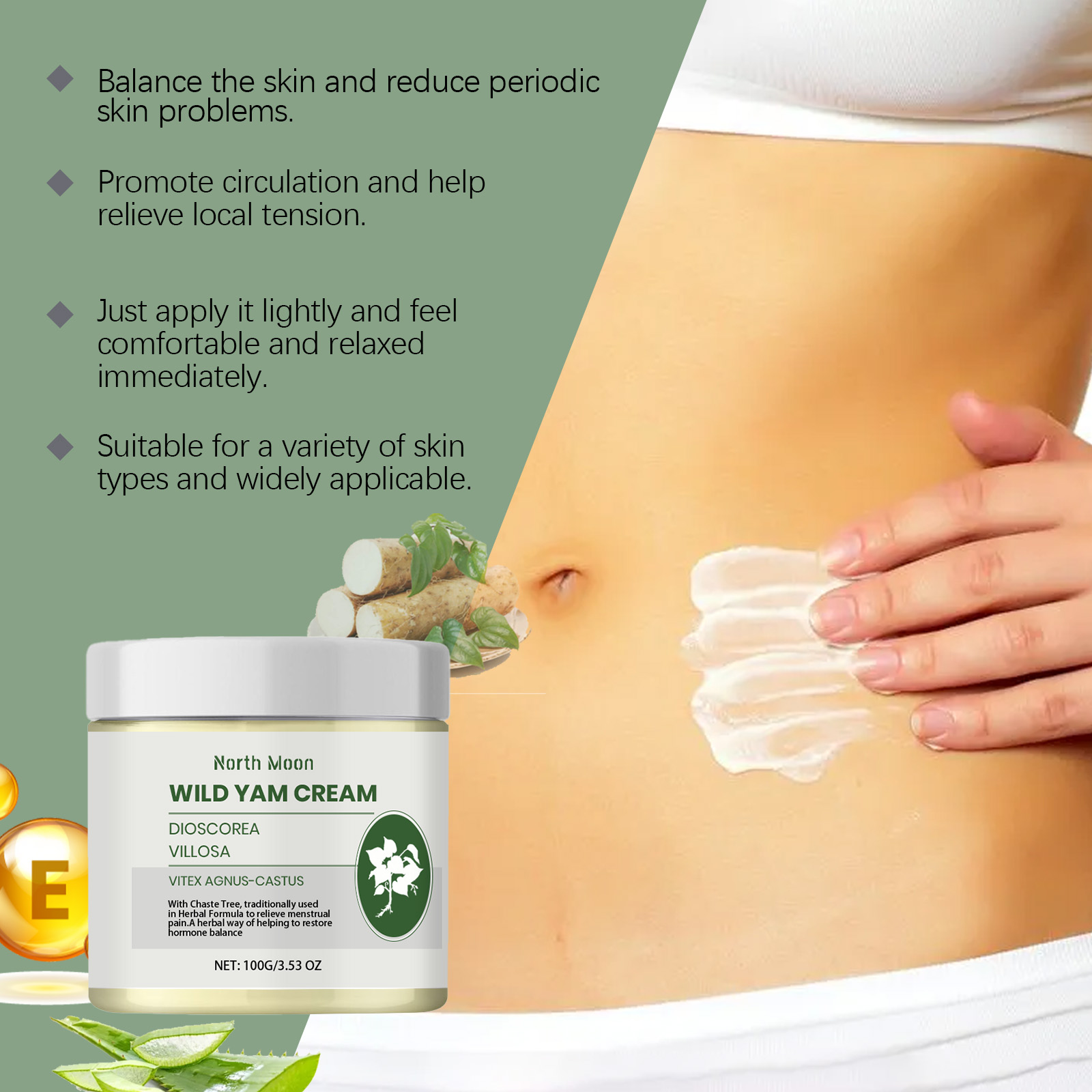 Our menstrual care ointment contains yam extract, aloe vera leaf extract and holy berry fruit extract. It can be quickly absorbed by the skin. Aloe vera extract soothes the skin, reducing redness and discomfort; Designed for menstrual discomfort, effective relief of symptoms. Its application method is very simple: 1. Clean and dry the skin around the eyes; 2. Apply appropriate amount of the product evenly on the lower abdomen; 3. Gently massage until absorbed. Designed for menstrual discomfort, effective relief of symptoms. Provides essential nutrients to keep skin healthy.