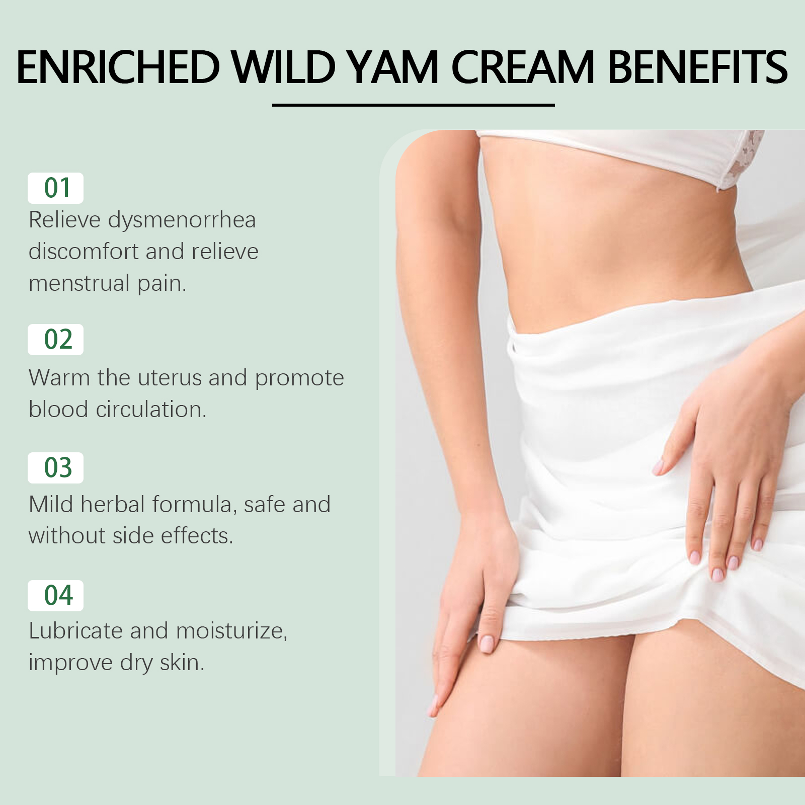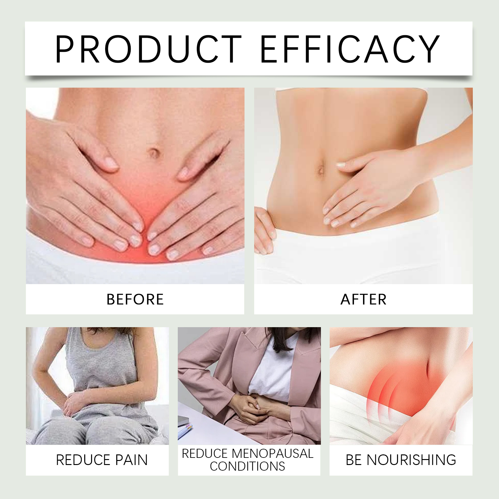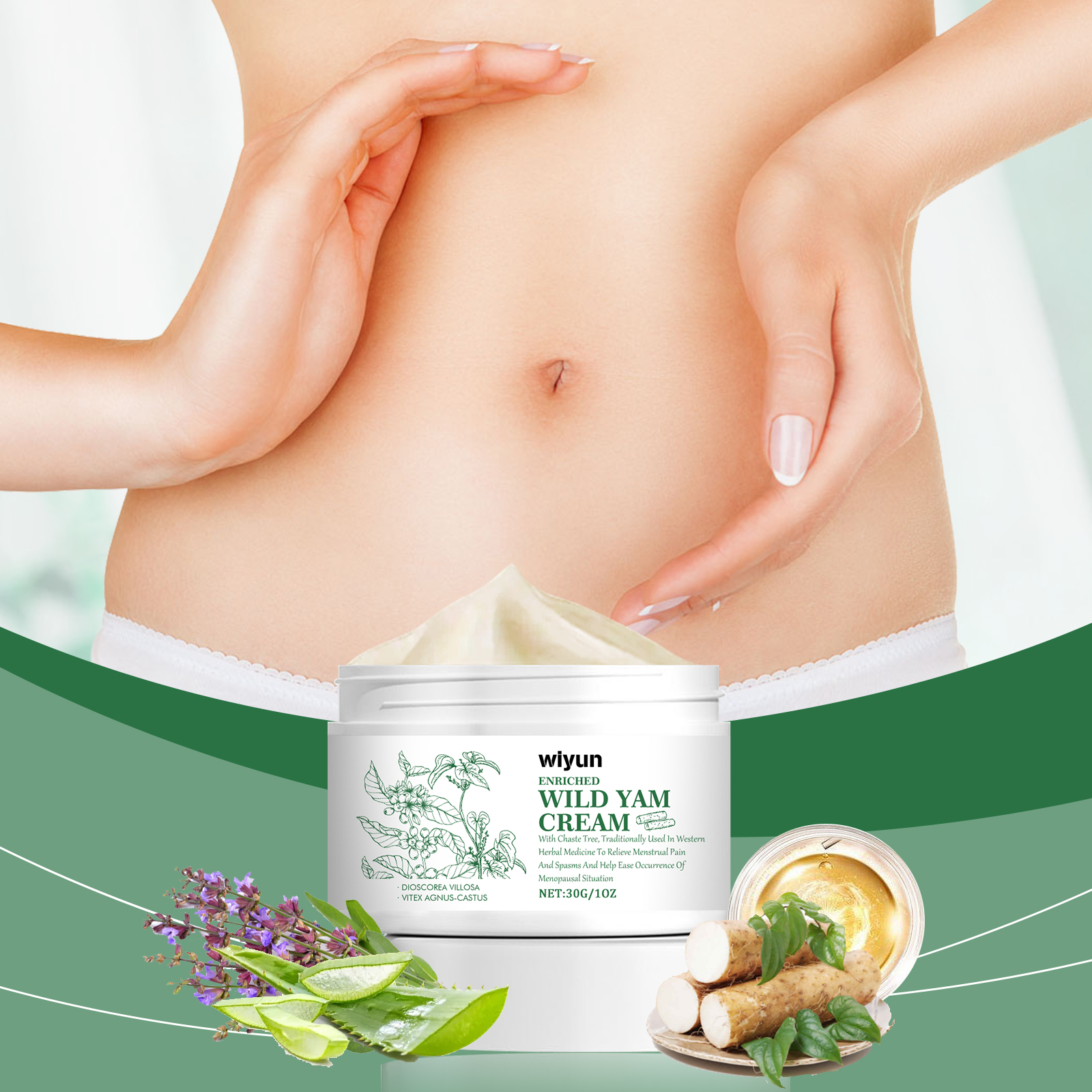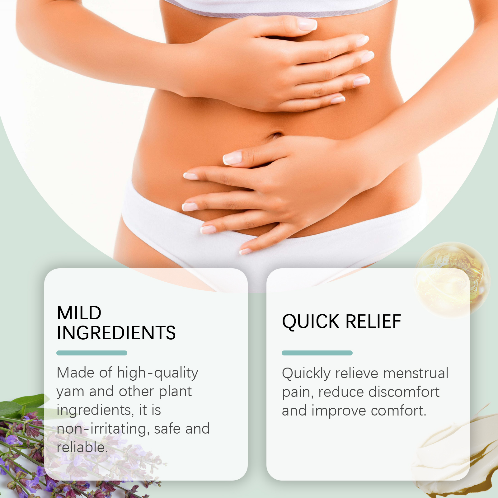 Our menstrual relief ointment contains dioscorea extract, vitex extract, aloe leaf extract. It can improve blood circulation, help relieve cold during menstruation, and keep the body warm. Easy to use, fine texture, easy to apply, anytime, anywhere to relieve menstrual discomfort. Its application method is very simple: 1. Thoroughly clean the body skin, and then dry it; 2. Apply appropriate amount of the product evenly on the lower abdomen and back skin; 3. Gently massage until fully absorbed. Period Relief ointment is made from high-quality yams and other plant ingredients, non-irritating, safe and reliable. Quickly relieve menstrual pain, reduce discomfort, and improve comfort.