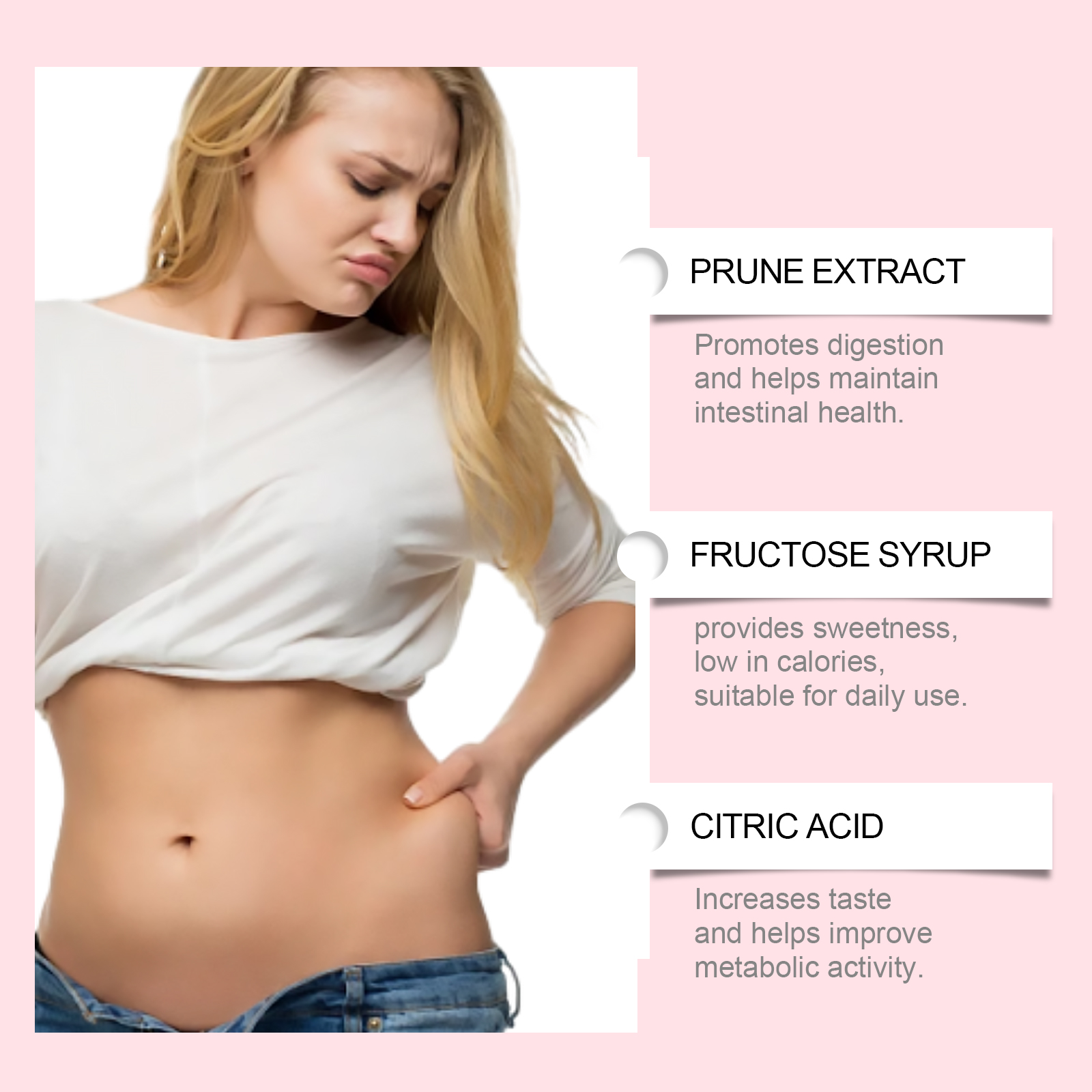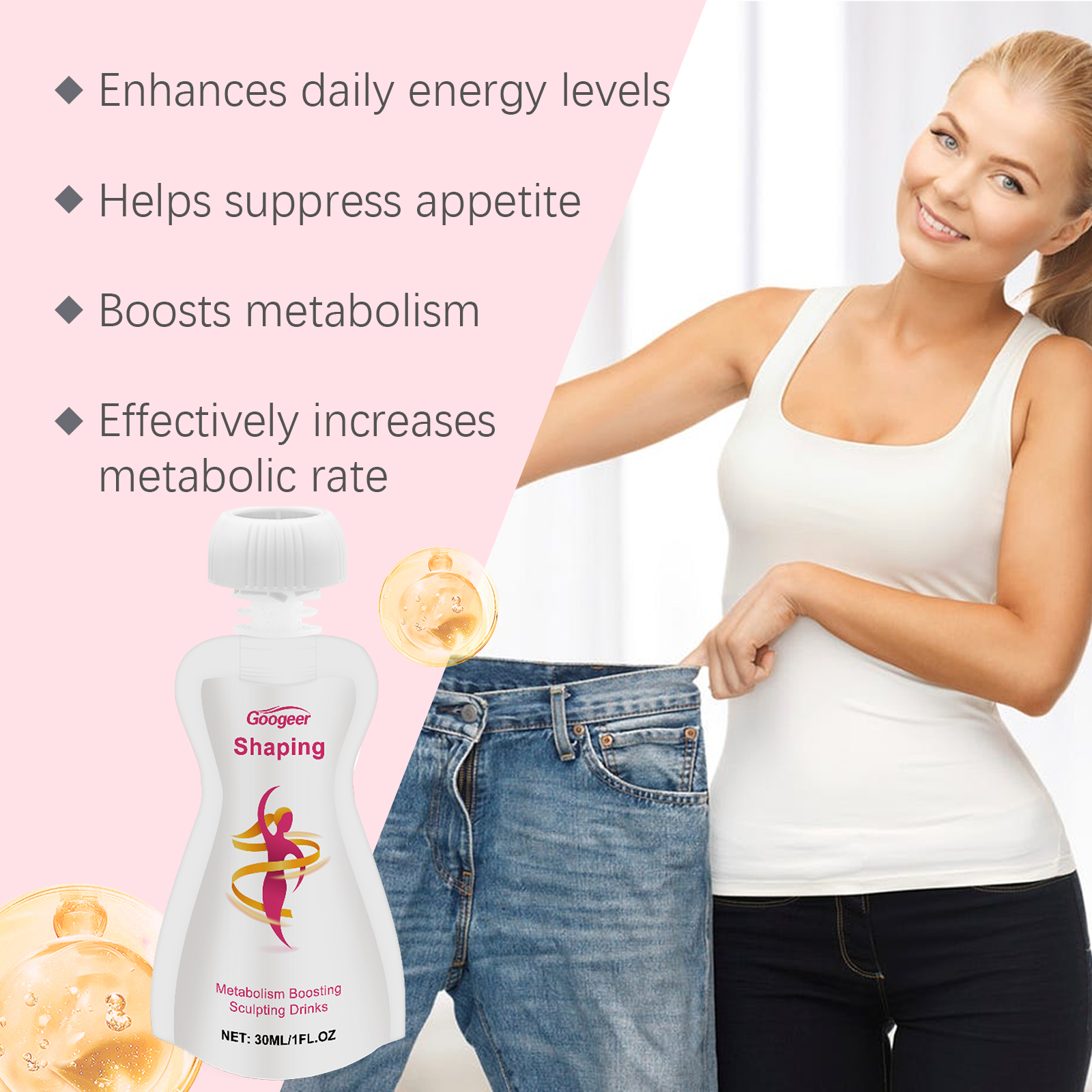 Our metabolism boosting shaping drink contains prune extract, high fructose corn syrup, citric acid. It can speed up the body's metabolism to increase energy expenditure and help health. Support a healthy lifestyle and help achieve an ideal weight. Help to reduce hunger, easy to manage diet, suitable for drinking before and after exercise to enhance the effect of exercise. The way to use it is simple: only drink one pack a day. And can activate the fat burning mechanism, support the body building goal suitable for daily drinking, easy to integrate into life.