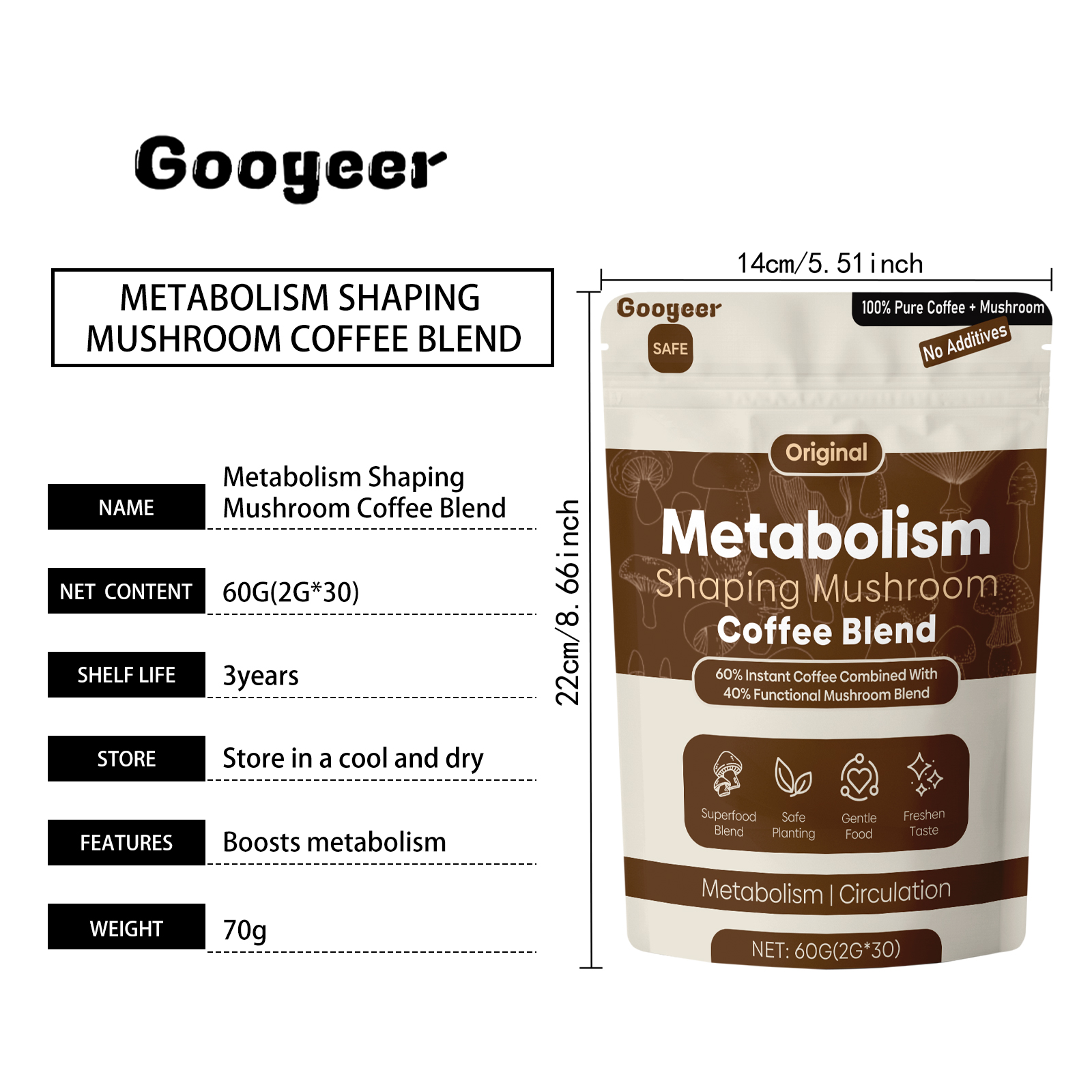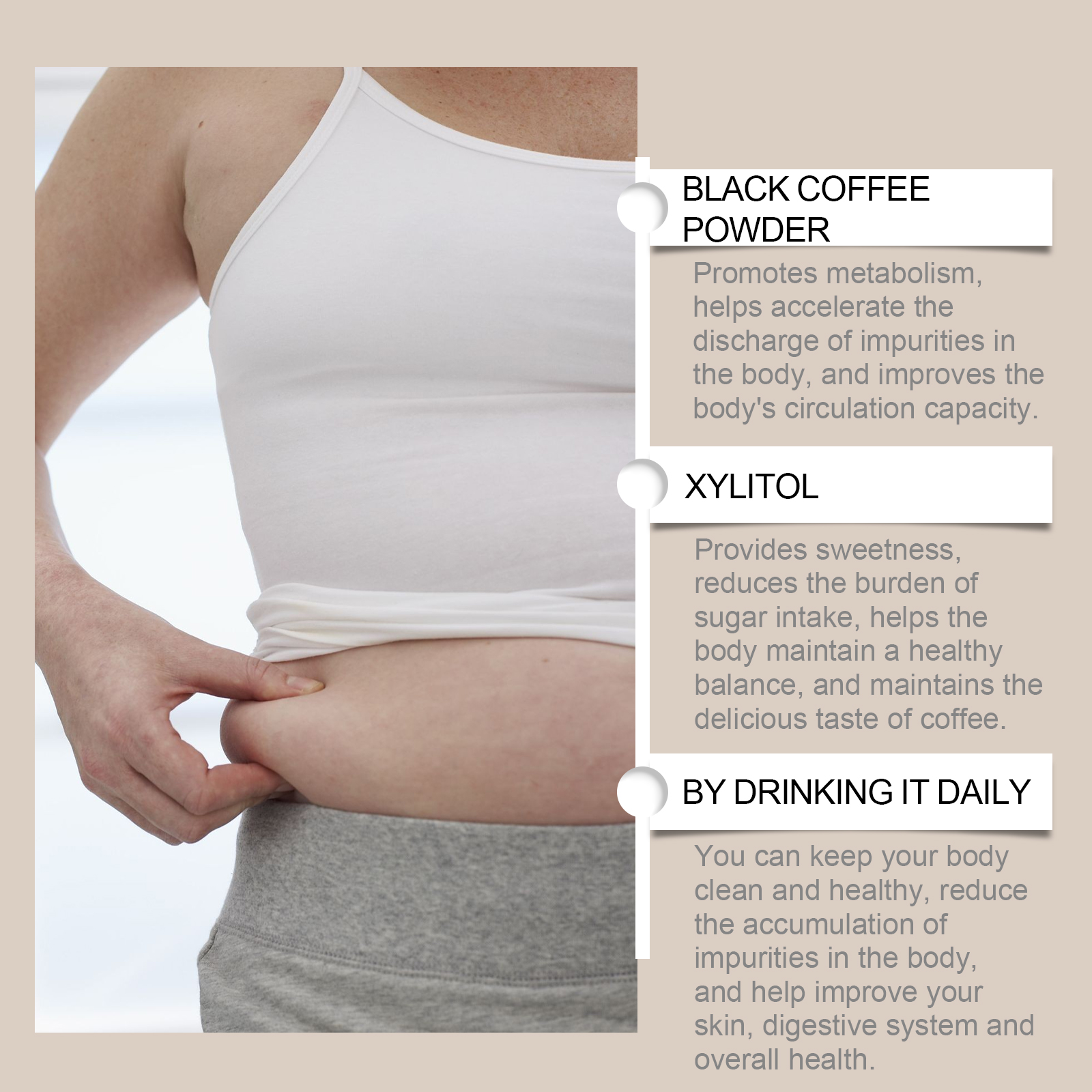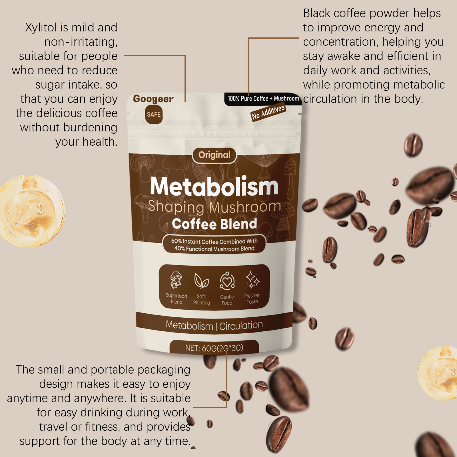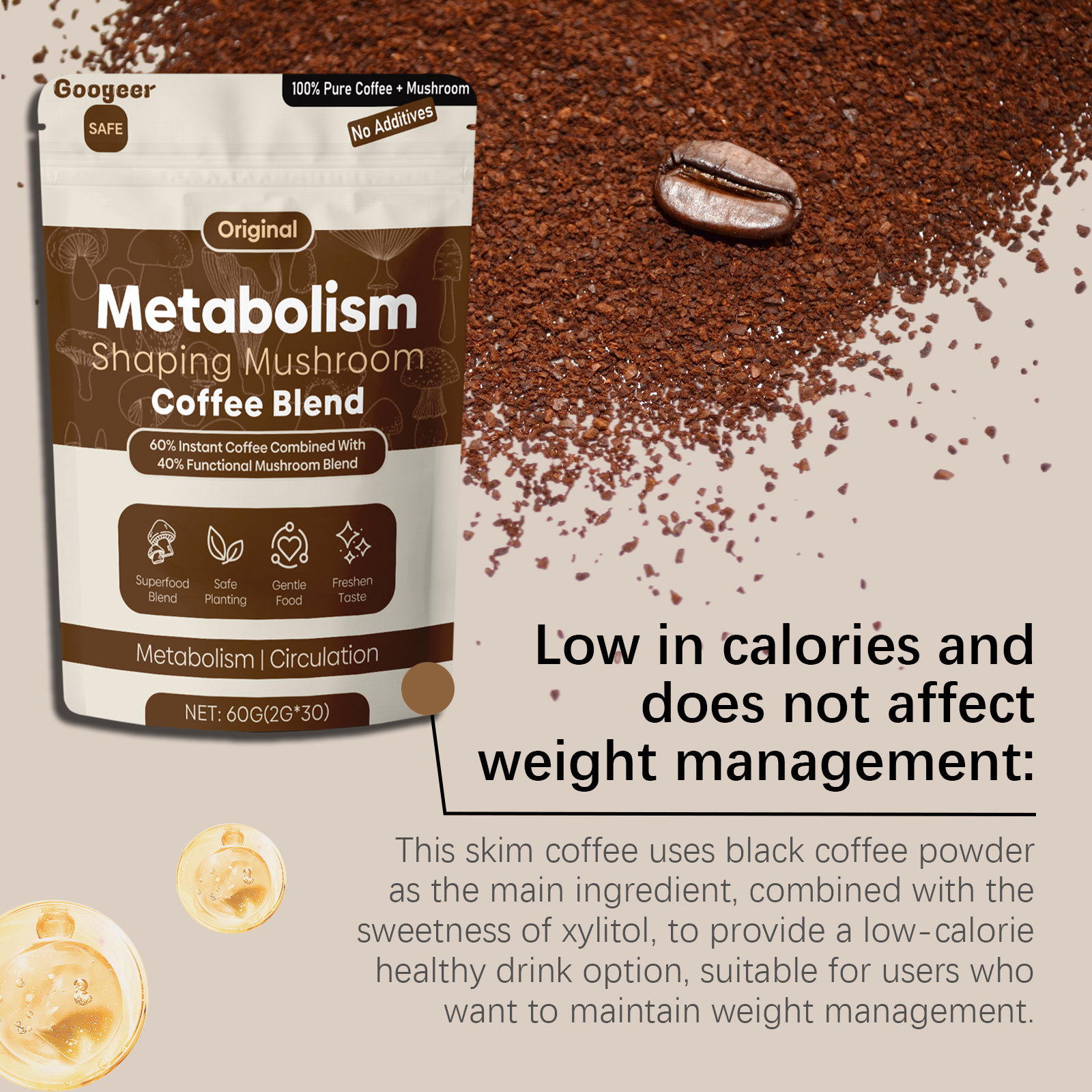 Our Metabolism Shaping mushroom coffee blend contains black coffee powder, xylitol. It can help speed up the body's metabolism, promote the removal of impurities from the system, and help the body clean out internal impurities more effectively and maintain a healthy balance. Its use is simple: pour the ground coffee into a cup and then add hot water at around 90°C. Stir well and serve. Xylitol not only provides sweetness, but also helps maintain a healthy environment, reducing the burden of sugar intake on the body and helping the body process impurities more smoothly.