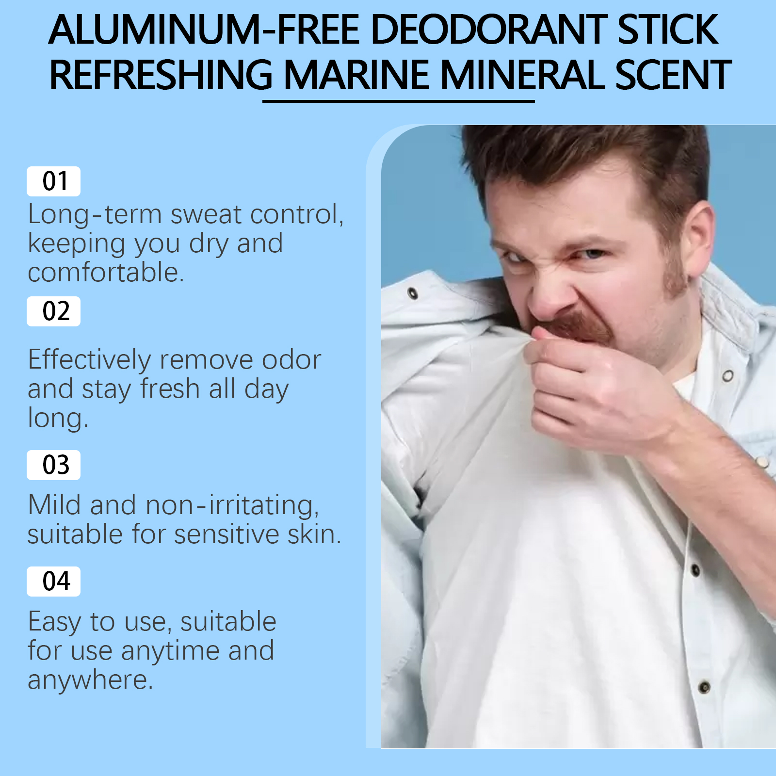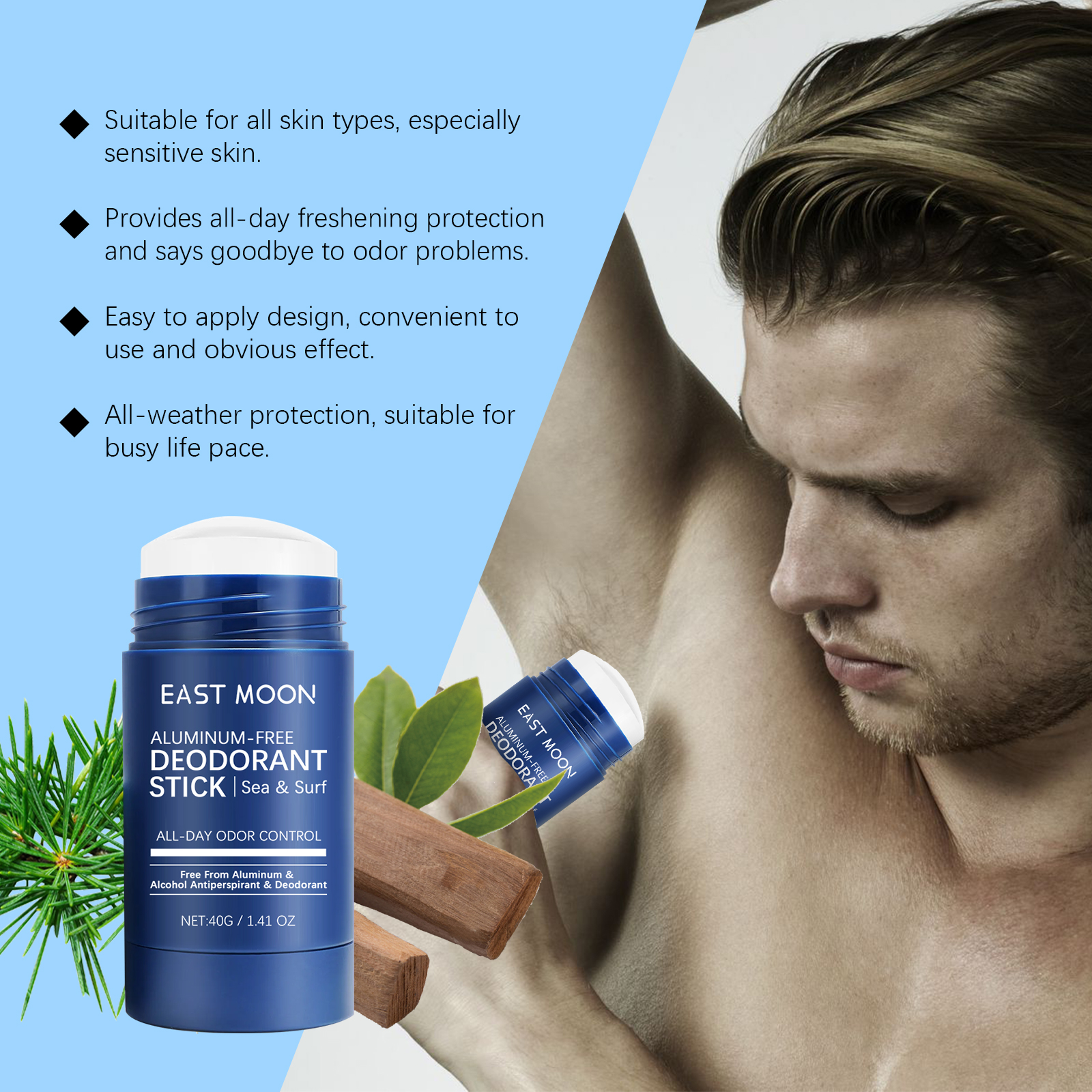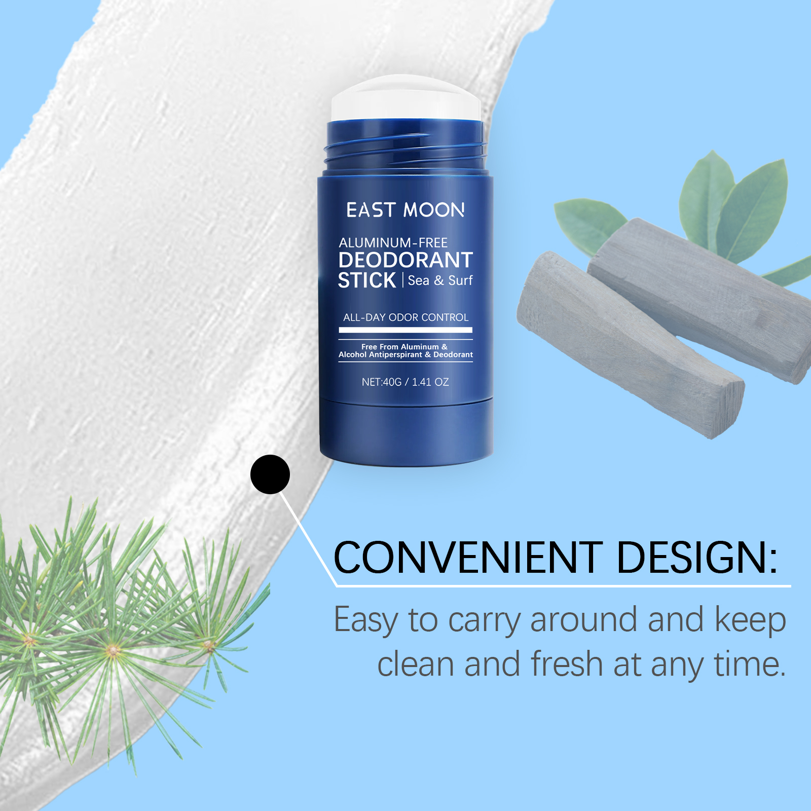 Our mineral Underarm fragrance bars contain musk extract, palmitic acid. It can effectively neutralize body odor and keep it fresh throughout the day. Its application is simple: clean your armpit skin, keep it dry, and apply the deodorant stick evenly to your armpit, covering the entire armpit area. And mild and non-irritating, suitable for sensitive skin.