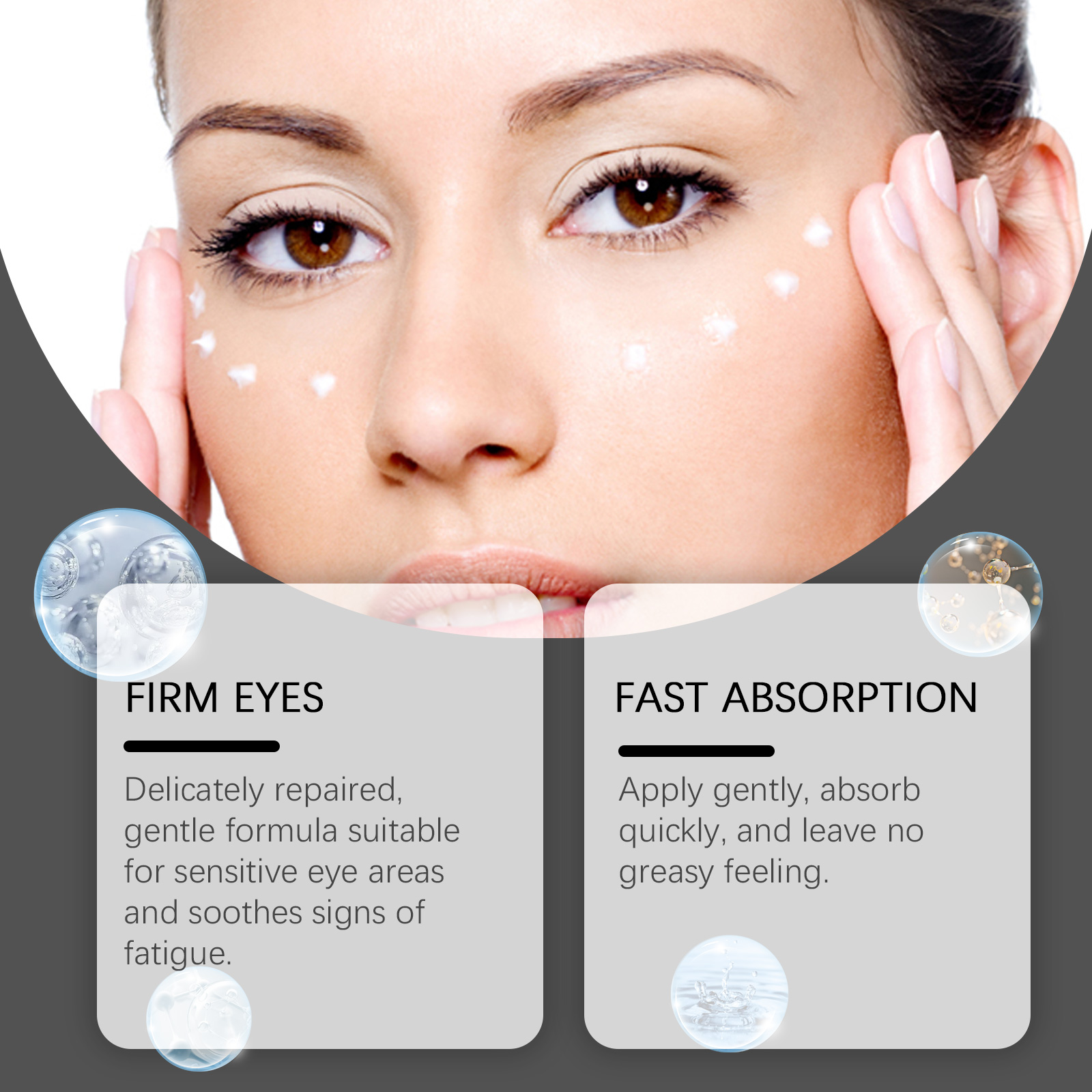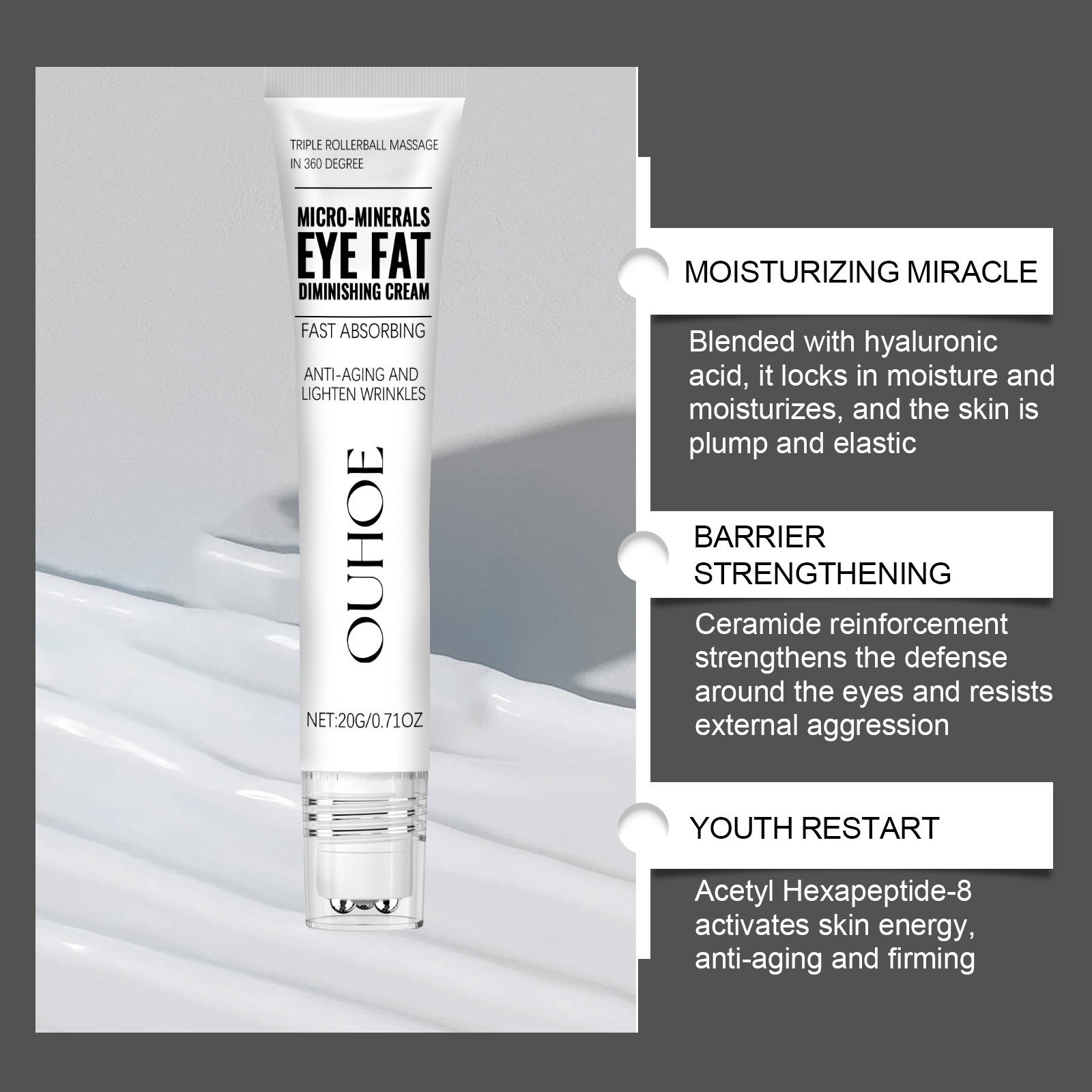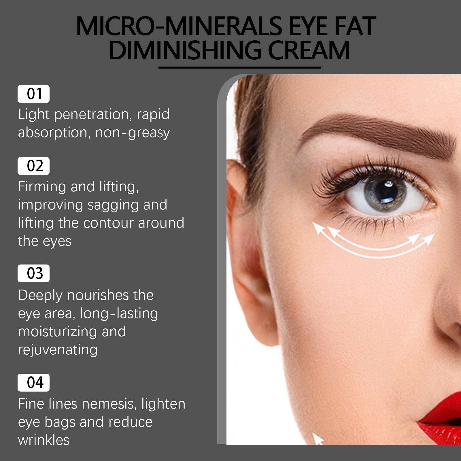 Our Micro-Minerals Eye Fat Diminishing Cream contains Hyaluronic Acid, Ceramide 1, Acetyl Hexapeptide-8. It can tighten and lift, improve sagging and lift eye contour, deeply nourish the eye area, lock moisture, moisturize, reduce bags under the eyes and reduce wrinkles. Its application method is very simple: clean and dry the skin around the eyes, apply appropriate amount of eye cream evenly on the skin around the eyes, gently massage until absorbed. It can moisturize for a long time, moisturize all day, reduce dry lines, keep skin soft and tender, and make skin silky and delicate and radiant every time you use it.