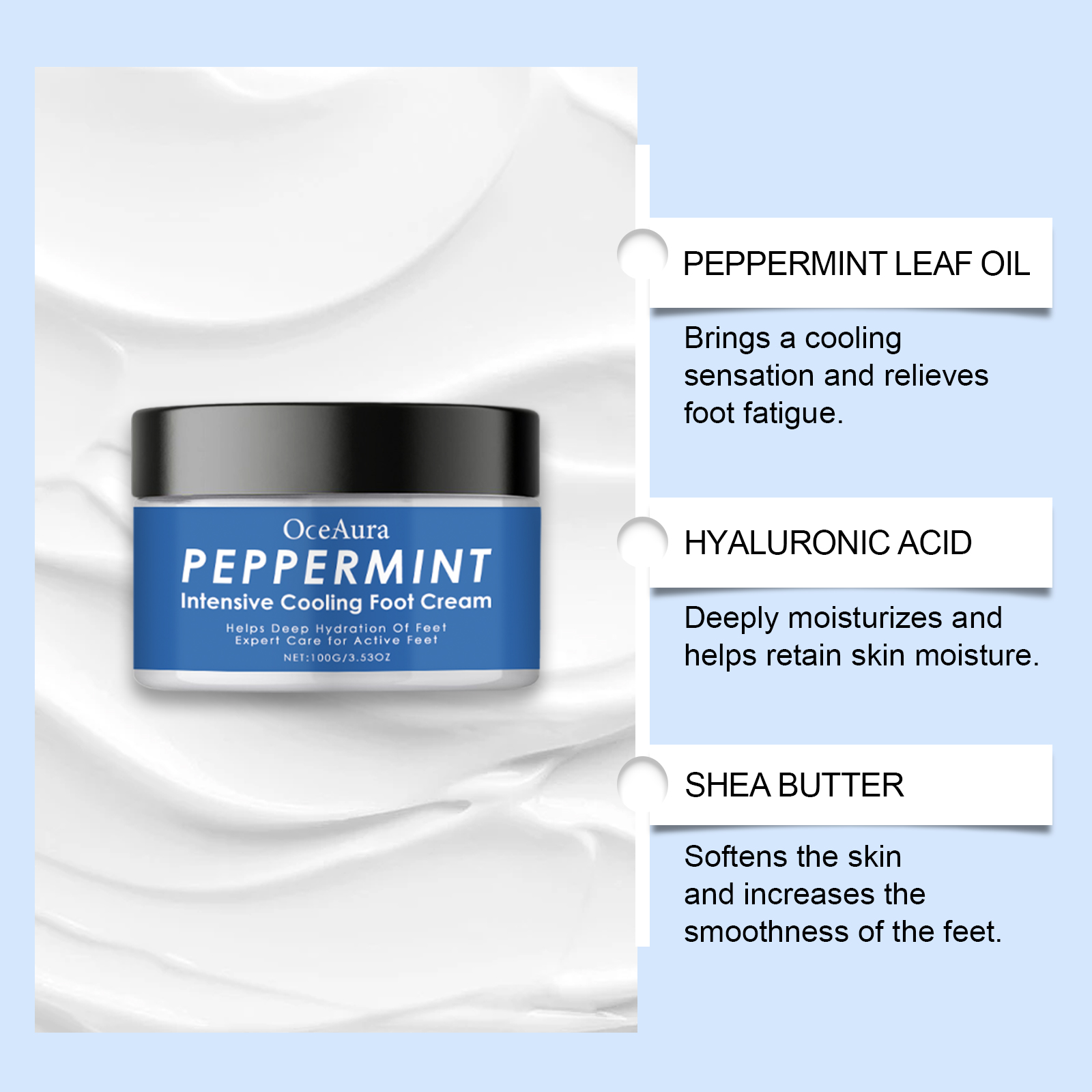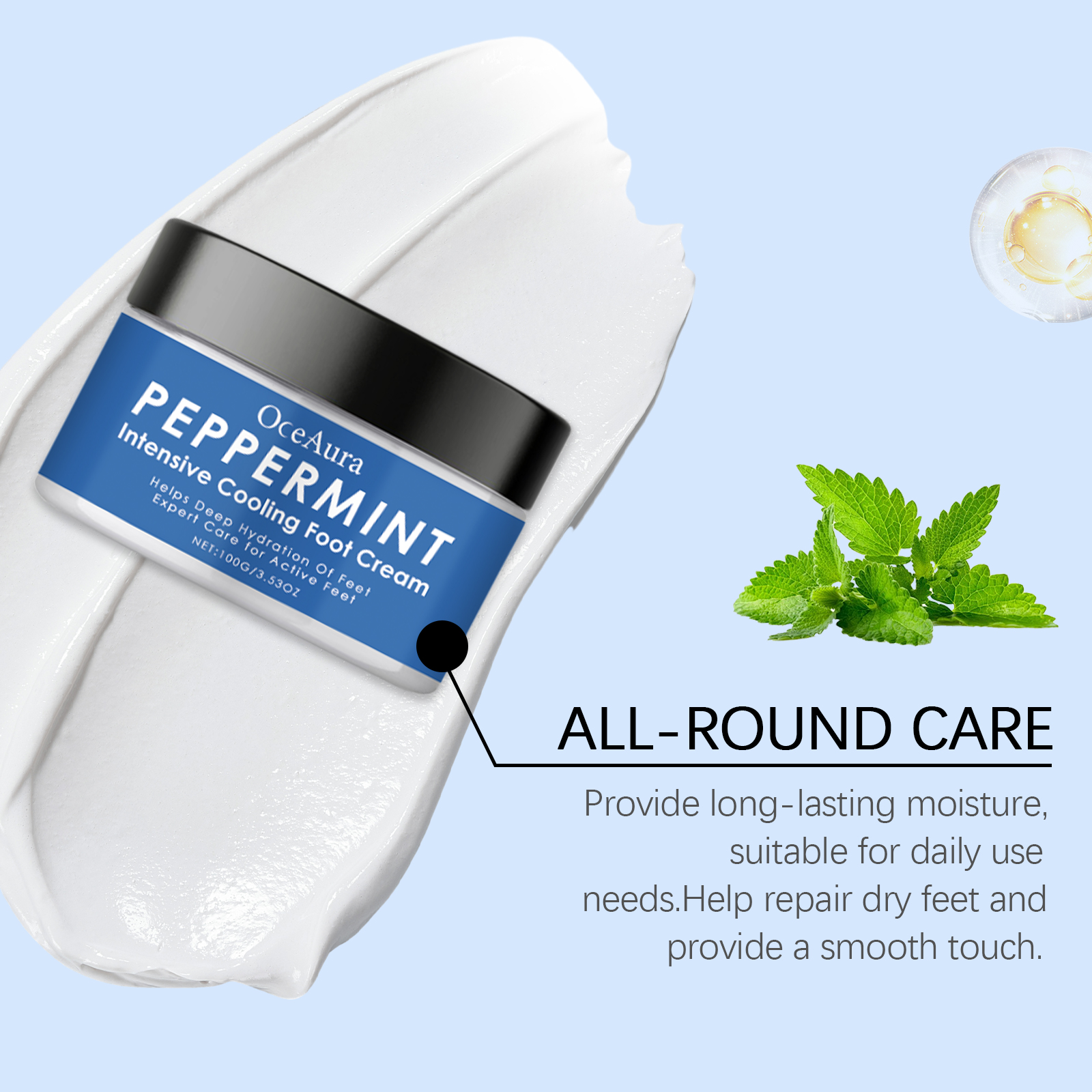 Our mint refreshing foot cream contains mint leaf oil and hyaluronic acid. It can bring a refreshing feeling and relieve tired feet. Provides deep moisturizing for feet and leaves skin soft. Its use is simple: clean your hands and feet and keep them dry. Take appropriate amount of this product and evenly apply to foot skin. Massage gently to promote absorption. And can soften dry heels, make the skin smooth. Provides comfortable foot care, suitable for frequent walkers.