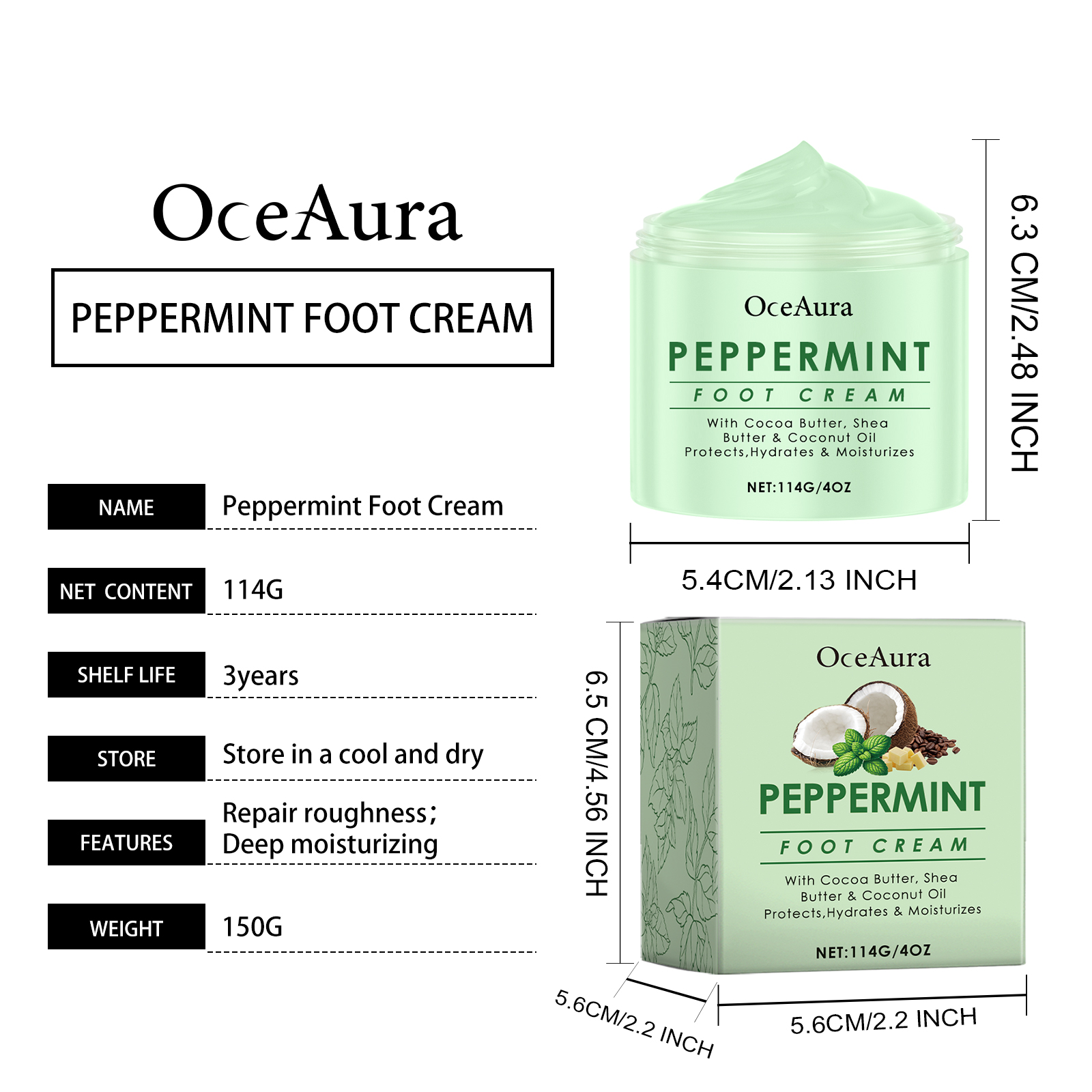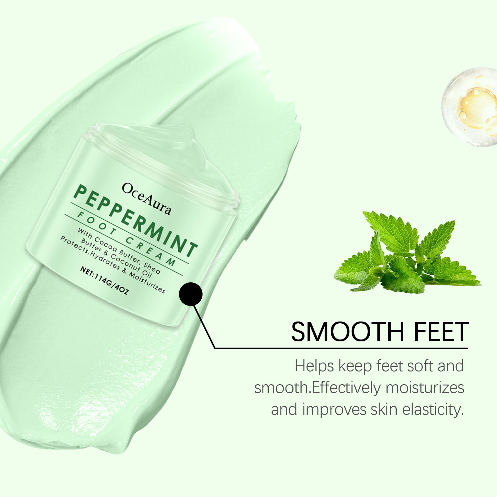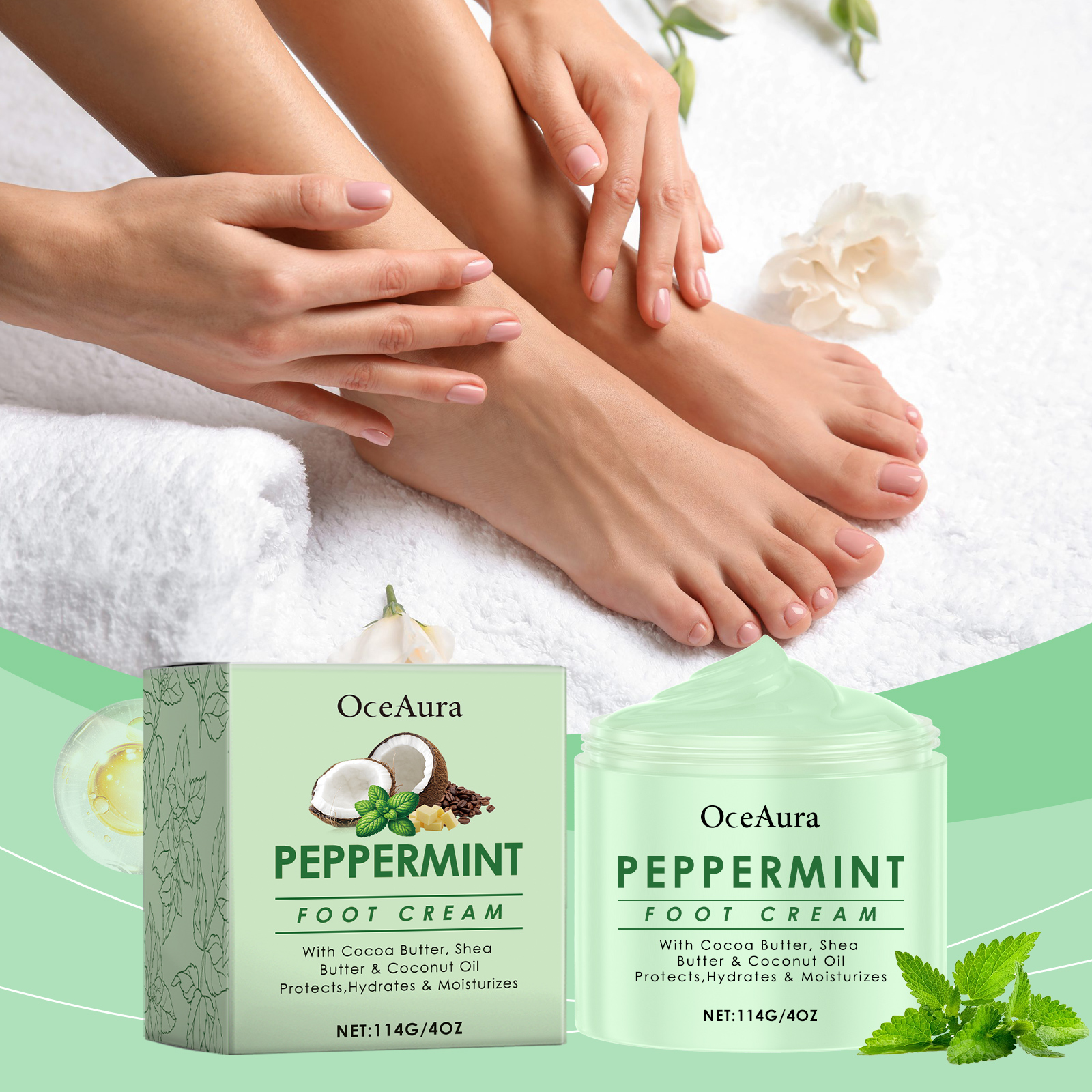 Our peppermint foot cream contains shea butter, coconut oil, vitamin E (tocopherol). It provides comfort and relieves tired feet. Its use is simple: clean your hands and feet and keep them dry. Apply appropriate amount of this product evenly on foot skin, gently massage to promote absorption. It also uses a mild formula to provide deep moisture for the foot skin.