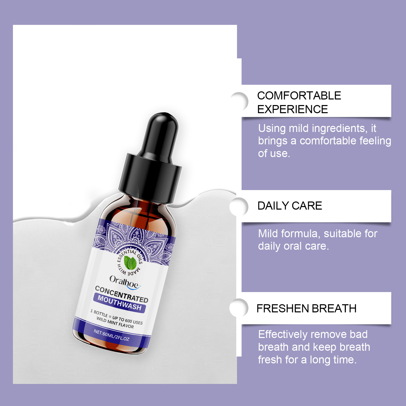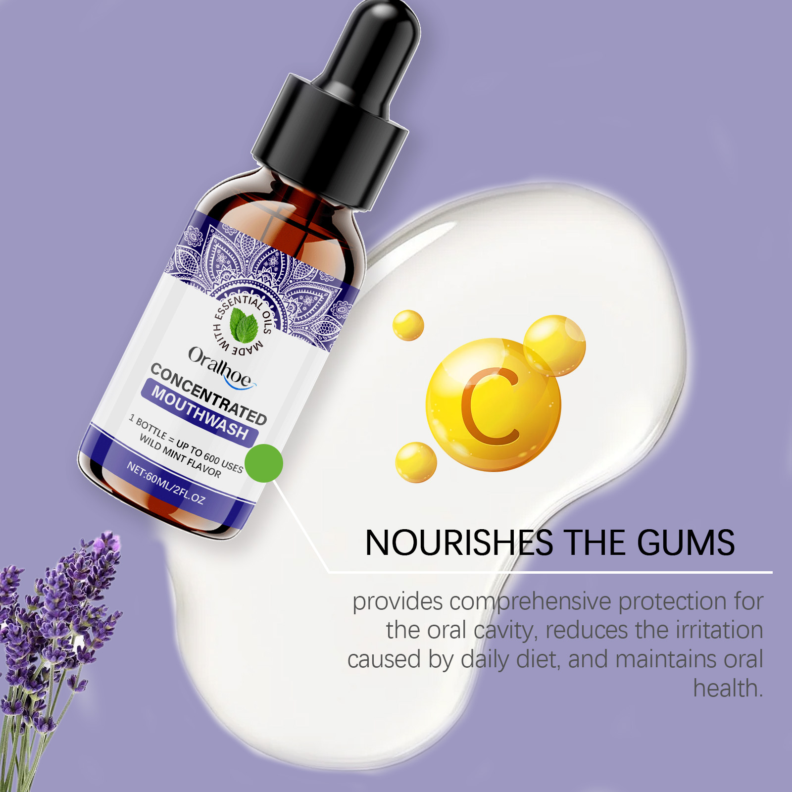 Our Peppermint mouthwash contains lavender oil, peppermint extract, aloe vera extract. It can effectively remove bad breath and keep your breath fresh for a long time. Deep clean the mouth to restore oral hygiene. Its use method is very simple: take 4-6 drops of this product into 15ml water, gargle for 1 minute, and spit it out after gargling. Provide a lasting breath of fresh air and make every communication more confident.