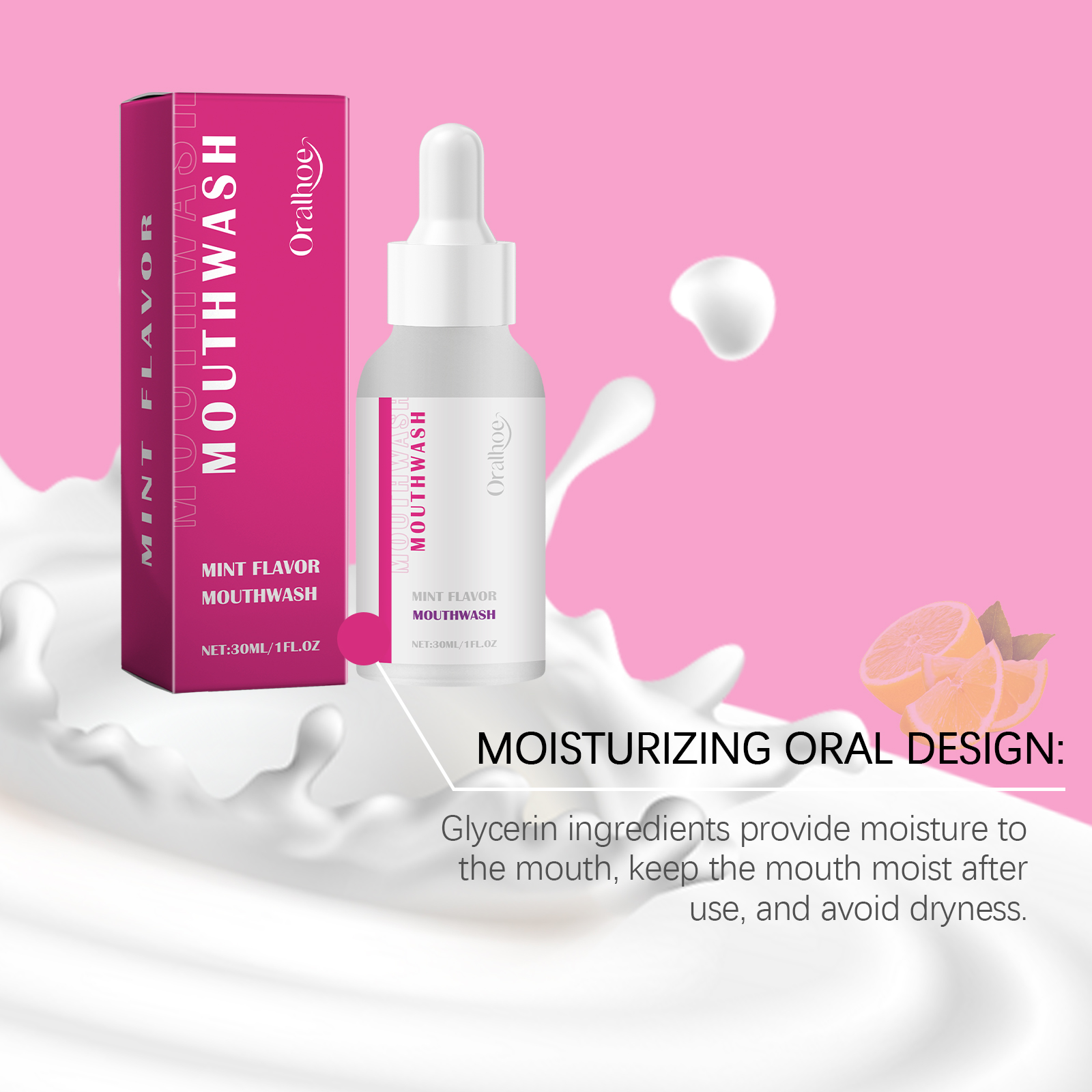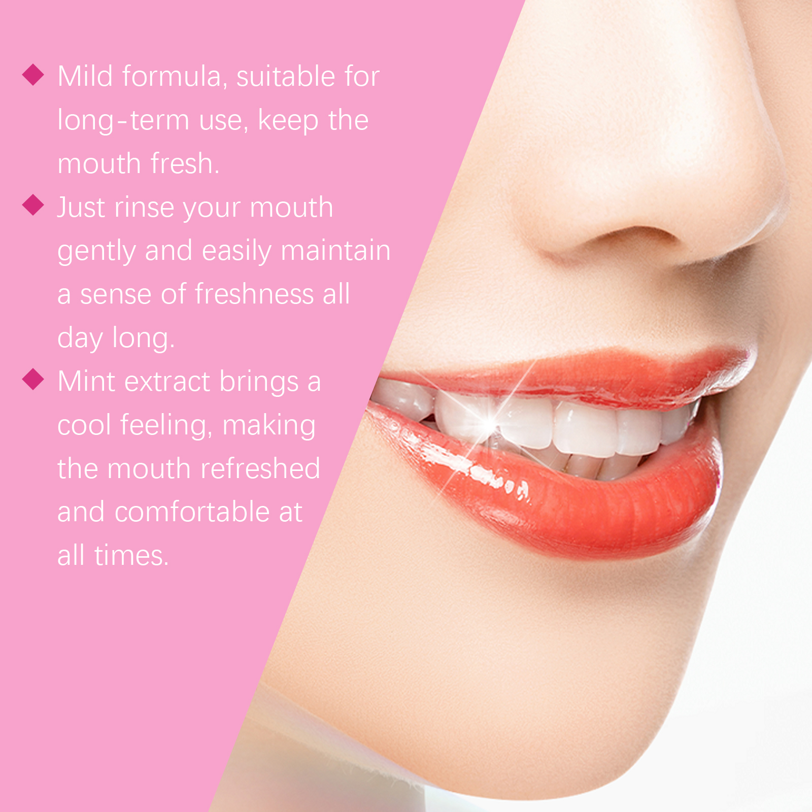 Our peppermint mouthwash contains glycerin and sorbitol. It can whiten teeth and significantly improve the shine of teeth. Its use method is very simple: take the right amount of this product; Add to toothpaste; Brush your teeth gently for 3 minutes with the correct brushing method; Rinse mouth thoroughly with water. And suitable for sensitive teeth, reduce sensitivity and discomfort.