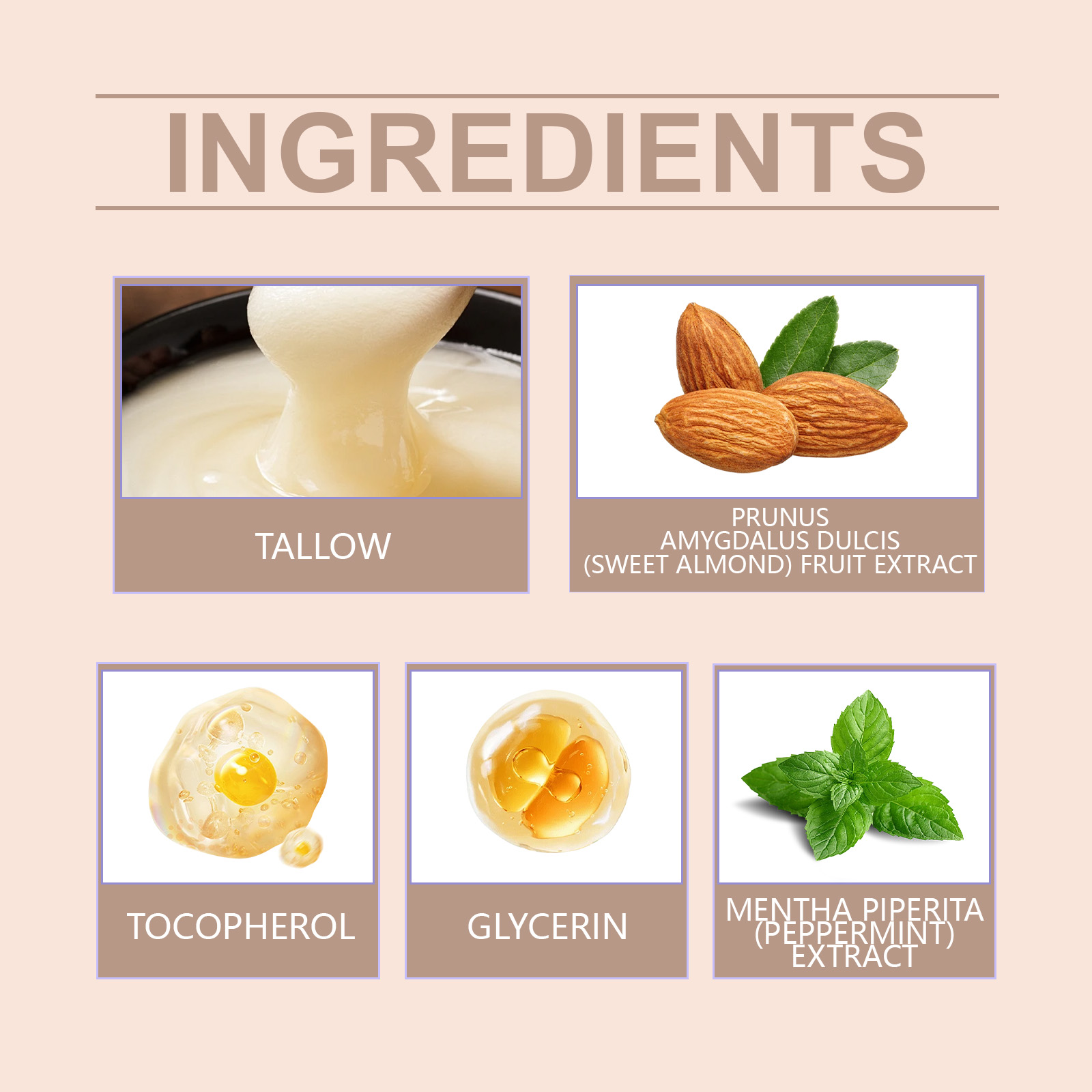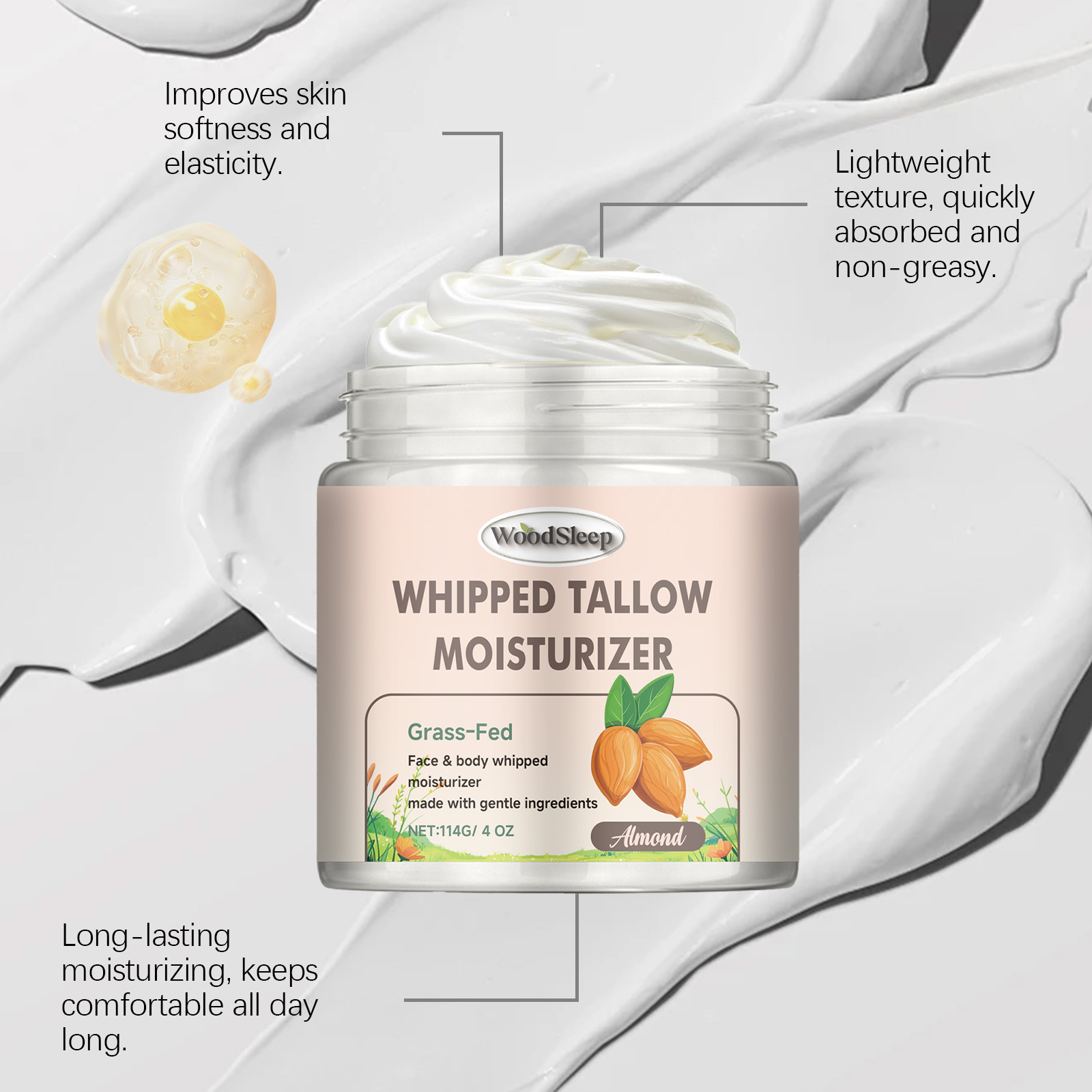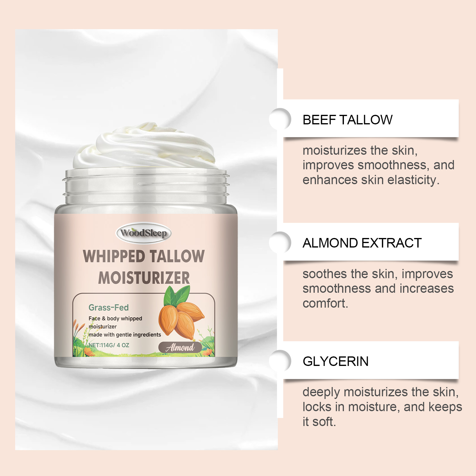 Our almond tallow moisturizer contains glycerin, tallow, almond extract. It can moisturize the skin, improve skin smoothness and enhance skin elasticity. Soothe skin, improve skin smoothness and increase skin comfort. Deep moisturizes skin, locks in moisture and keeps skin soft. Its application method is simple: 1. Clean the skin and keep it dry; 2. Apply appropriate amount of this product evenly on face and whole body skin. 3. Gently massage until absorbed. Deeply moisturizes skin, soothes dry skin and makes skin smoother. The skin is softer and smoother, and the overall feeling of health improves.