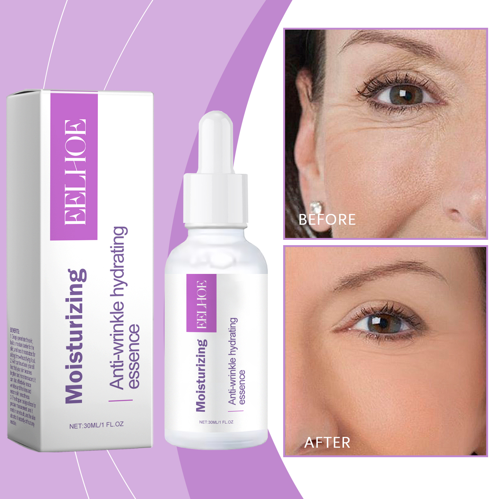Our moisturizing anti-wrinkle hydrating essence contains hyaluronic acid and vitamin C. It can continue to replenish moisture, fully hydrates the skin, and rejuvenates. The way to use it is simple: clean your face. Gently squeeze the serum with an eyedropper. Then apply to face skin and gently massage in circular motion with fingertips until fully absorbed. And can lighten the skin, rejuvenate, even skin tone.