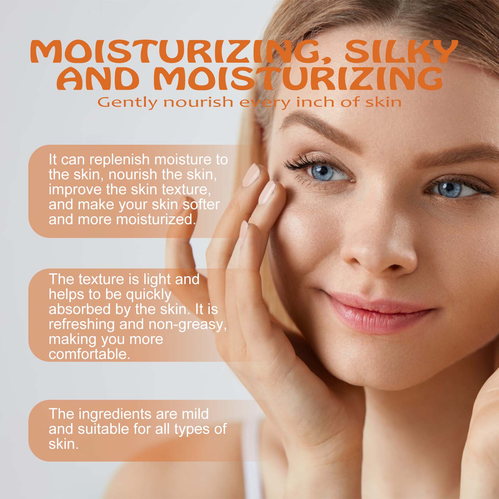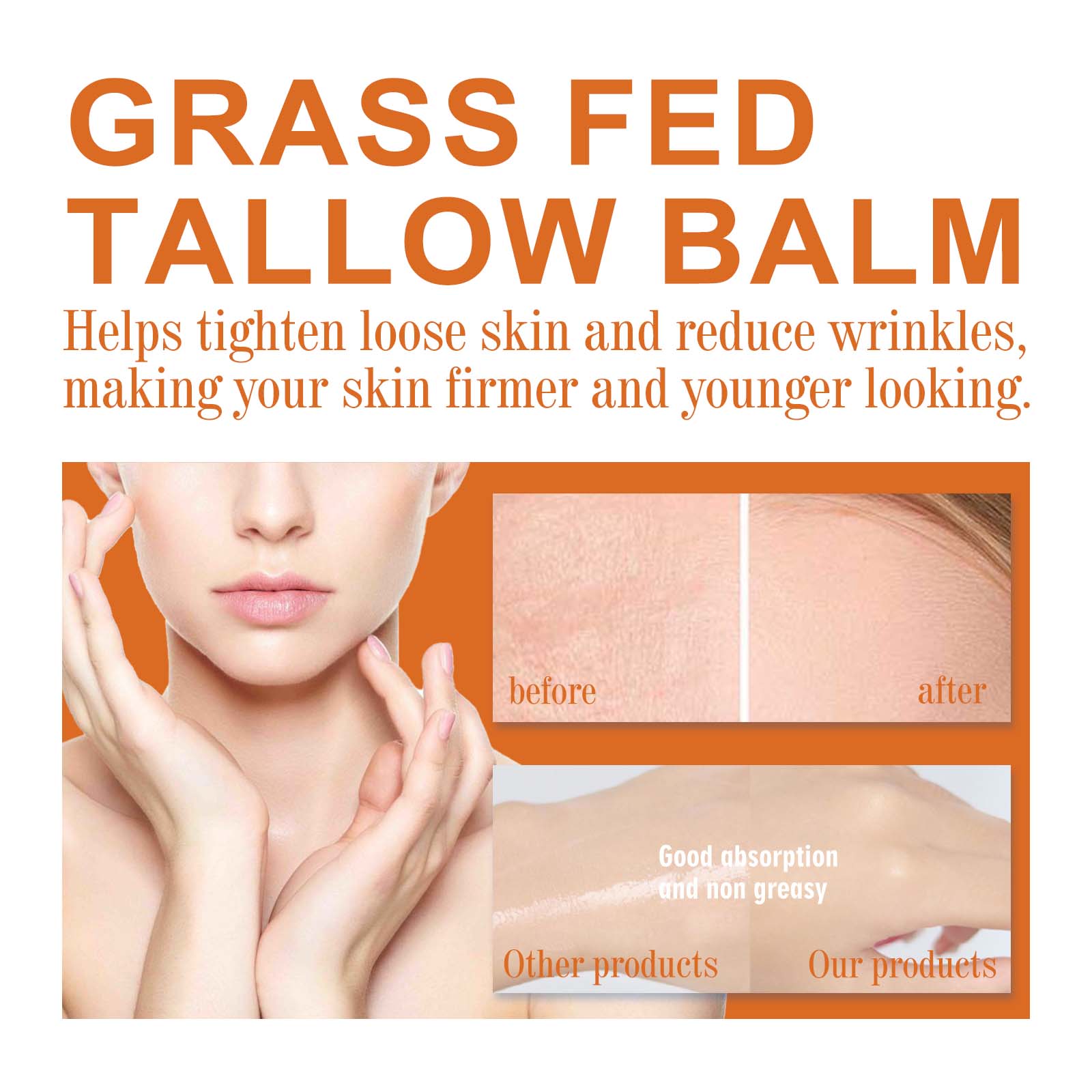 Our moisturizing cream contains tallow, honey and vitamin E. It can replenish skin moisture, nourish skin, improve skin texture, and make skin softer and more moisturized. The light texture helps the skin to absorb quickly. Refreshing and not greasy, makes you more comfortable. The ingredients are mild and suitable for all skin types. Its application method is simple: 1. Clean the skin and keep it dry; 2. Apply appropriate amount of the product evenly on the skin; 3. Gently massage until completely absorbed. Moisturizing moisturizer helps to tighten loose skin, reduce wrinkles, and make your skin firmer and look younger.