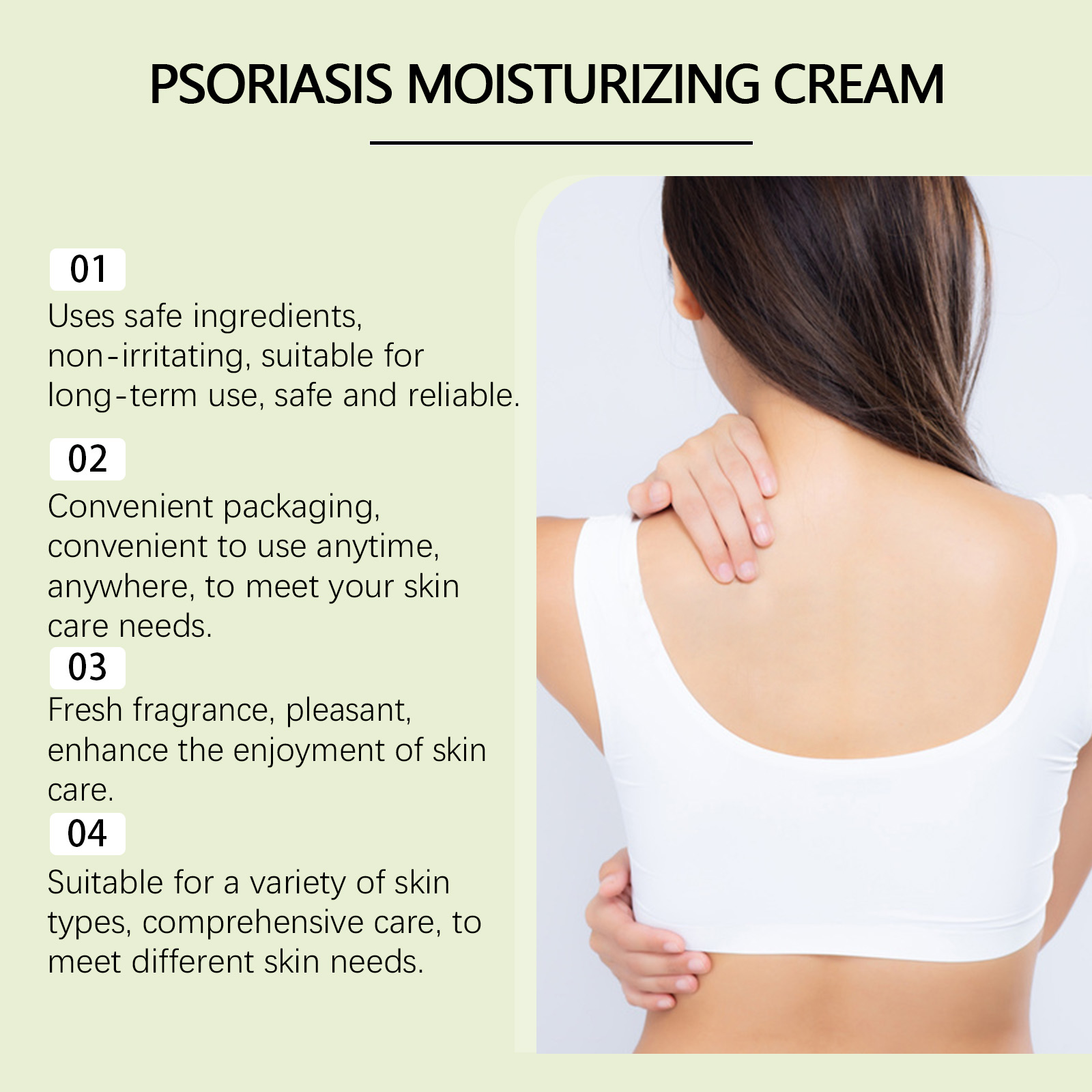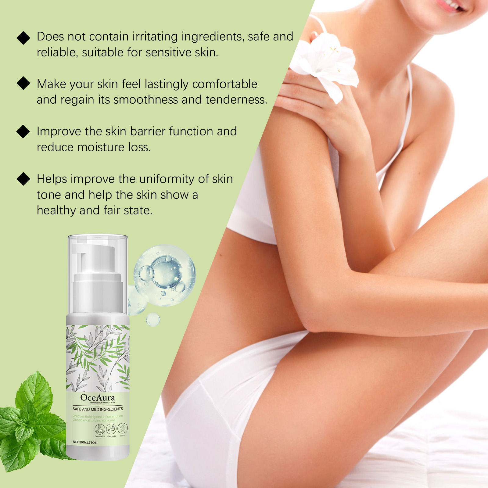 Our moisturizing body lotion contains glycerin and allantoin. It provides long-lasting moisture and reduces dry texture. Allantoin helps relieve skin discomfort and soothe sensitive areas. The way to use it is simple: clean the skin and keep it dry, apply an appropriate amount of this product to the body skin. Massage gently until absorbed. It can quickly relieve discomfort and restore calm and comfort to your skin.